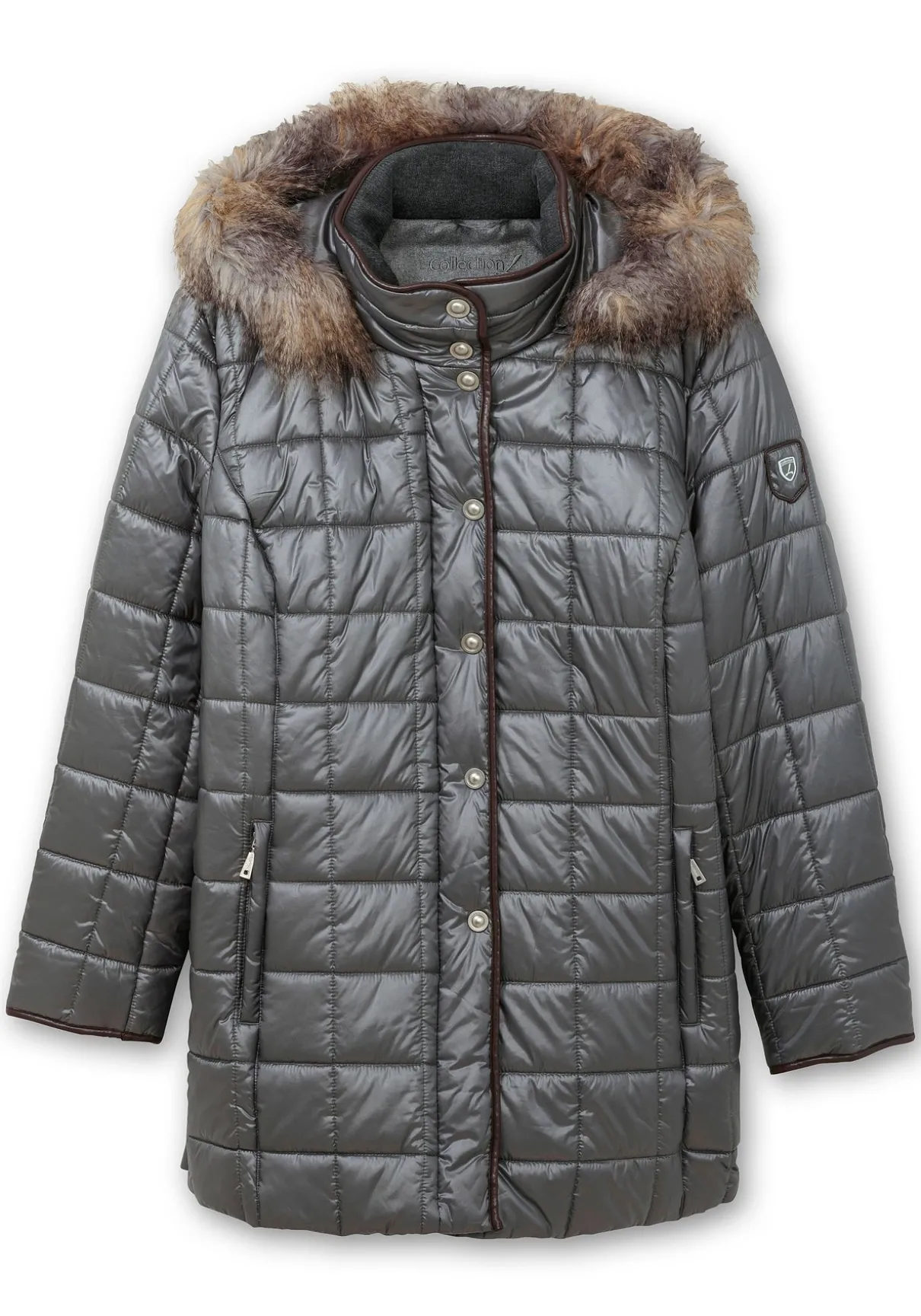 Mit leichtem Glanz und elegantem Kunstfellkragen ist die Steppjacke ein perfekter Mix aus feminin und praktisch. Die Kapuze wird mit einem Reißverschluss an der Jacke befestigt, der Kunstfellkragen kann abgeknöpft werden. Die markante Steppung wird durch dekorative Kunstlederpaspeln ergänzt. Zu schließen ist die Jacke mit Reißverschluss und Druckknopfleiste. Besonders praktisch sind die mit Reißverschlüssen gearbeiteten Seitenschlitze, die in der Länge variiert werden können und so für mehr Bewegungsfreiheit rund um die Hüftpartie sorgen. Wiener Nähte vorn und hinten formen die Figur, zwei Reißverschlusstaschen und eine Innentasche ergänzen den Look.