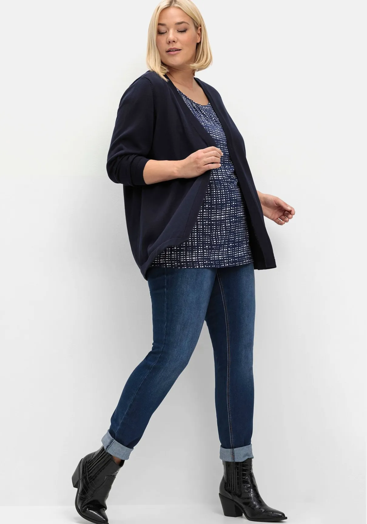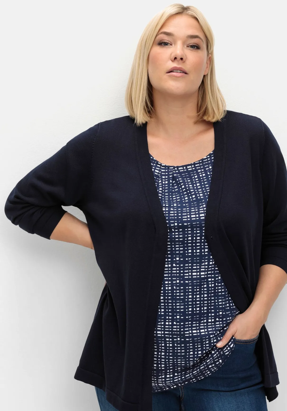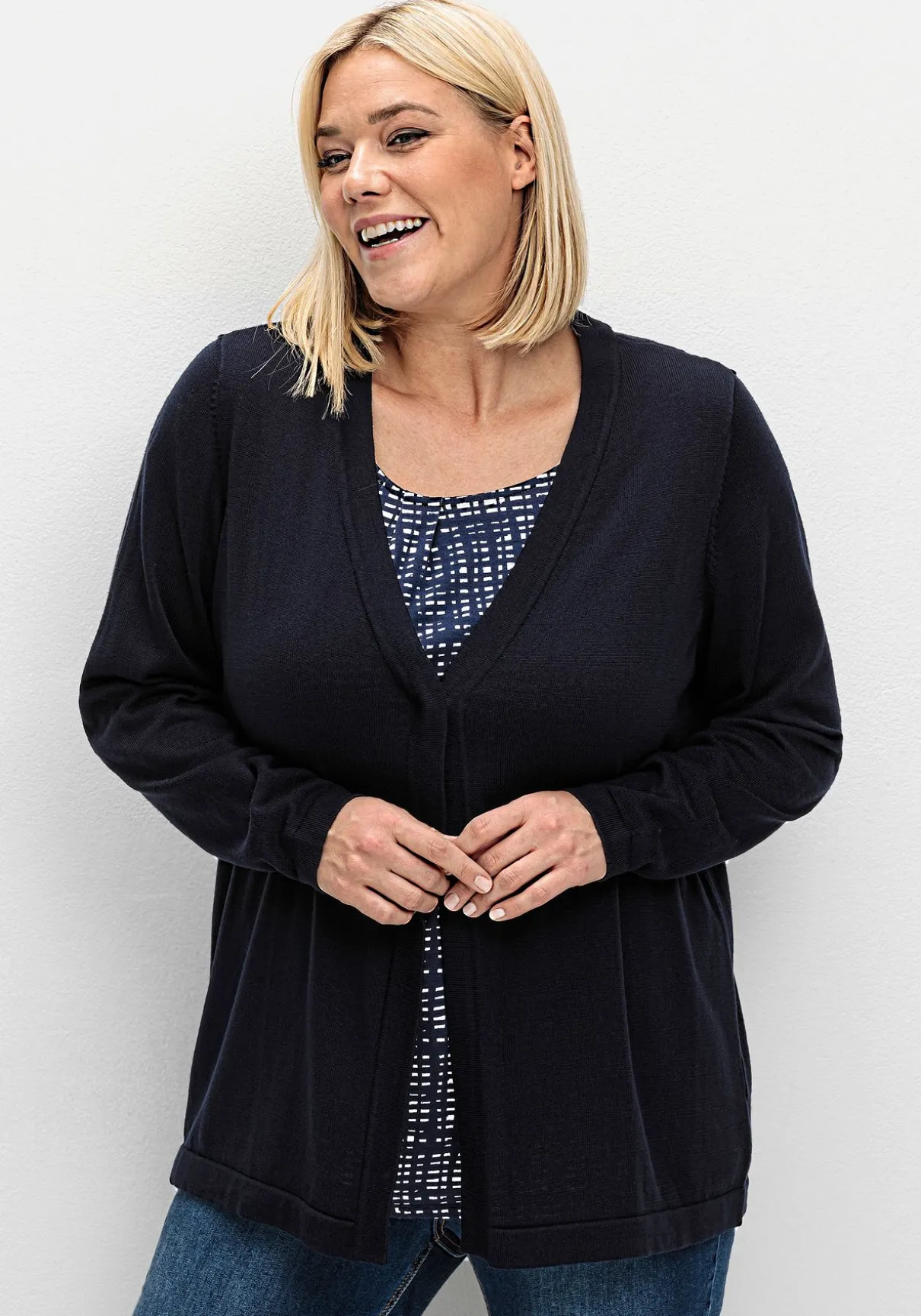 Strickjacke in feiner, leichter Qualität. Der zeitlose Style ist mit V-Ausschnitt und langen Ärmeln gearbeitet. Die Jacke ist oben mit einem Knopf zu schließen und erhält so einen besonders lockeren, luftigen Fall. Gepflegtes Finish ist die Blende an allen Abschlüssen.