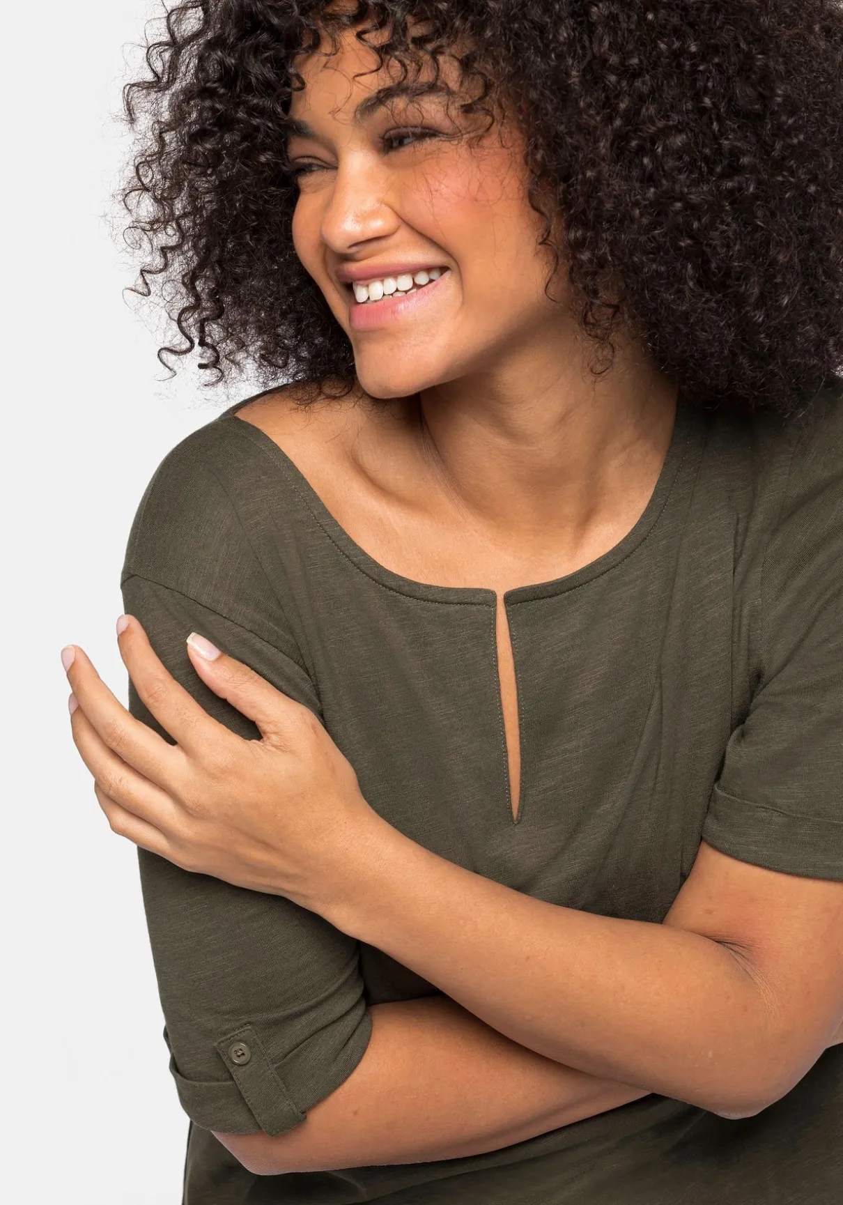 Shirt in langer, weiter Form. Für eine feminine Note sorgt der vorn geschlitzte Rundhalsausschnitt, die länger geschnittenen Ärmel werden durch Zierriegel dekoriert. Am geraden Saum befinden sich Seitenschlitze.