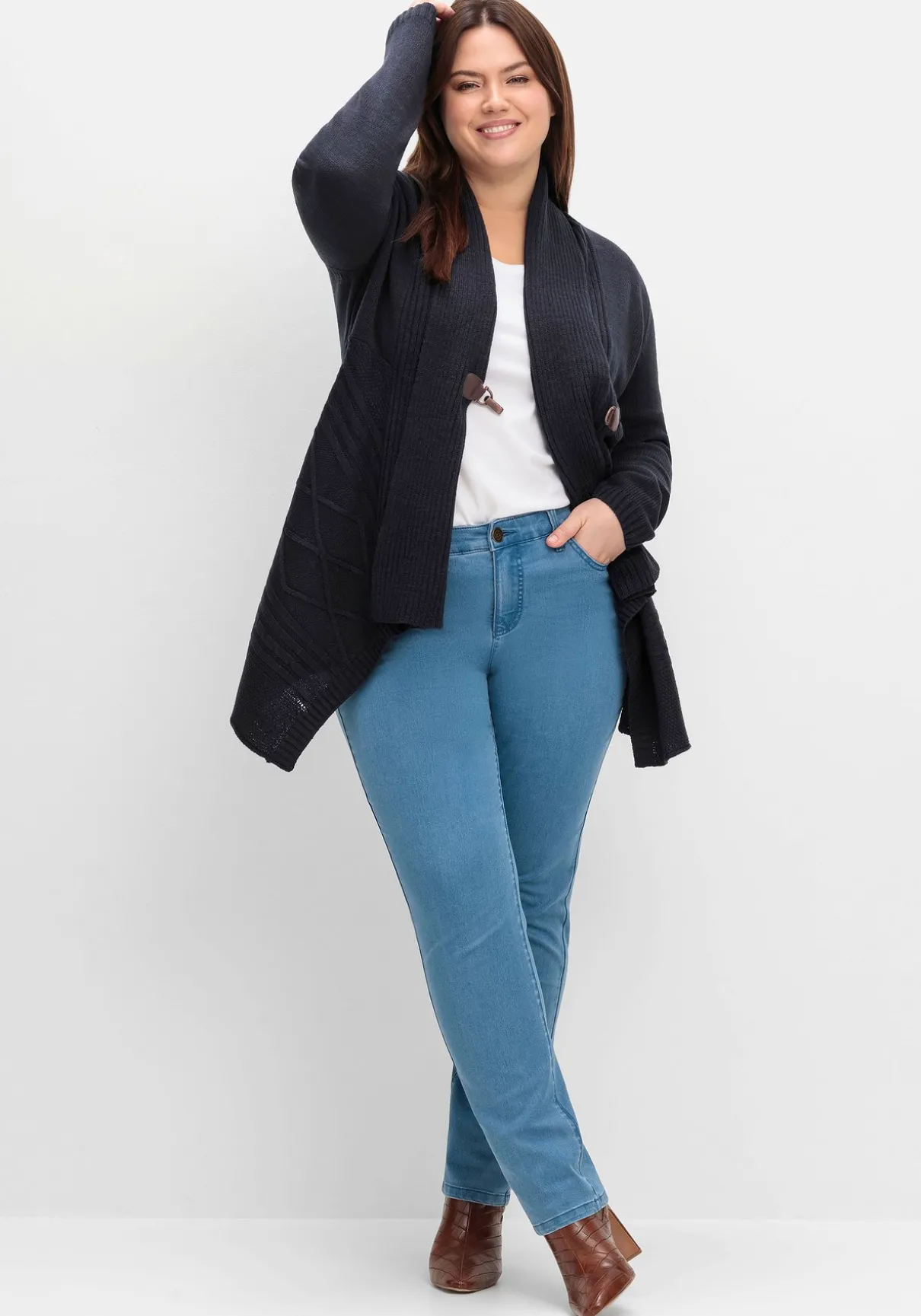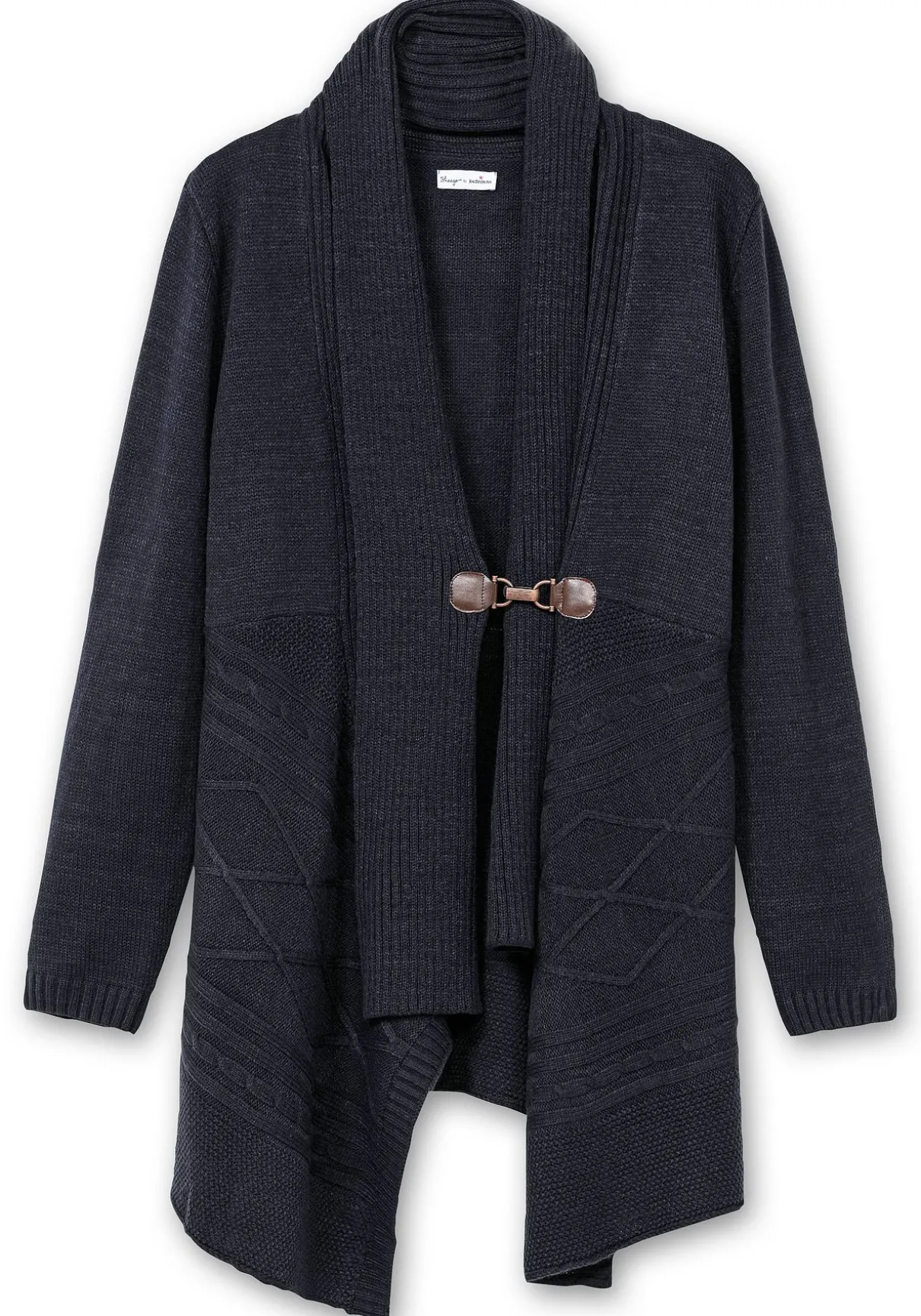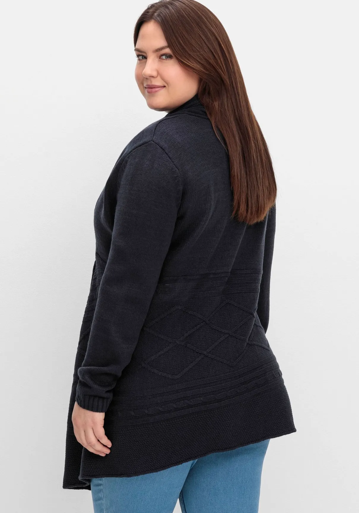 Strickjacke in Longform von sheego by Joe Browns. Der offene Fit wird lediglich mit einer Metallschließe zusammengehalten, die Patches in Lederoptik dienen als dekoratives Detail. Der breite, gerippte Schalkragen wirkt optisch streckend, der zipfelig geschnittene Saum lässt die Jacke locker über die Silhouette fallen. Für modische Spannung sorgt die Kombination aus Glattstrick, Zopfmuster und Rauten-Elementen. Ärmelabschluss und Saum enden mit Rippbündchen.