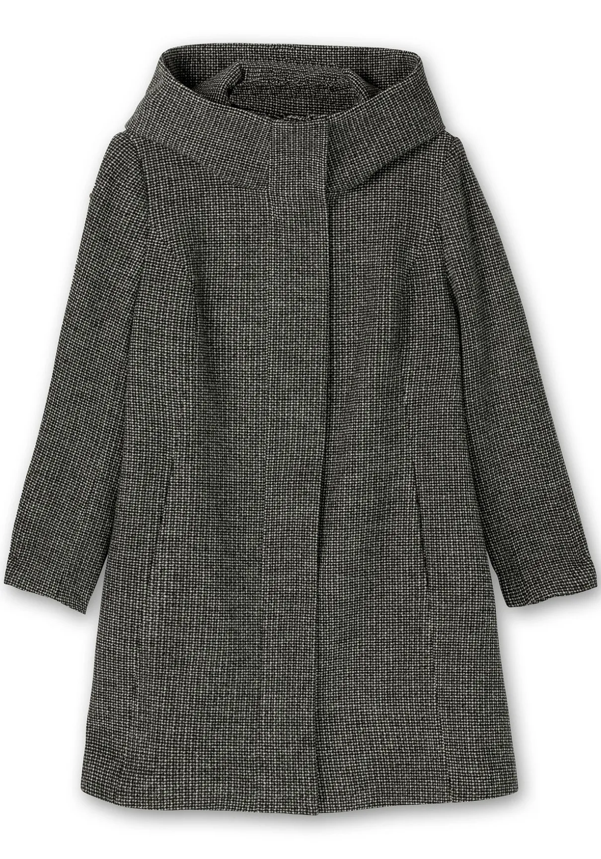 Kurzmantel mit Wollanteil. Charakteristisch sind hier die melierte Oberfläche sowie die große Kapuze. Weitere Details wie der Stehkragen, der verdeckte Reißverschluss mit Druckknopfleiste sowie die Eingrifftaschen in der Teilungsnaht machen ihn zum gepflegten Begleiter durch die kältere Jahreszeit. Wichtige Utensilien finden Platz in der kleinen Innentasche.