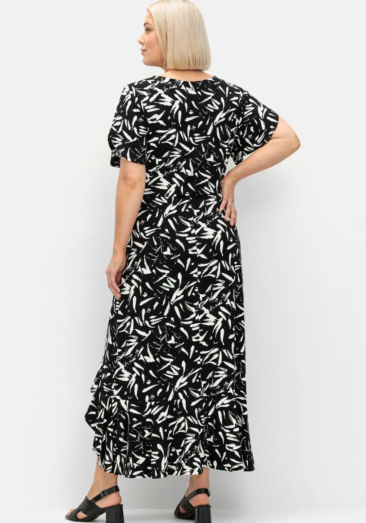 Maxikleid mit Blätterprint. In Wickeloptik, mit streckendem V-Ausschnitt und einem weit schwingenden, hoch geschlitzten Rock wirkt das Kleid feminin und raffiniert. Die leicht gekräuselte Teilungsnaht betont schmeichelnd die Taille, die weiten, geschlitzten Flügelärmel sitzen luftig und bequem. Der Volant am Rocksaum rundet den sommerlichen Style perfekt ab.