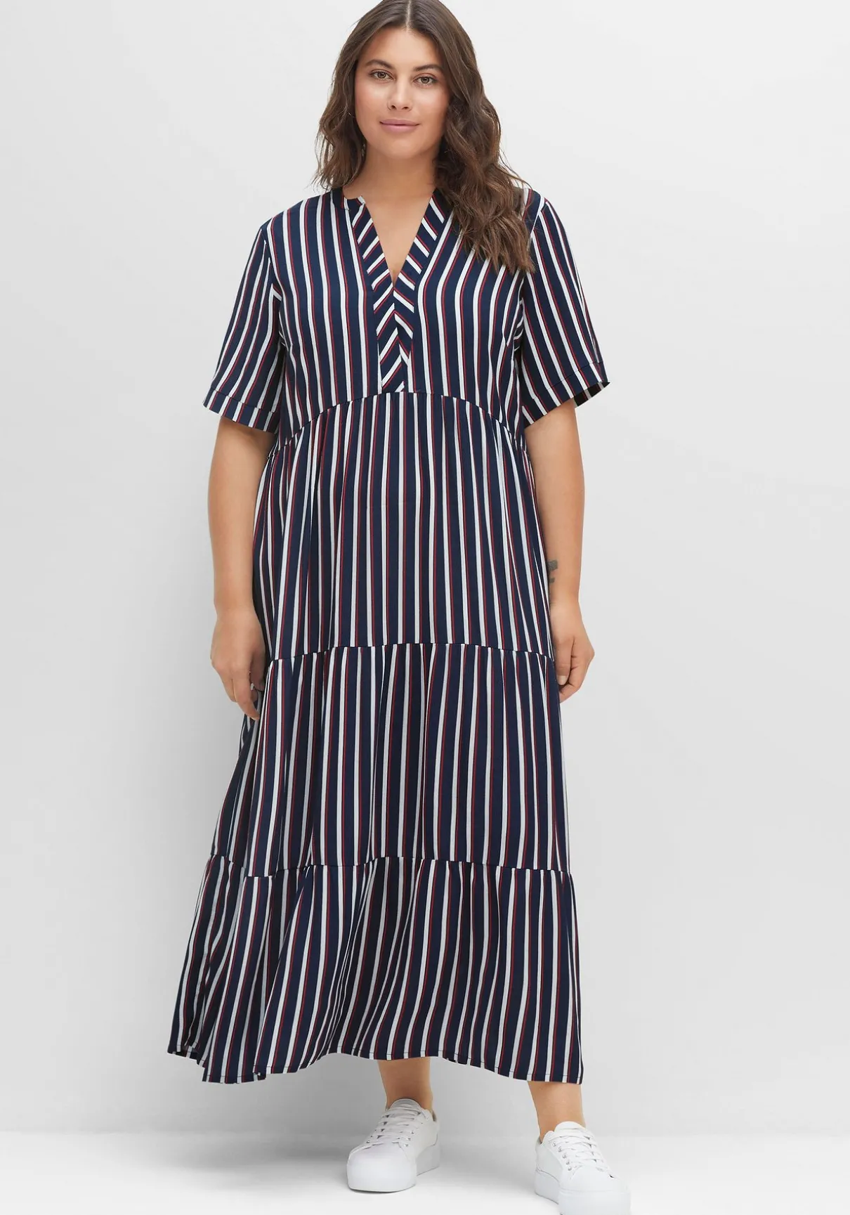 Maxikleid in Knöchellänge. Die Längsstreifen strecken optisch die Silhouette. Das zweifarbige Streifendessin und die entgegengesetzte Linienführung an den kurzen Ärmeln sowie am Ausschnitt brechen den Look modisch auf. Dank des stufigen Volants schwingt der Rock mit jedem Schritt schön mit.
