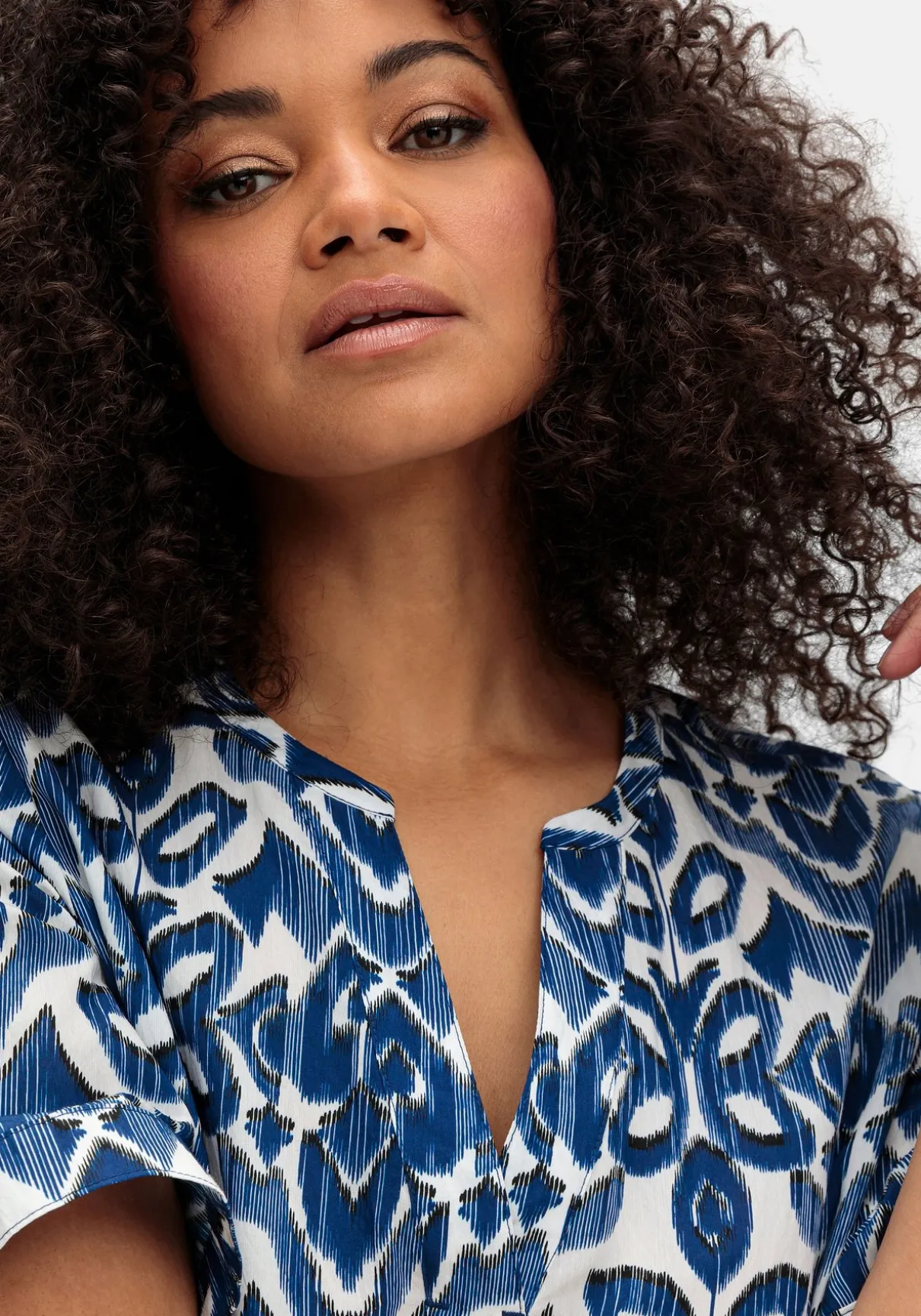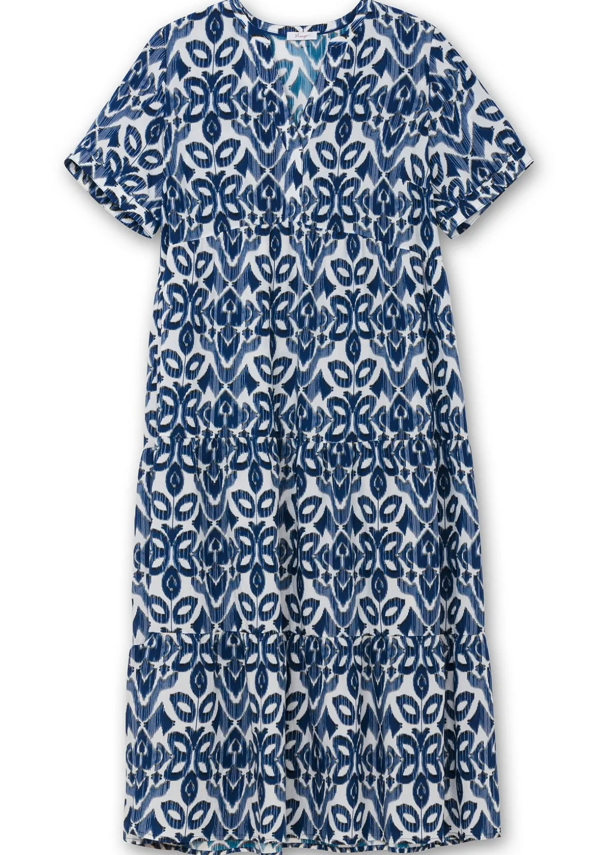 Kleid mit gestuftem Rock. Nicht nur der dekorative Ornament-Druck sorgt für Urlaubsstimmung, auch die weich fließende Qualität und der luftige Schnitt machen das Kleid zum idealen Begleiter durch die sonnigen Tage. Es hat einen streckenden V-Ausschnitt und kurze Ärmel, die eingearbeiteten Stufen lassen den langen Rock schön weit schwingen.