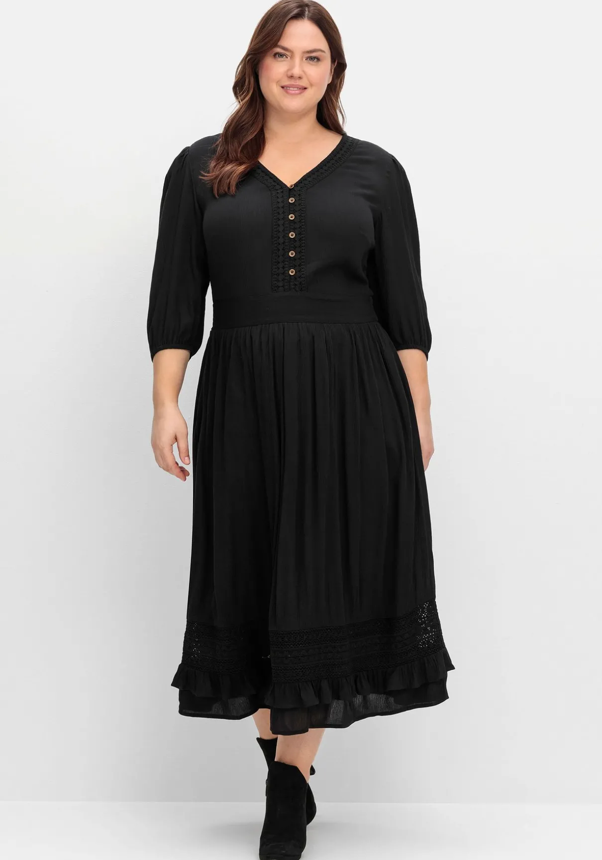 Maxikleid in Crinkle-Qualität, von sheego by Joe Browns. Die Spitze entlang V-Ausschnitt und Knopfleiste, die 3/4-Ärmel mit Gummizugbündchen sowie der weit schwingende Rock mit Volant und Spitze verleihen dem Kleid seine romantische, feminine Optik. Dekorative Knöpfe in Metalloptik fallen ins Auge, das breite Taillenband formt schmeichelnd die Figur. Für mehr Tragekomfort ist das Band im Rücken elastisch gearbeitet, ein nahtfeiner seitlicher Reißverschluss erleichtert das An- und Ausziehen.