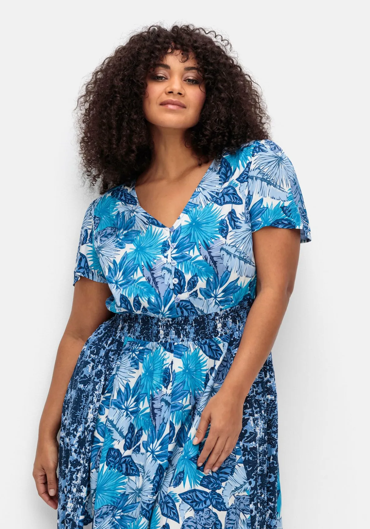 Midikleid von sheego by Joe Browns. Die beiden unterschiedlichen floralen Prints machen das Kleid zum Blickfang, gleichzeitig hat der geschickt gesetzte Mustermix eine figurschmeichelnde Wirkung. Auch der weite V-Ausschnitt streckt optisch den Oberkörper, daran schließt sich eine kurze Knopfleiste an. Die leicht geraffte vorverlegte Schulternaht sowie die Rückenpasse geben dem Fit einen guten Sitz. Auch der Smokbund in der Taille ist dezent gekräuselt. Luftige Flügelärmel sowie ein weit schwingender Rock unterstreichen den femininen Auftritt.