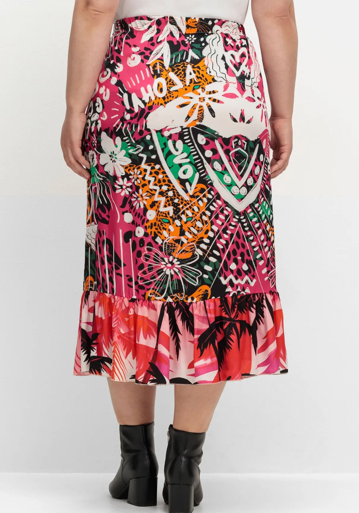 Midirock von sheego loves miss goodlife, mit Volant am Saum. Der gekonnte Mix aus Ethno- und Karibikprint wird durch Wordingprints charmant aufgelockert. Durch den elastischen Formbund sitzt der Rock bequem, seitliche Eingrifftaschen sind eine praktische Ergänzung.