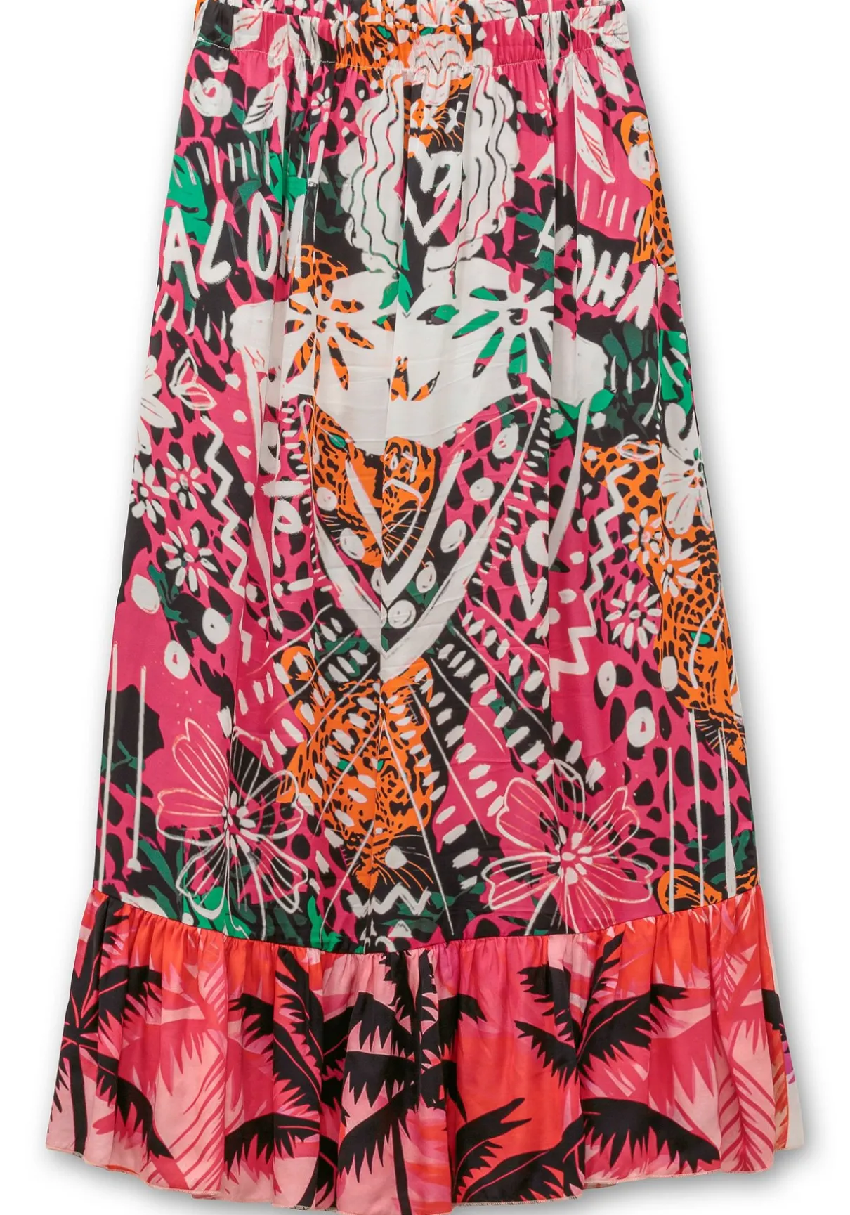 Der luftige Schnitt zeigt sich in wadenumspielender Länge. Durch die leicht ausgestellte Form mit breitem Rüschenabschluss erhält der Rock femininen Schwung.