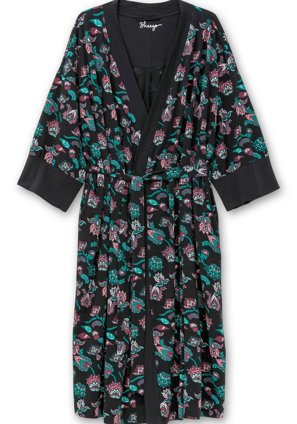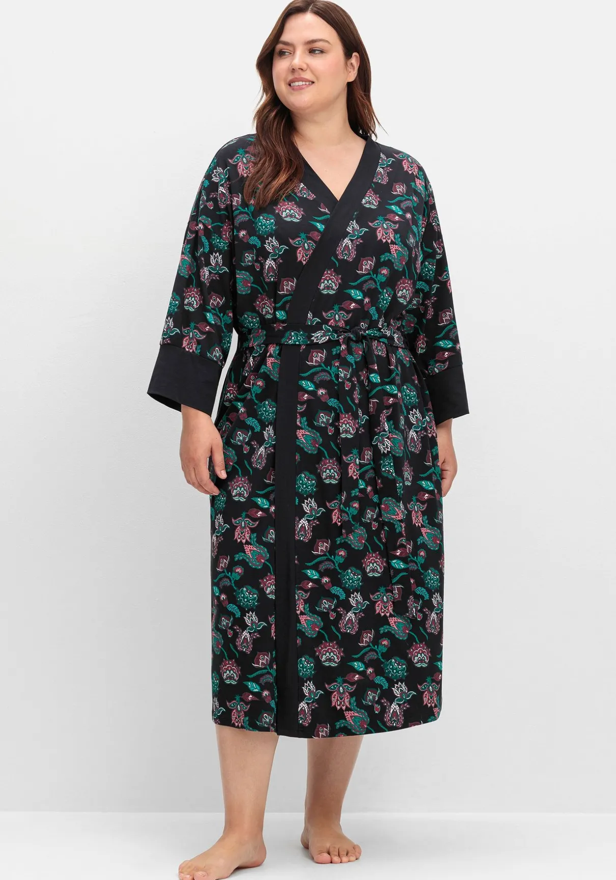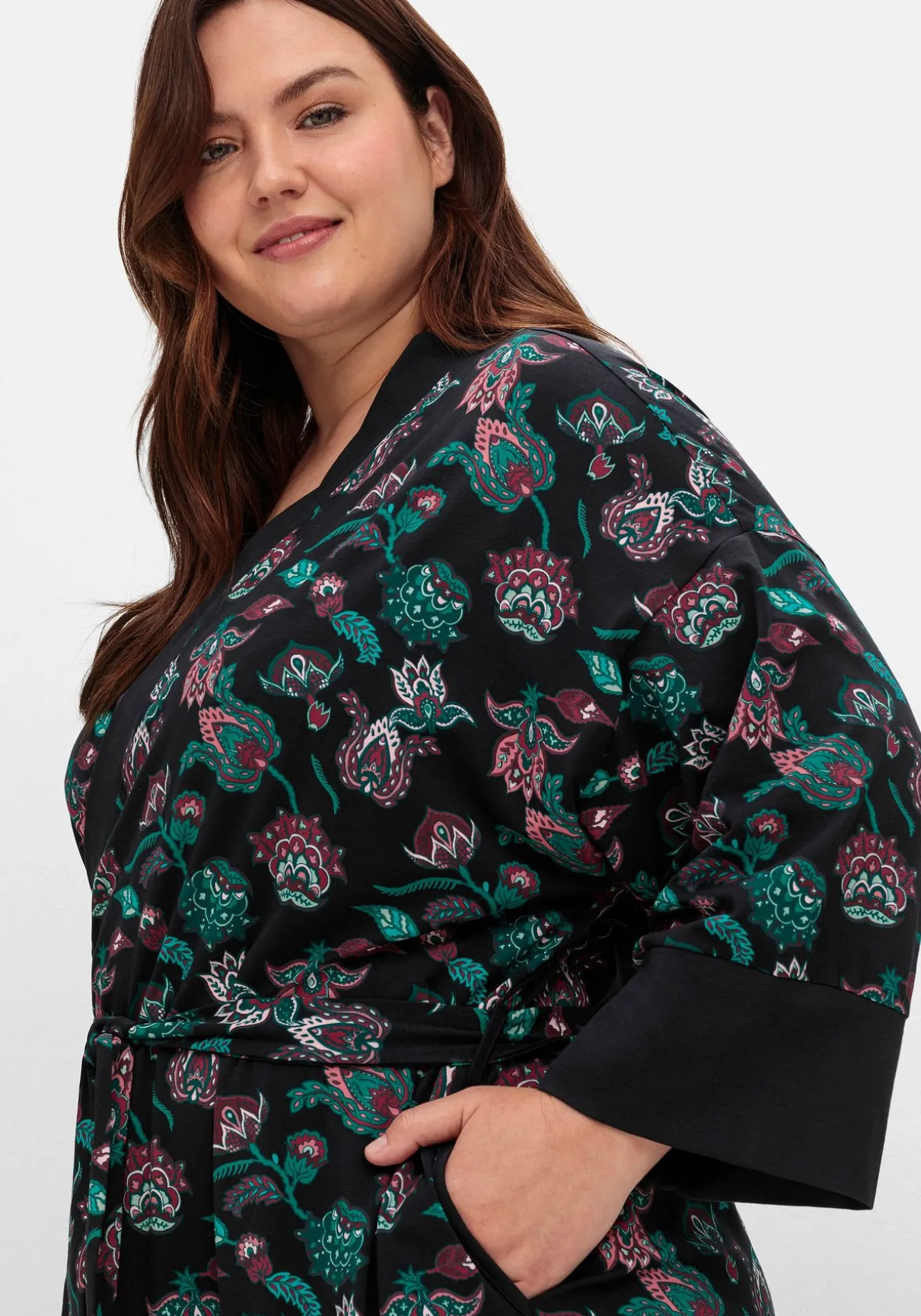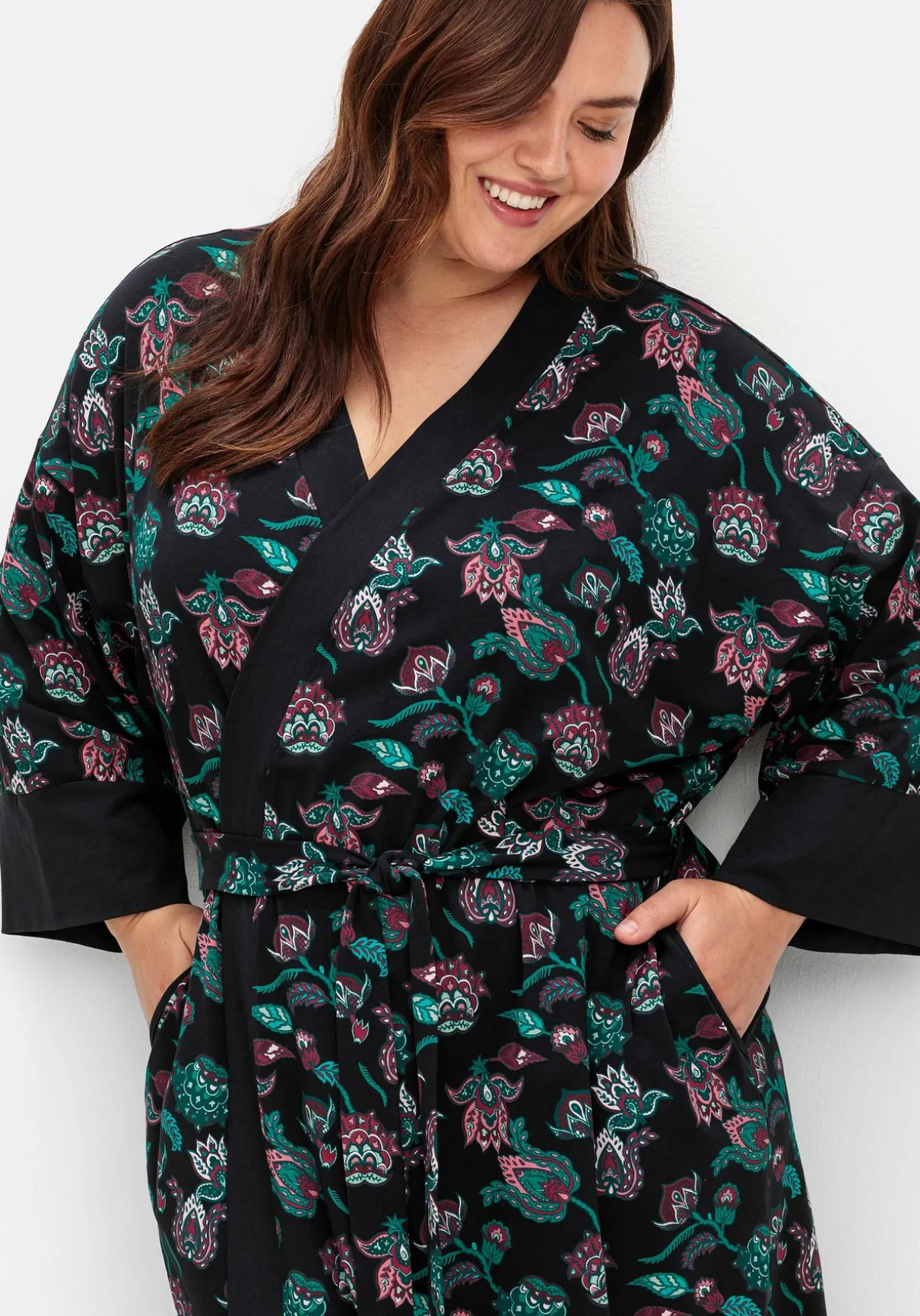 Morgenmantel mit V-Ausschnitt und 3/4-Ärmeln. Der bequeme Wohlfühl-Style präsentiert sich mit einem abnehmbaren Bindegürtel und zwei seitlichen Taschen.