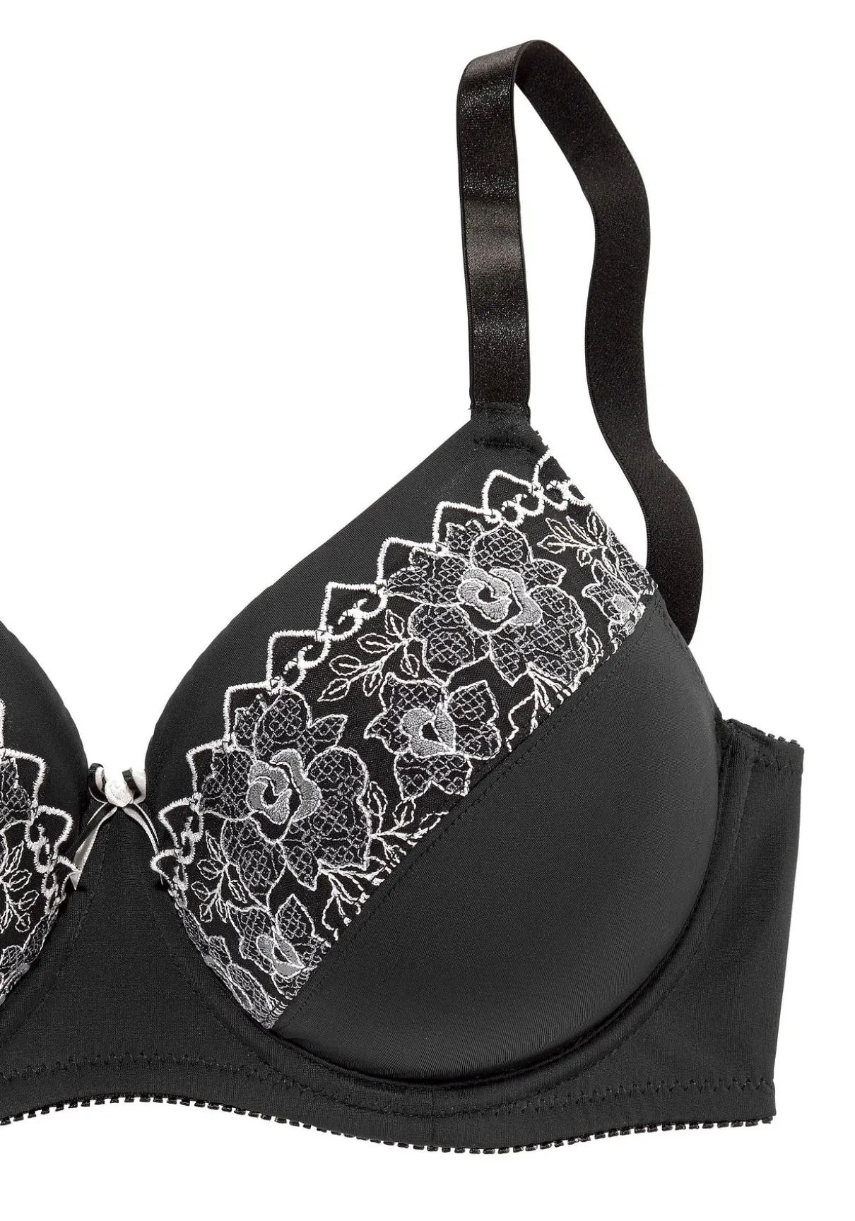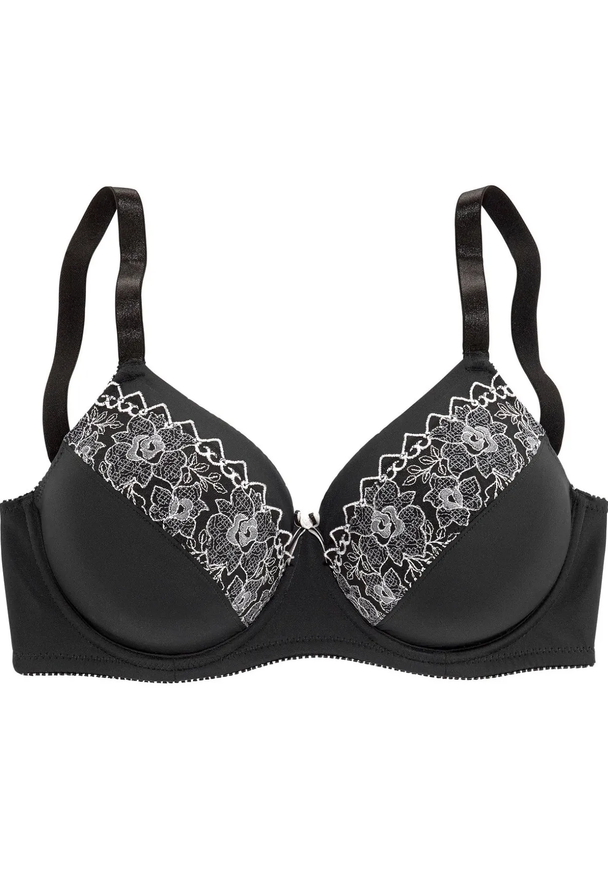 Mit mehrfarbiger Sickereispitze im Obercup. In der vorderen Mitte mit Schleifendetail. Hinten aus angemehm weichem Microtouch-Material. Träger und Rückenverschluss verstellbar. Der BH ist aus 71% Polyamid, 12% Viskose, 12% Elasthan, 5% Polyester. BHs sind nicht trocknergeeignet, da die Versteller und Ringe durch die Hitze beschädigt werden und brechen.