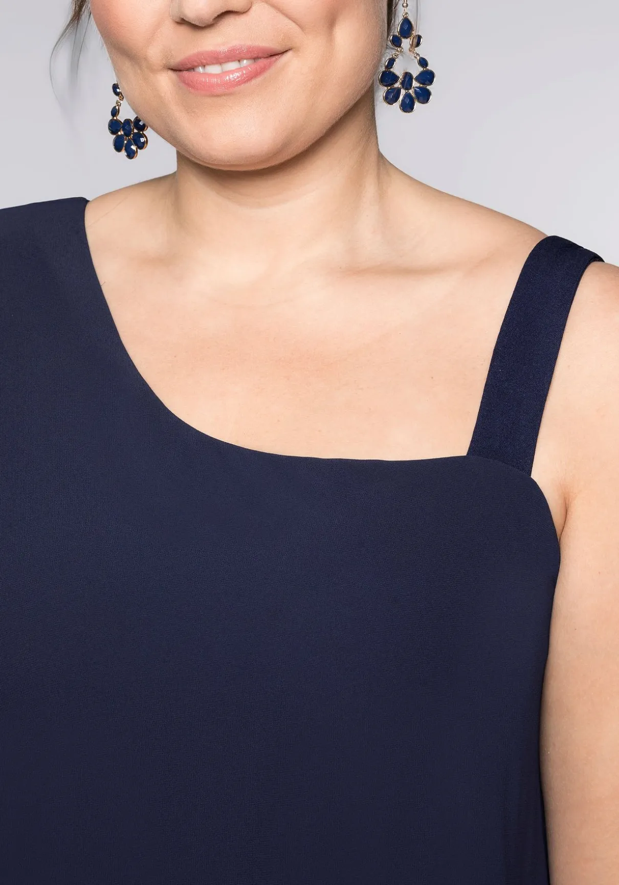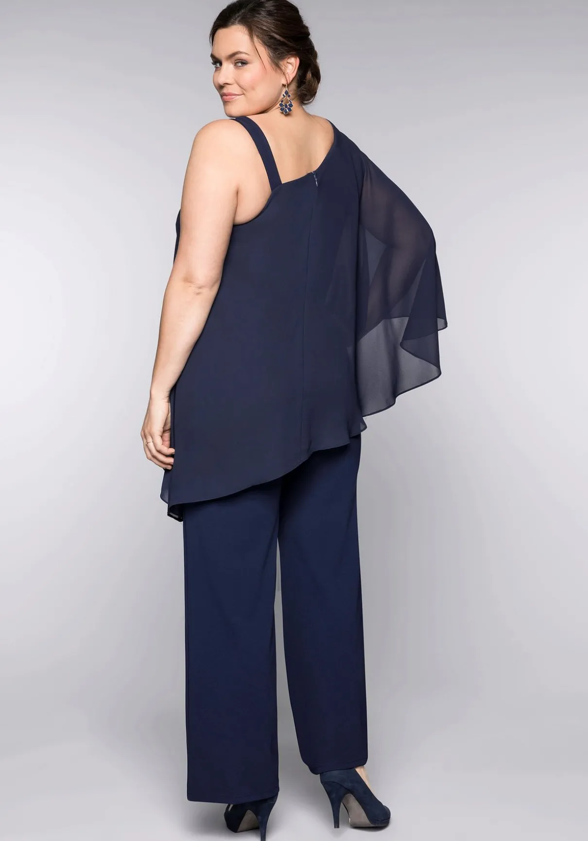 Der Overall im Lagenlook verspricht einen extravaganten Auftritt. Sein raffinierter Look entsteht durch den Material-Mix: Die Hose besteht aus elastischem Single-Jersey, das Cape aus fließendem, leicht transparentem Chiffon. Das Chiffon-Cape mit einem Fledermausärmel und asymmetrischem Saumabschluss wird zum auffallenden Eyecatcher. Der aufregende One-Shoulder-Schnitt wird auf der anderen Seite durch einen breiten Träger abgerundet.