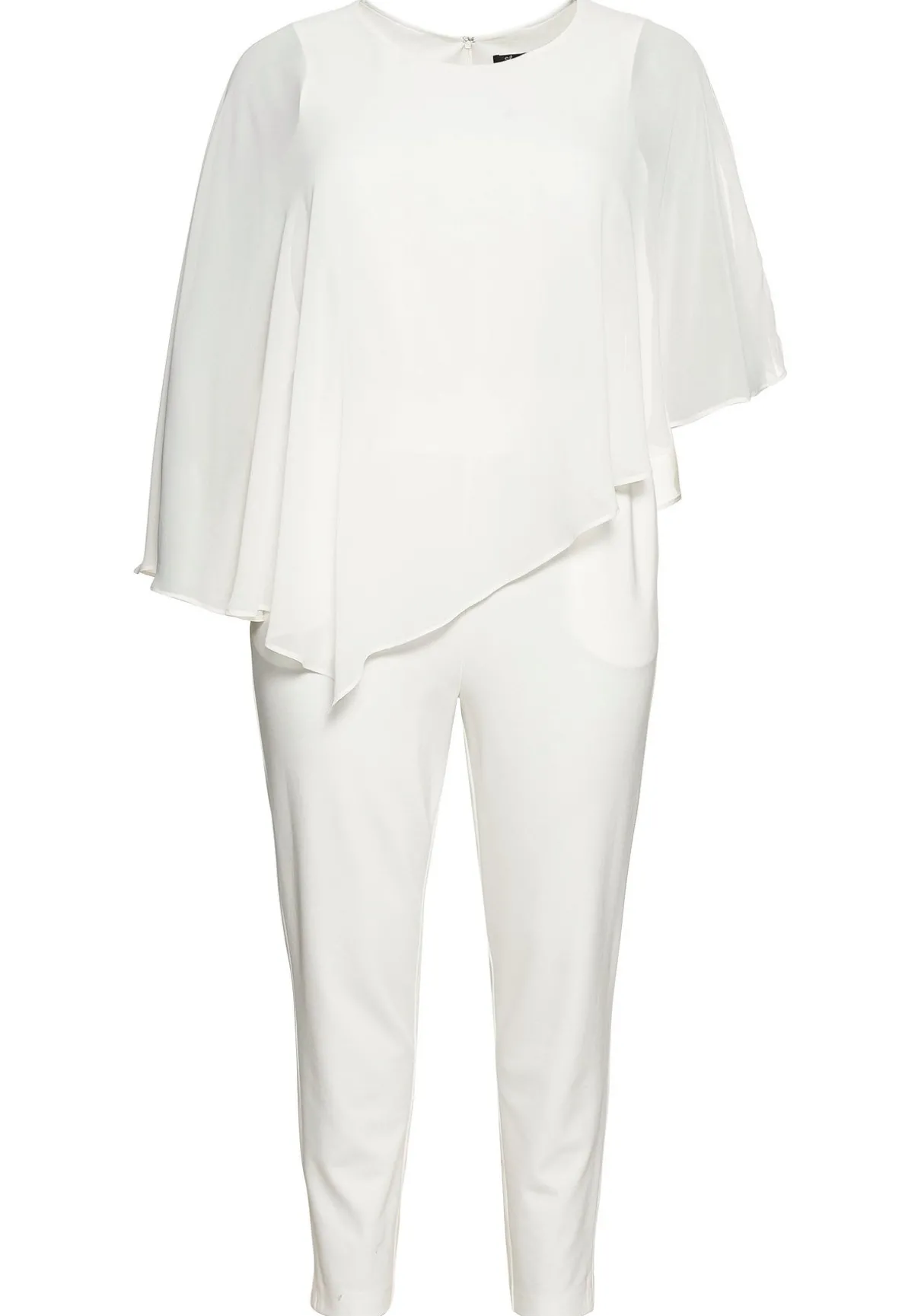 Overall mit Cape, in Layering-Optik. Der ärmellose Overall besitzt ein schmales Bein mit seitlichen Schlitzen. In der Taille ist er mit einem Gummizugbund gearbeitet, in die Seitennaht sind Taschen eingefasst. Zu schließen ist der Jumpsuit mit einem nahtfeinen Reißverschluss im Rücken. Darüber fällt ein zipfelig geschnittenes Chiffoncape mit weiten Fledermausärmeln. Die semitransparente Optik lässt einen raffinierten und zugleich femininen Look entstehen – perfekt für alle festlichen Anlässe von Party bis Hochzeit!