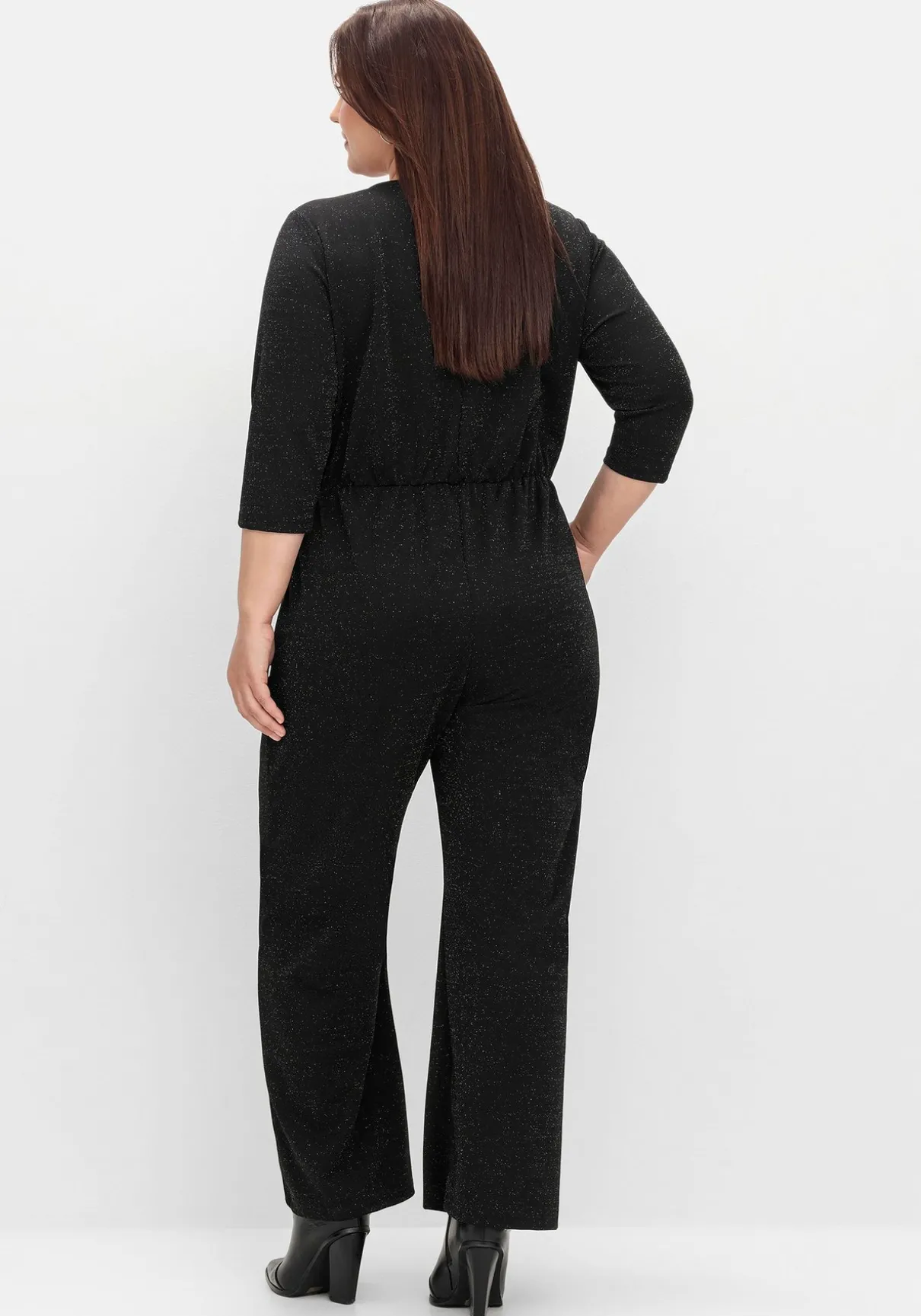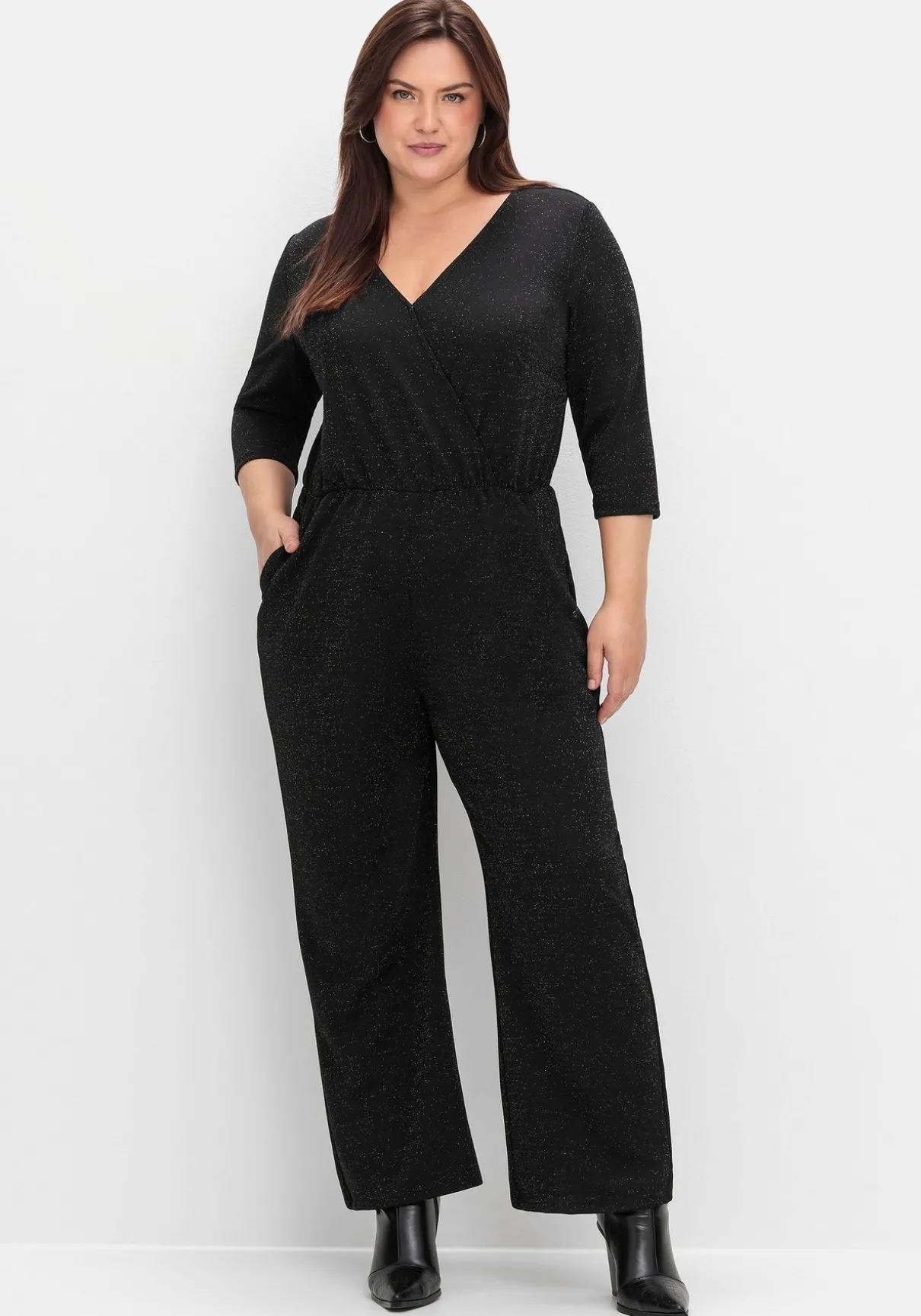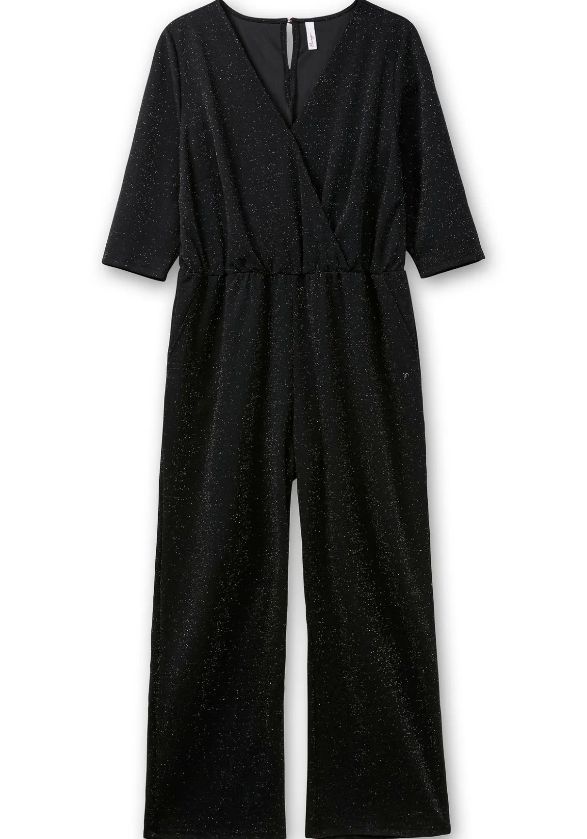 Elegant glitzernder Overall in Wickeloptik. Die 3/4-Ärmel verleihen dem Outfit eine raffinierte Note, während der Schlitz mit Knopf hinten für ein stilvolles Detail sorgt. Seitliche Eingriffstaschen runden den Look ab.