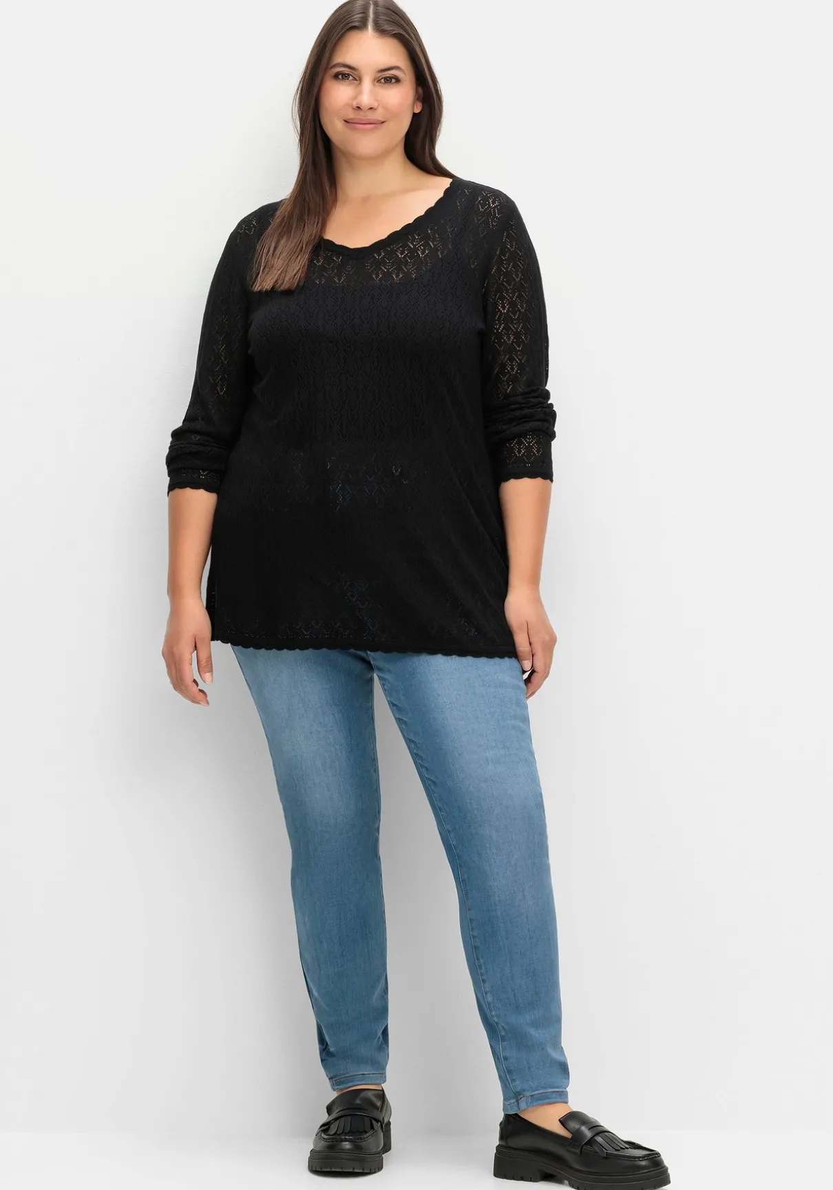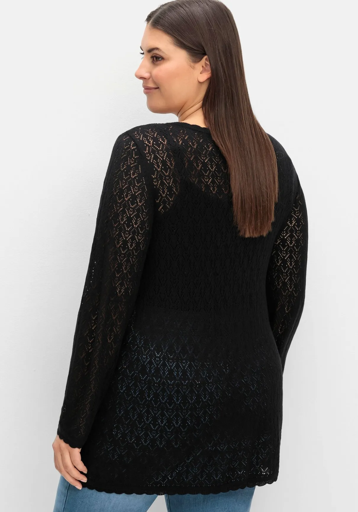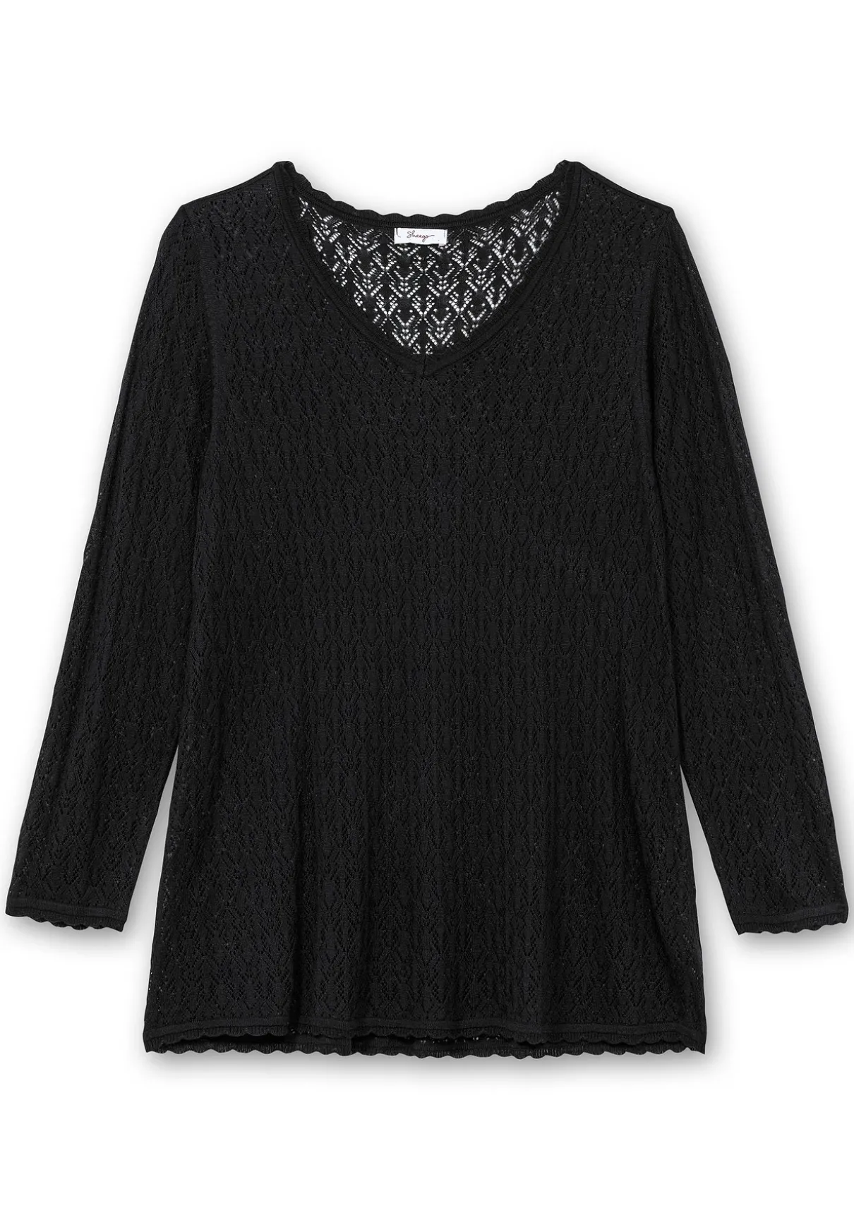 Pullover aus Ajourstrick. Das zarte Strickmuster verleiht ihm eine feminine, leicht transparente Optik. Der Pullover ist in dezenter A-Linie geschnitten und besitzt einen streckenden V-Ausschnitt. Bogenkanten an allen Abschlüssen dienen als verspieltes Finish.
