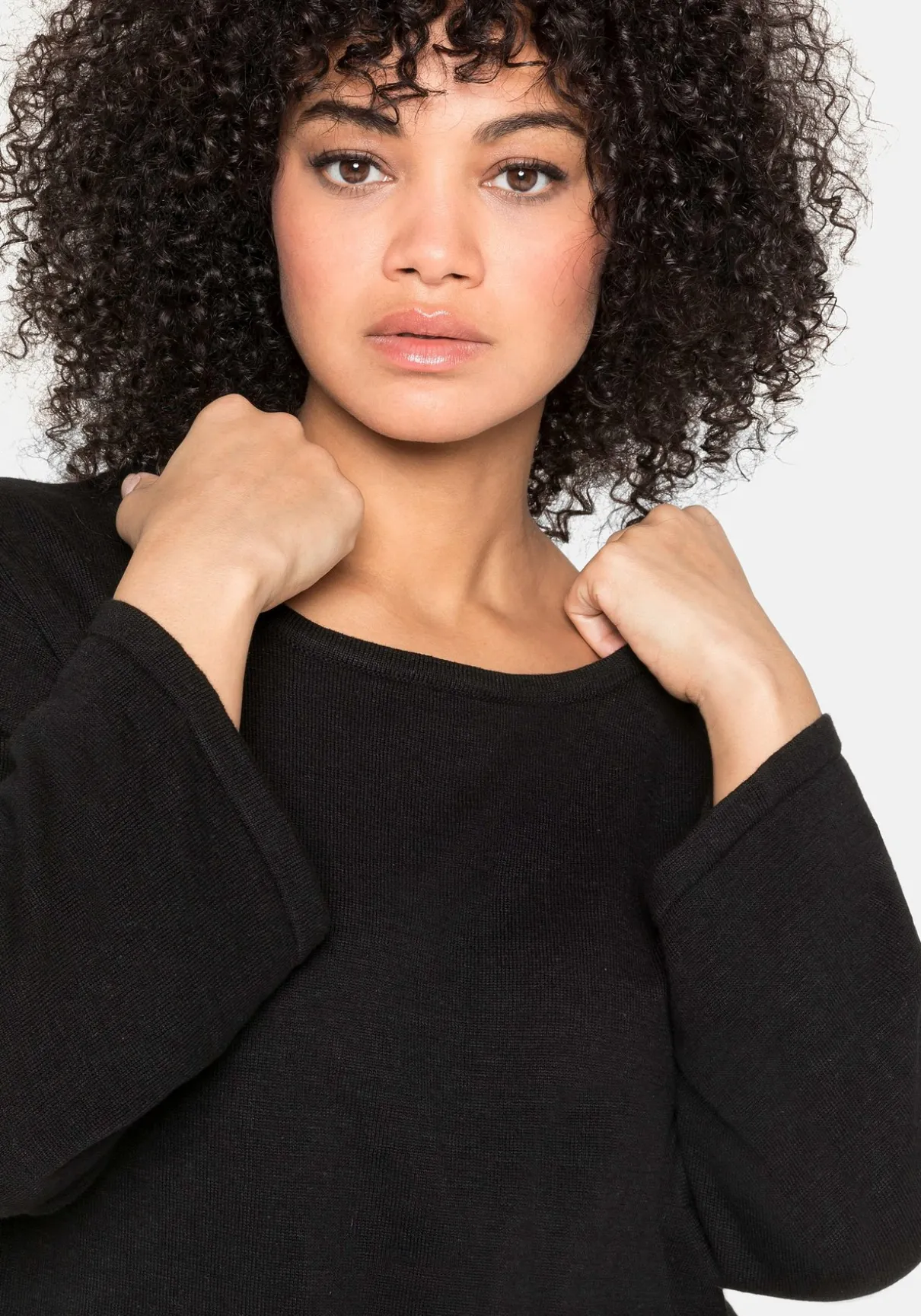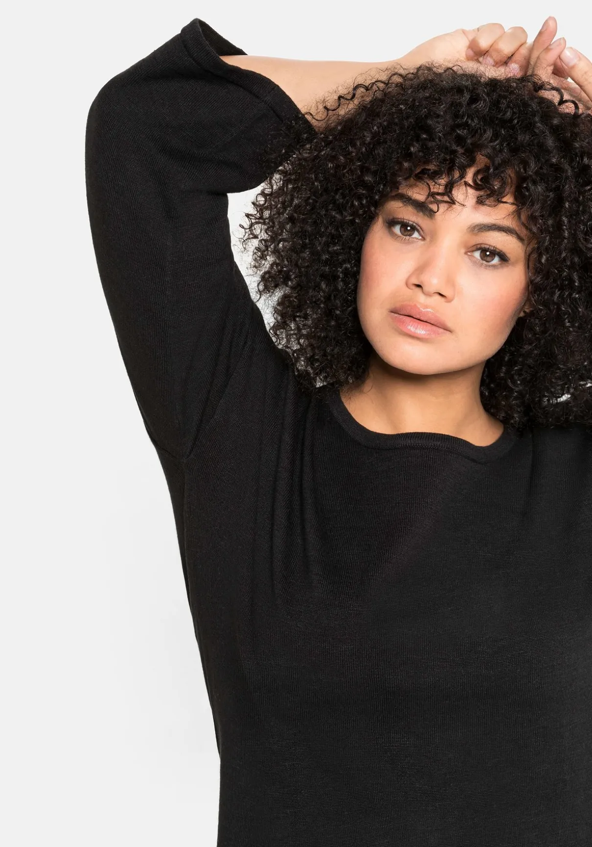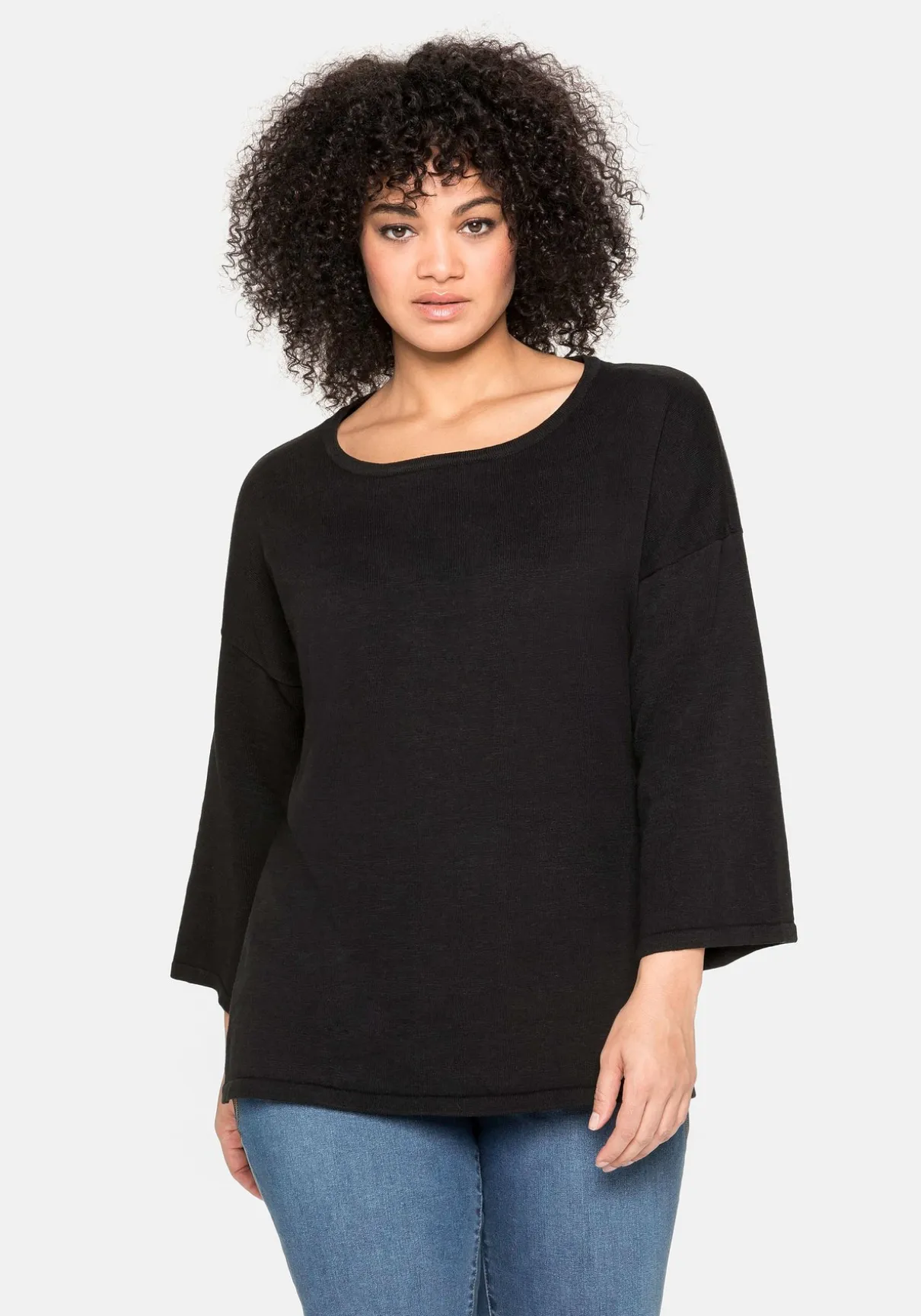 Feinstrickpullover mit Rundhalsausschnitt. Der cleane Look erhält durch die überschnittenen Trompetenärmel in 7/8-Länge modischen Twist. Dank des modernen, legeren Schnitts und des leicht gerundeten Saums fällt der Pullover luftig und locker über die Silhouette.