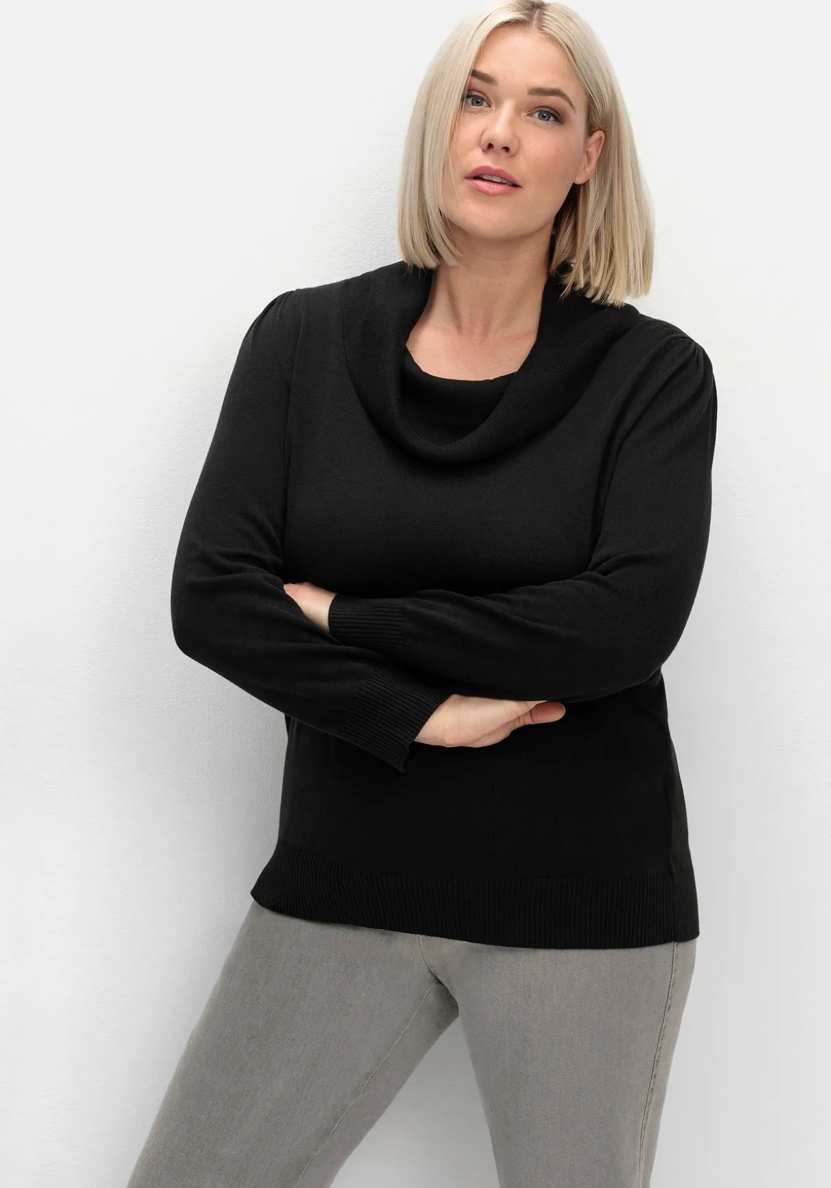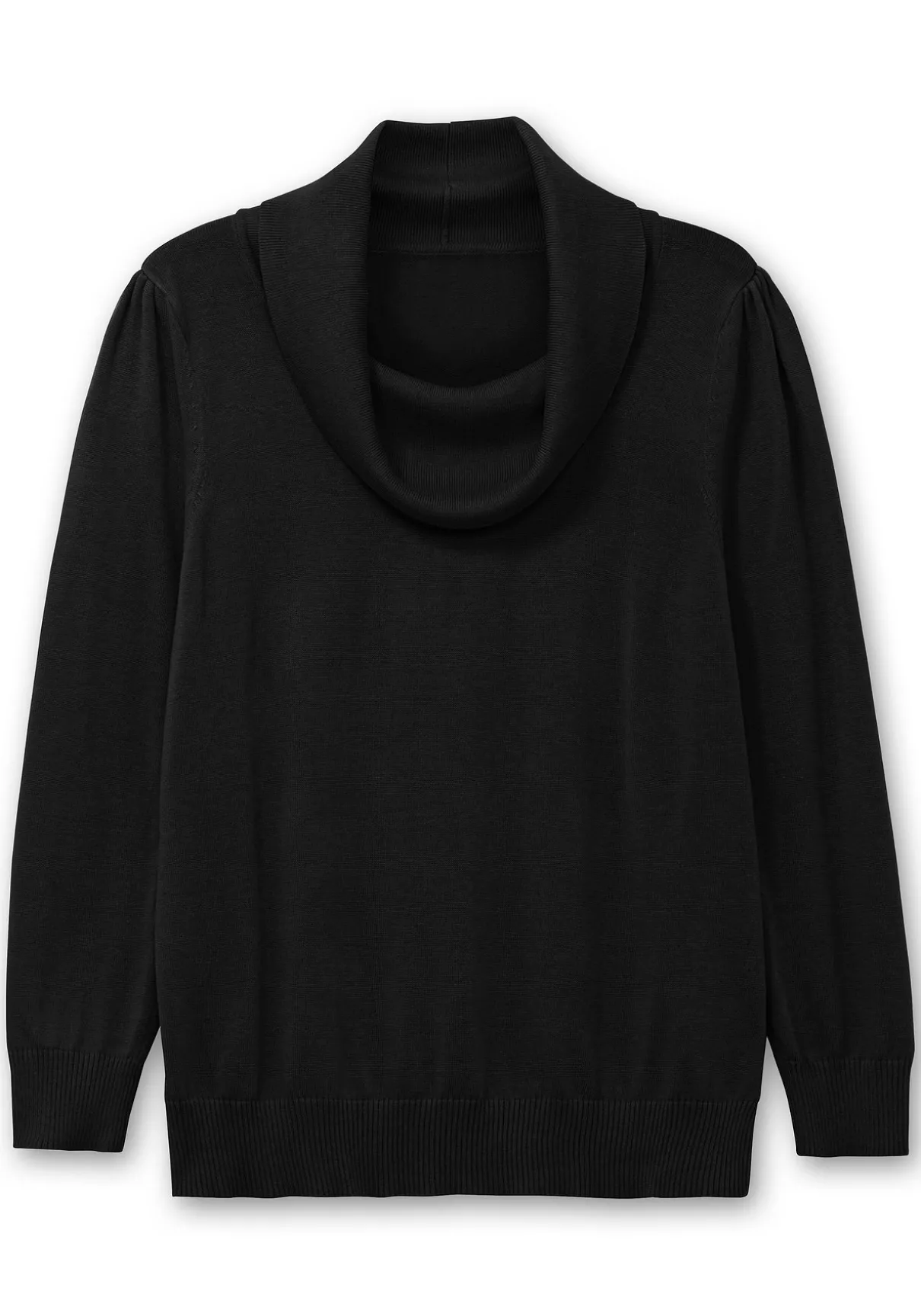 Pullover mit Rollkragen. Der sehr weite, halsferne Kragen lässt eine raffinierte Wasserfall-Optik entstehen. Kräuselungen an den Ärmeln sind dazu eine verspielte Ergänzung. Elastische Rippbündchen an Ärmeln und Saum runden den zeitlos-gepflegten Style perfekt ab.
