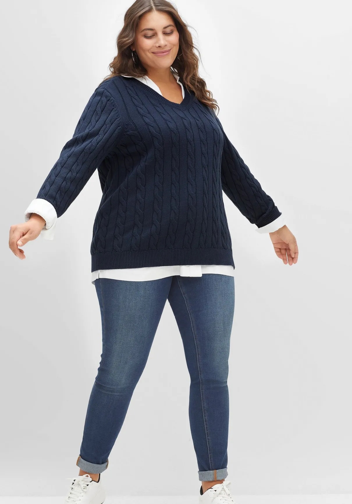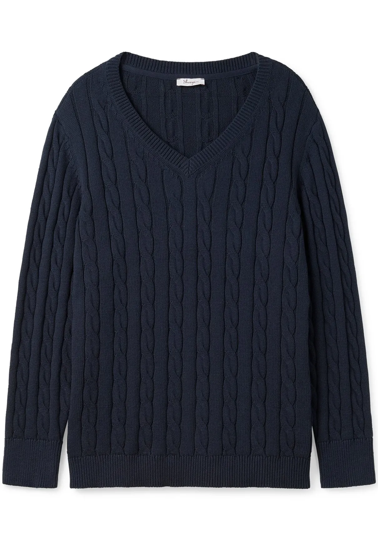 Pullover mit gleichmäßigem Zopfmuster. Der zeitlos-klassische Look wird durch den V-Ausschnitt und die Rippbundabschlüsse optimal ergänzt.
