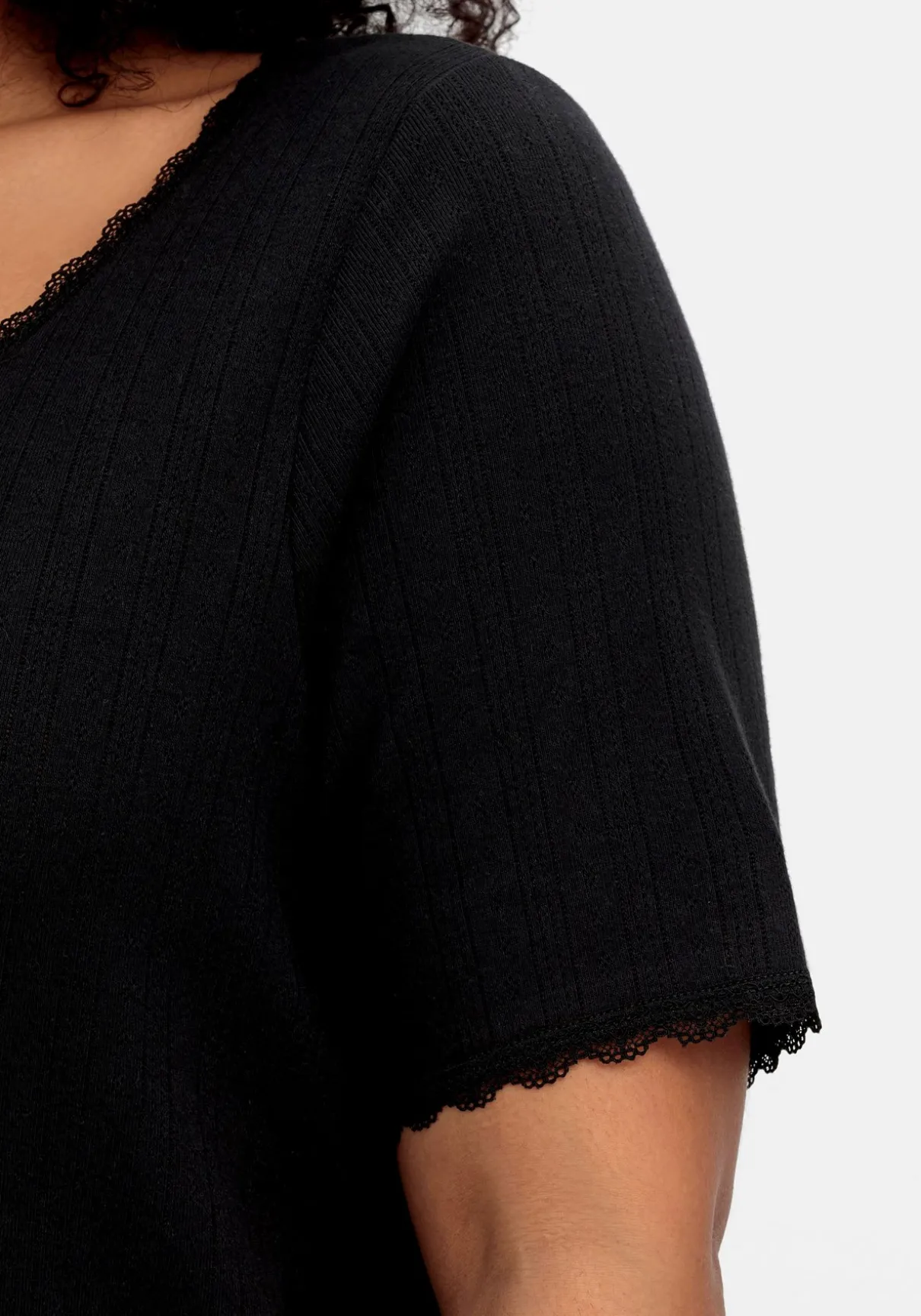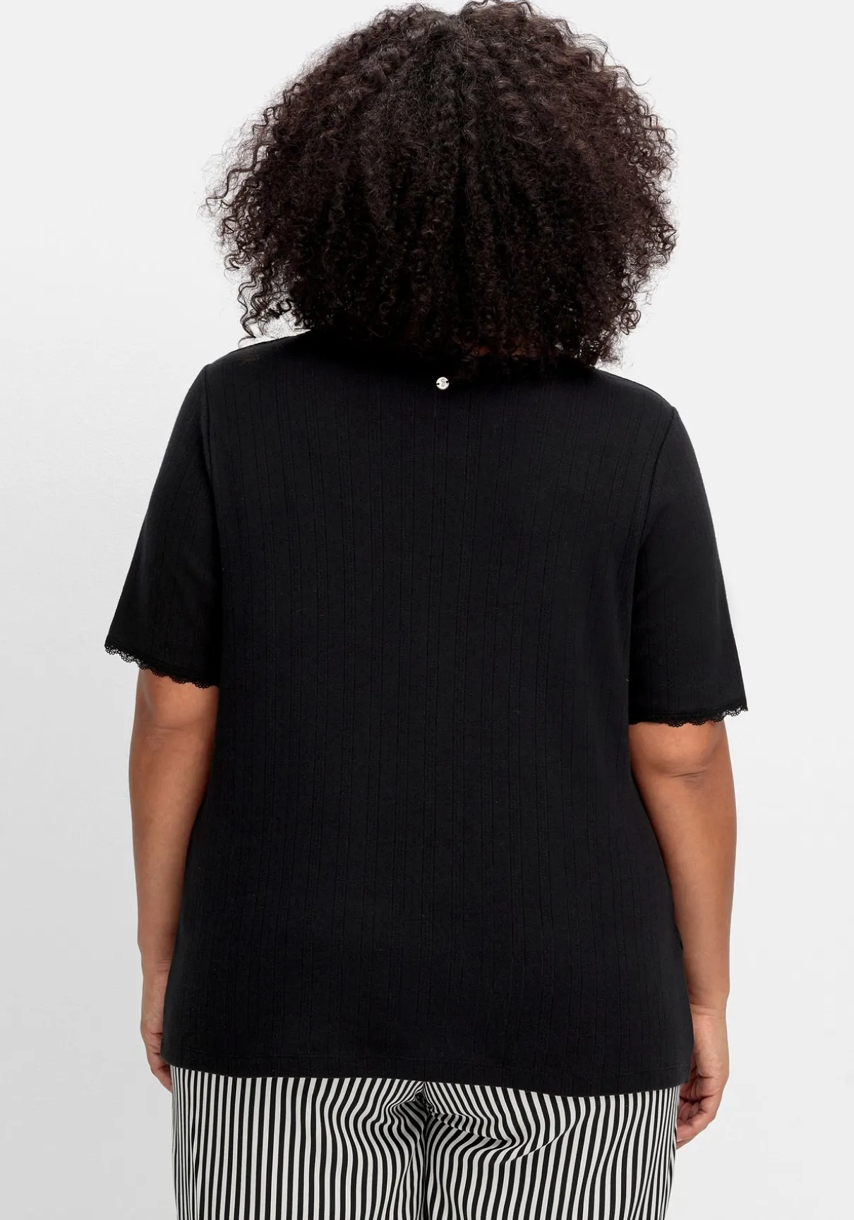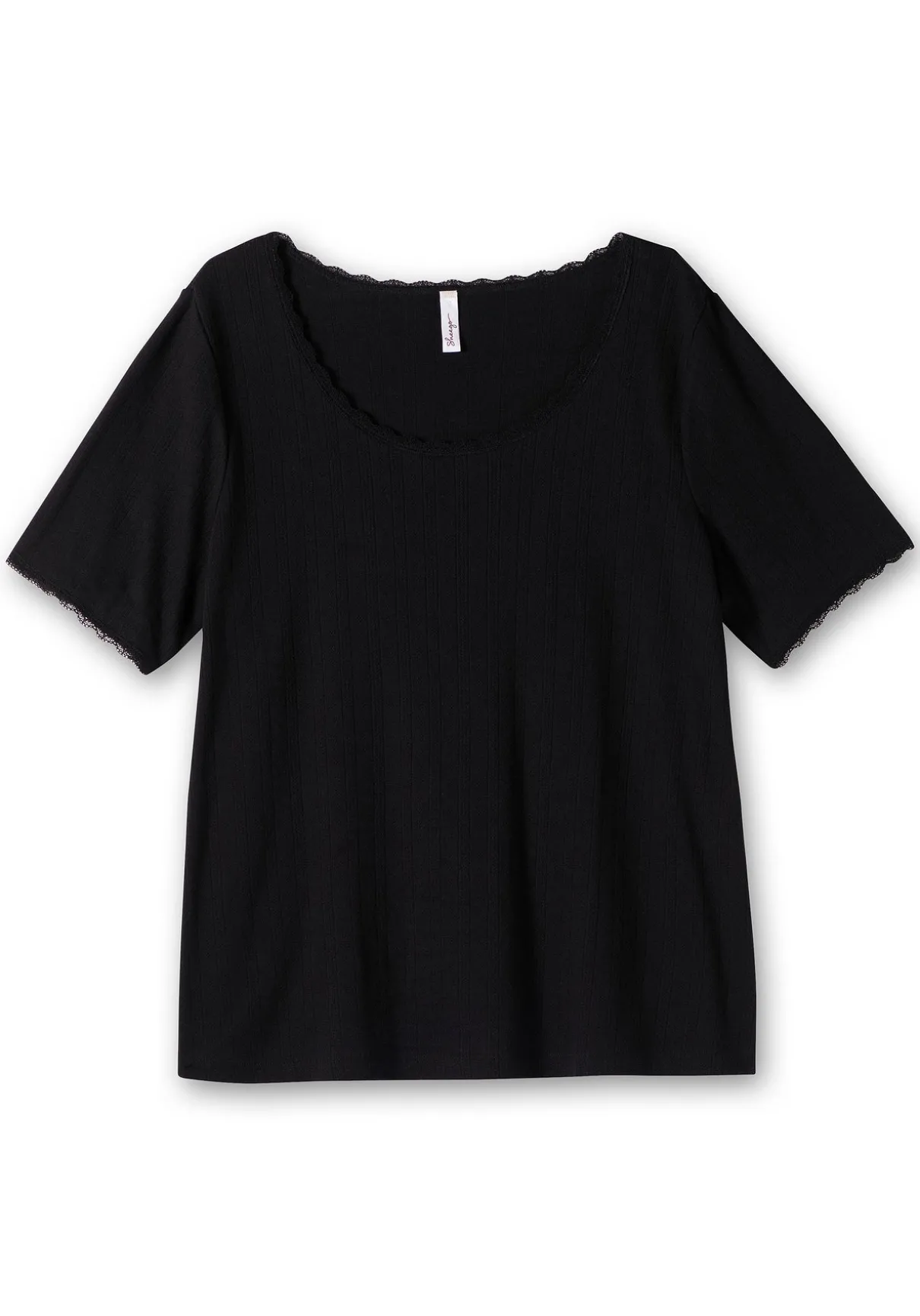 Shirt in Rippqualität. Das zarte Ajourmuster verleiht dem Shirt eine verspielte, romantische Optik. Die Spitzenkante am etwas weiter gefassten Rundhalsausschnitt sowie am Ärmelsaum dient als feminines Finish.