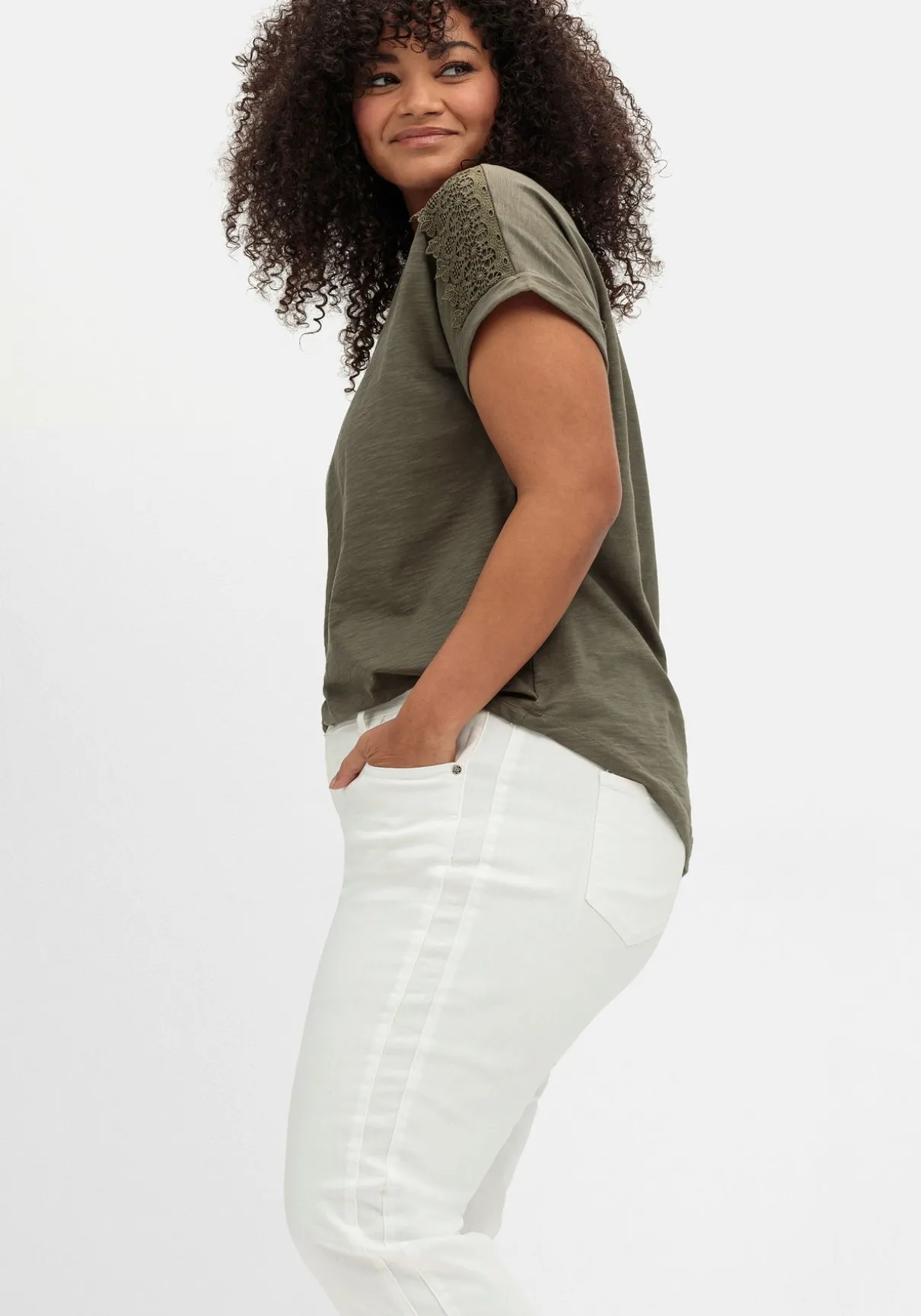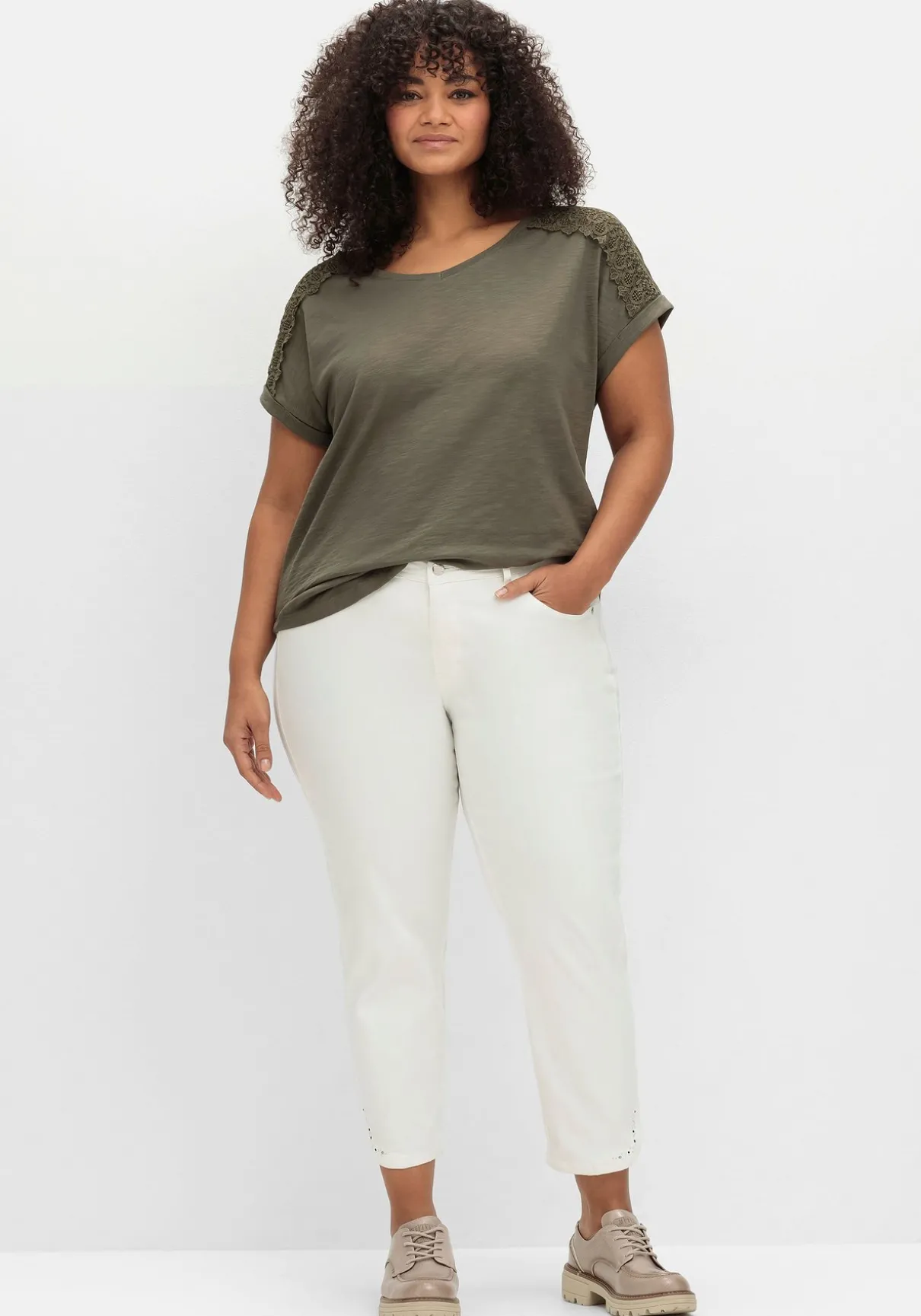7/8-Jeans in schmaler Form. Modisches Highlight sind die abgerundeten Schlitze am Saum, die mit dezenten Glitzersteinchen verziert sind. Auch die Einsätze entlang der Seitennaht sorgen für das gewisse Etwas, gleichzeitig strecken sie geschickt die Beine. Dazu kommen die klassischen fünf Taschen, Gürtelschlaufen, Knopf- und Reißverschluss.