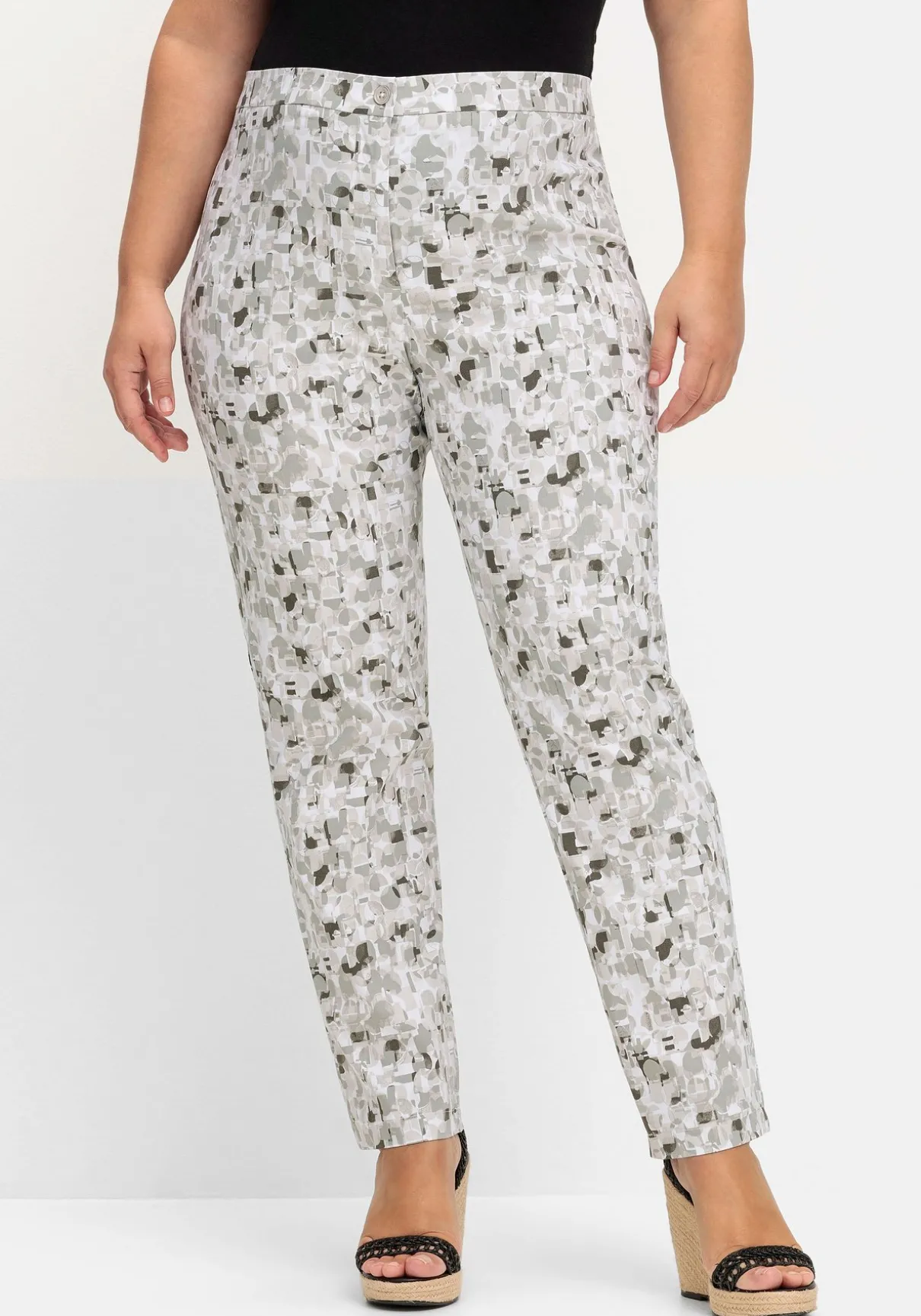 Hose aus elastischer Bengalin-Qualität. Die taschenlose Form trägt nicht auf, der farbharmonische Print wirkt sehr modern. Geschlossen wird die Hose am Formbund mit Knopf- und Reißverschluss.