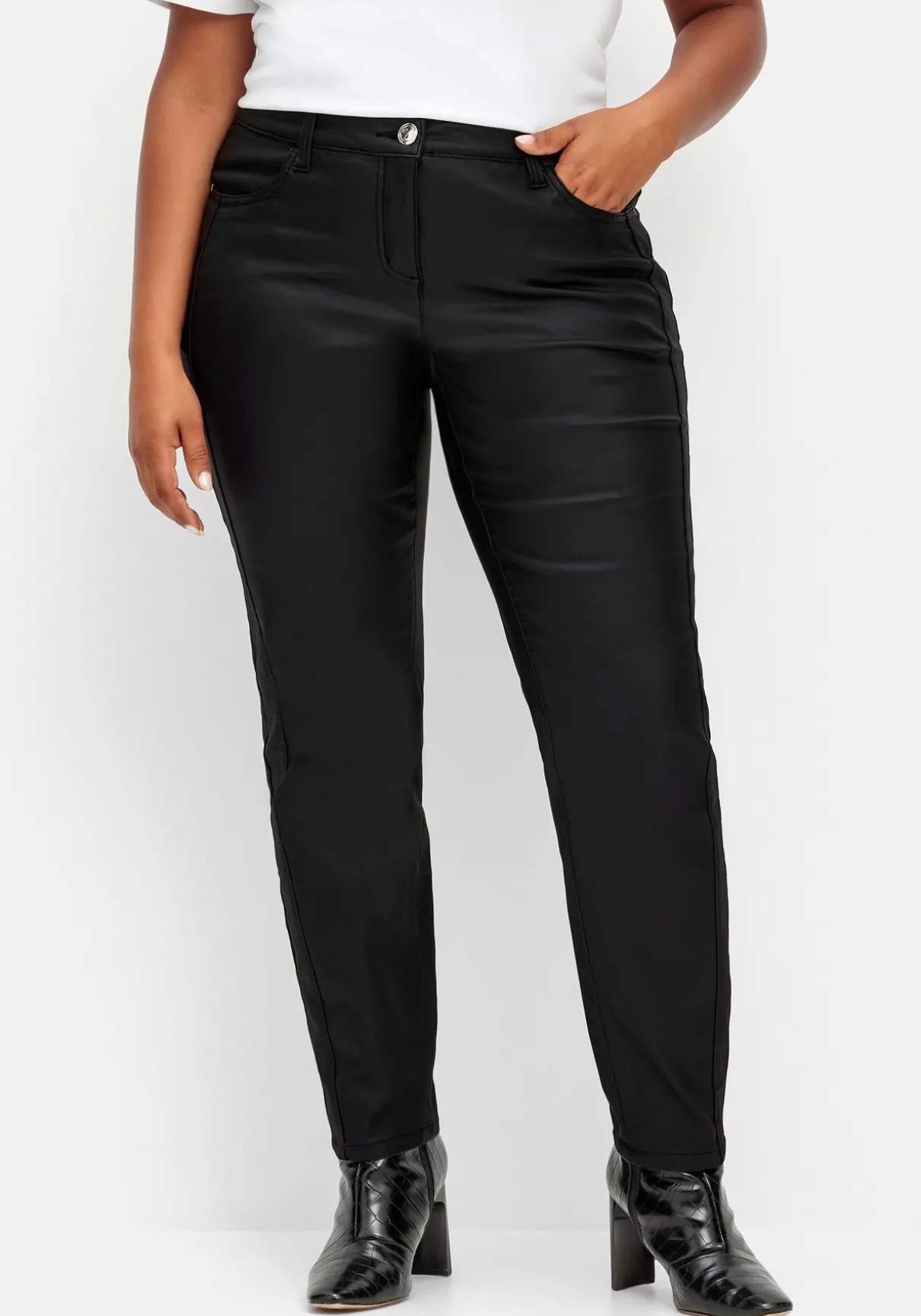 Mit leicht schimmernder Beschichtung. Durch die wärmend angeraute Innenseite wird die Hose zum optimalen Begleiter durch die kältere Jahreszeit. Sie besteht aus einem Viskosemix und ist angenehm elastisch.