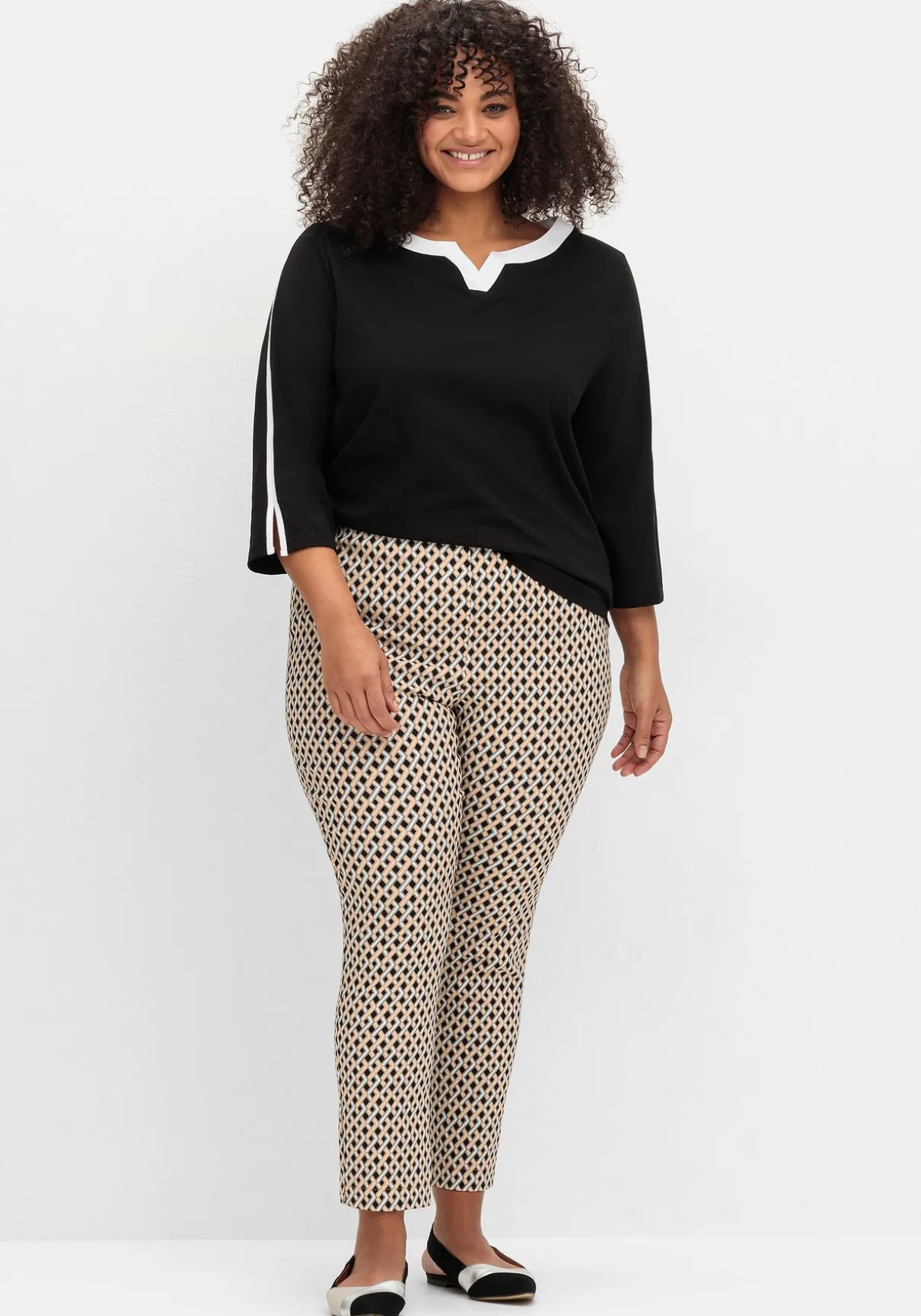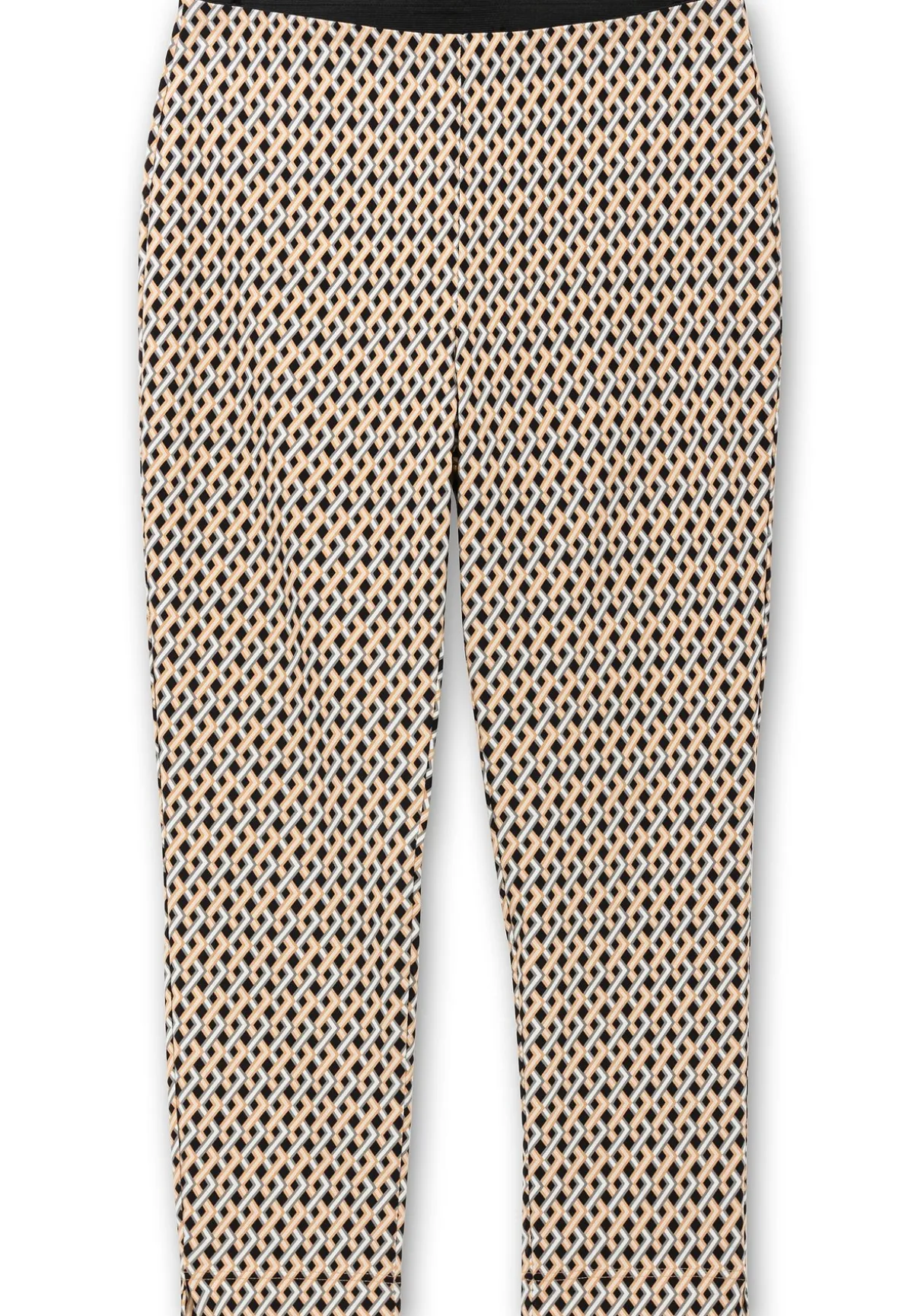 Schmale Hose aus Bengalin. Stilsicher und modern wirkt das grafische Minimalmuster. Dank des innenliegenden Dehnbunds trägt sich die Hose sehr komfortabel, gleichzeitig liegt der Bund am Bauch schön glatt an. Auch die imitierten Paspeltaschen hinten unterstreichen den gepflegten Auftritt.