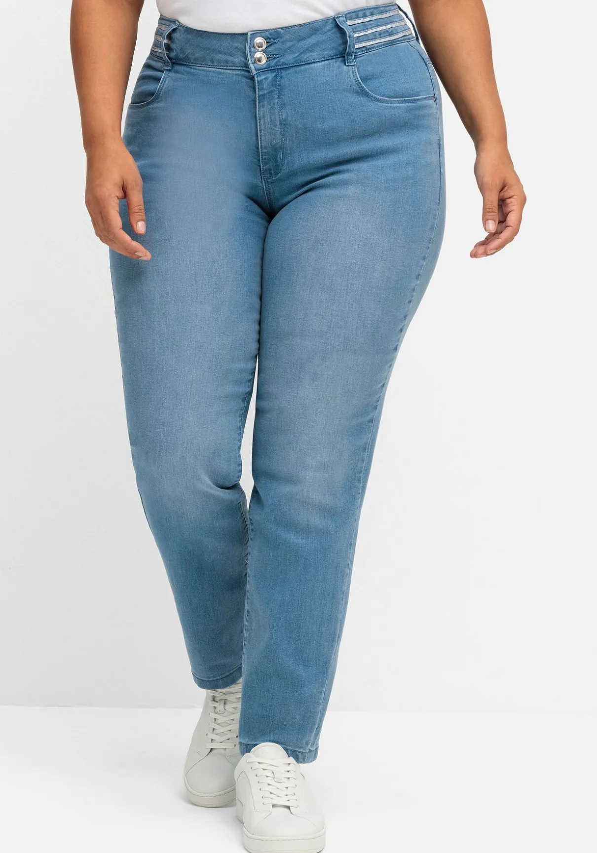 Jeans in schmaler Beinform. Das glitzernde Zierband mit Biesen seitlich am Bund macht die Hose zum modischen Highlight. Der Bund mit Reißverschluss und zwei dekorativen Knöpfen, zwei Eingrifftaschen vorn sowie zwei Gesäßtaschen hinten ergänzen den trendstarken Look.