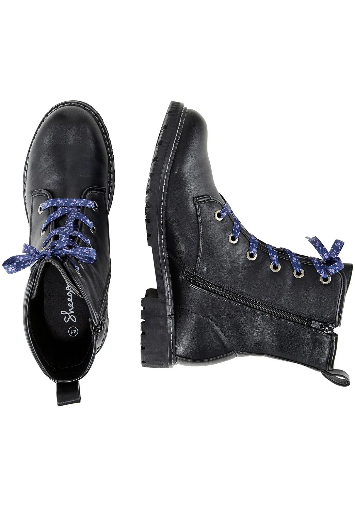 Schnürboots mit floralem Druck oder uni mit Kontrast-Schnürung. Neben der Schnürung am Schaft kann der Schuh mit Hilfe seitlicher Reißverschlüsse komfortabel verschlossen werden. Verschlussmöglichkeit. Praktisch ist die herausnehmbare Innensohle, die profilierte Laufsohle ergänzt den robusten Look.
