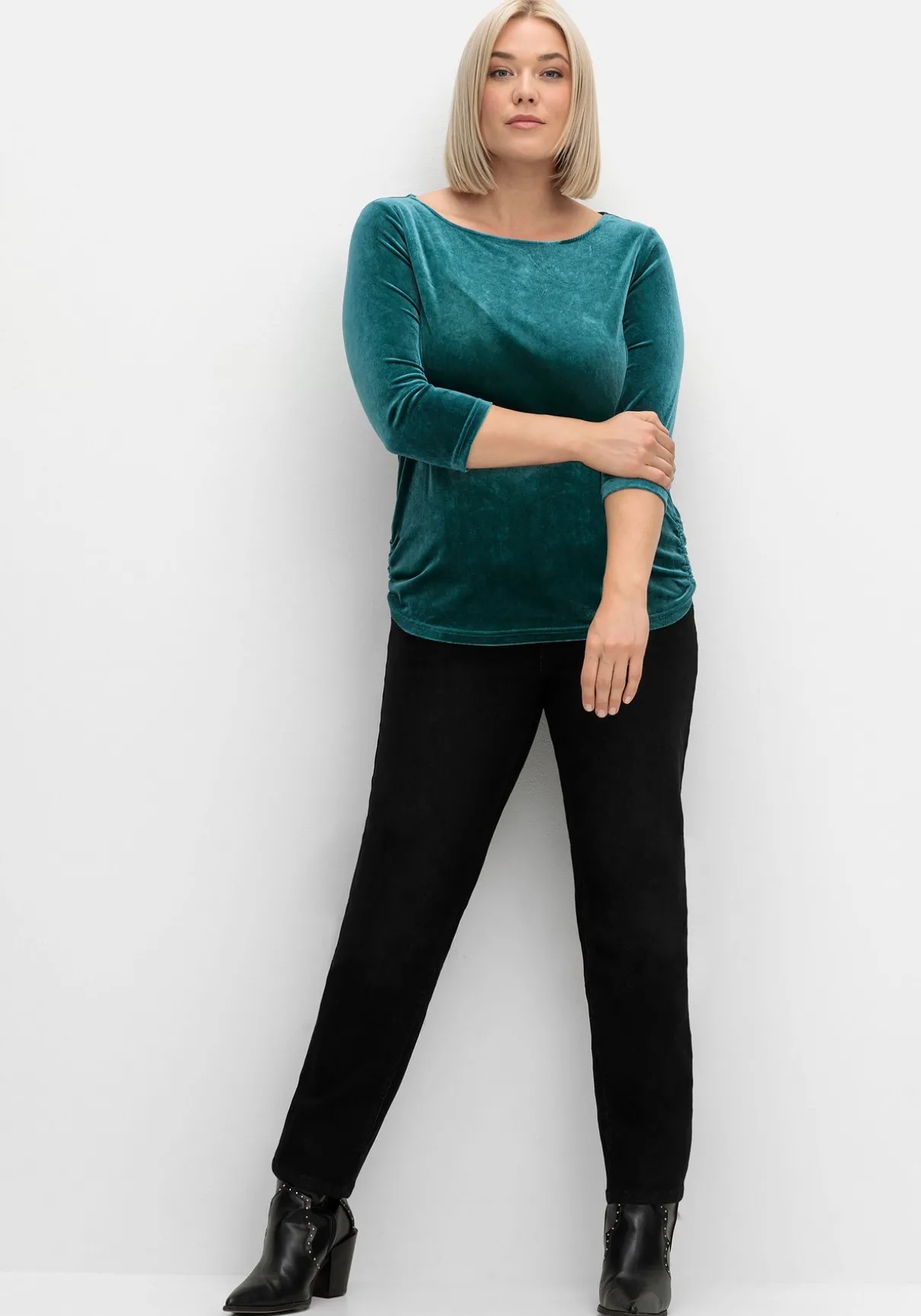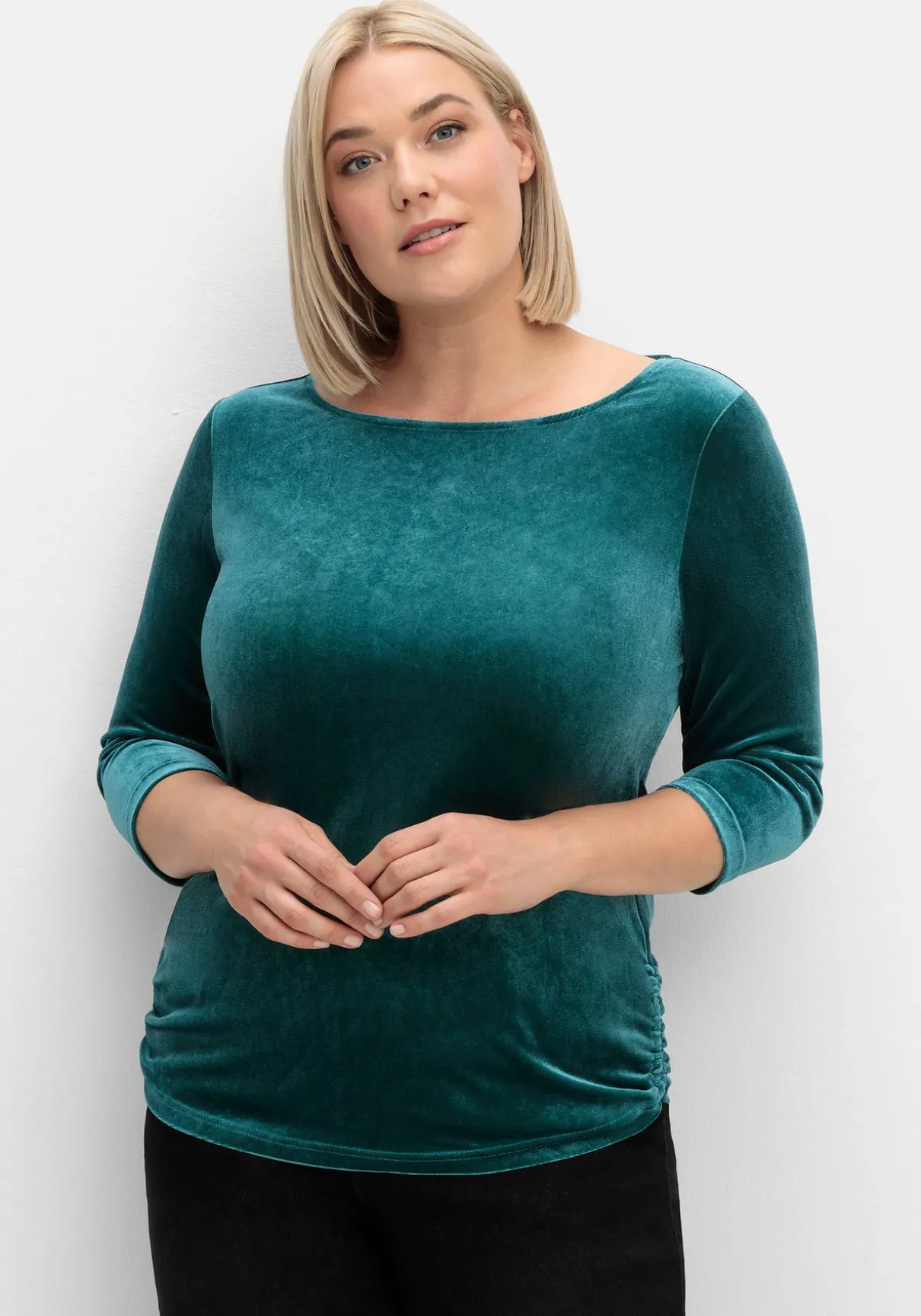 Shirt aus Samt. Der edle Schimmer und die herrlich weiche Qualität machen das Shirt zum perfekten Begleiter auch für festliche Anlässe. Die schmeichelnde Raffung seitlich und der formschöne U-Boot-Ausschnitt unterstreichen den femininen Auftritt. Dazu kommen 3/4-lange Ärmel und ein leicht abgerundeter Saum.