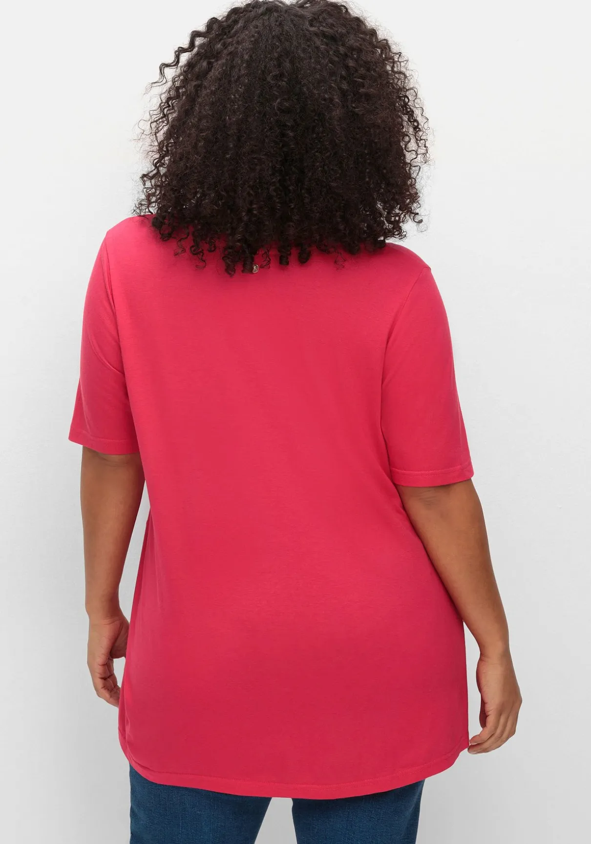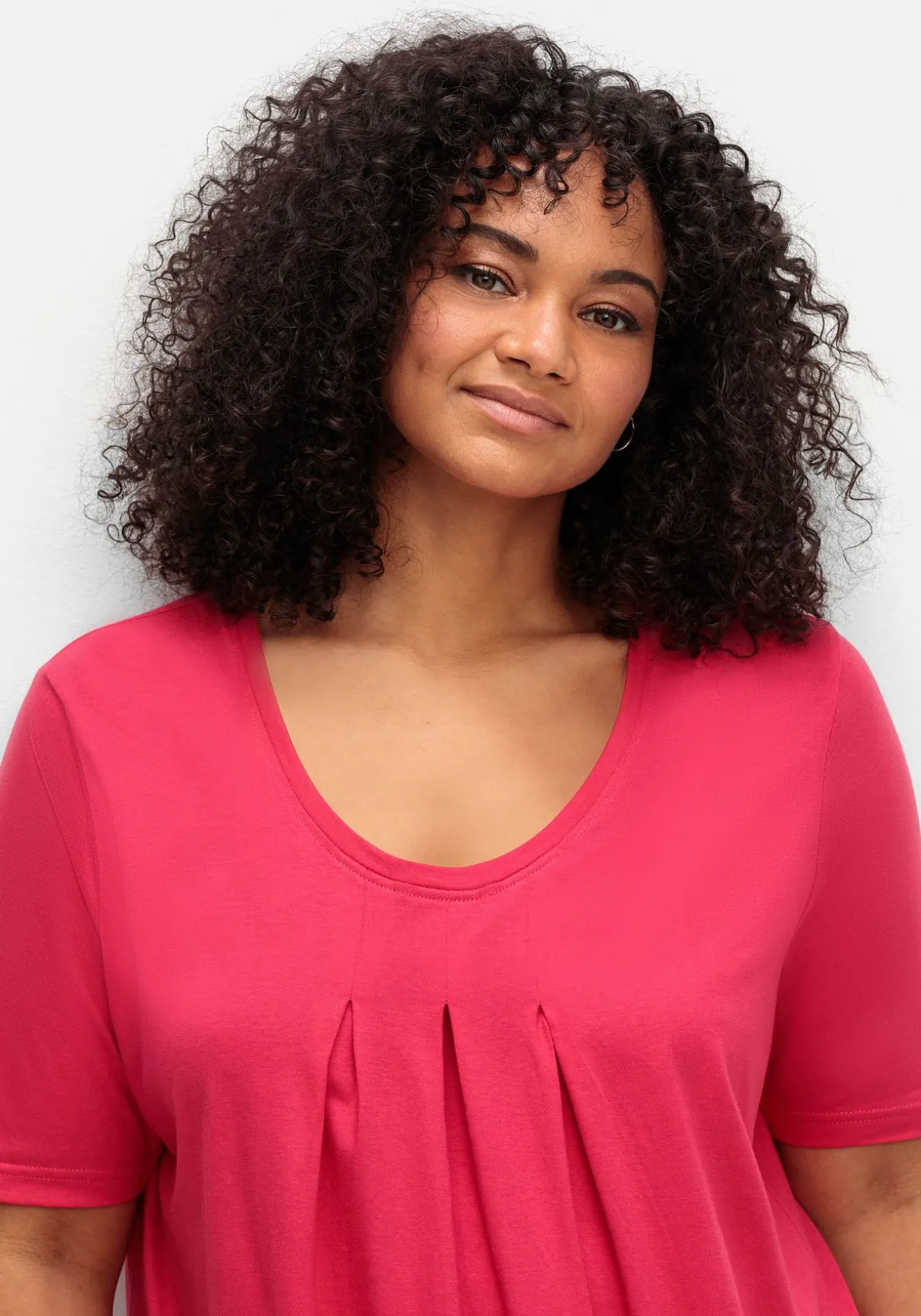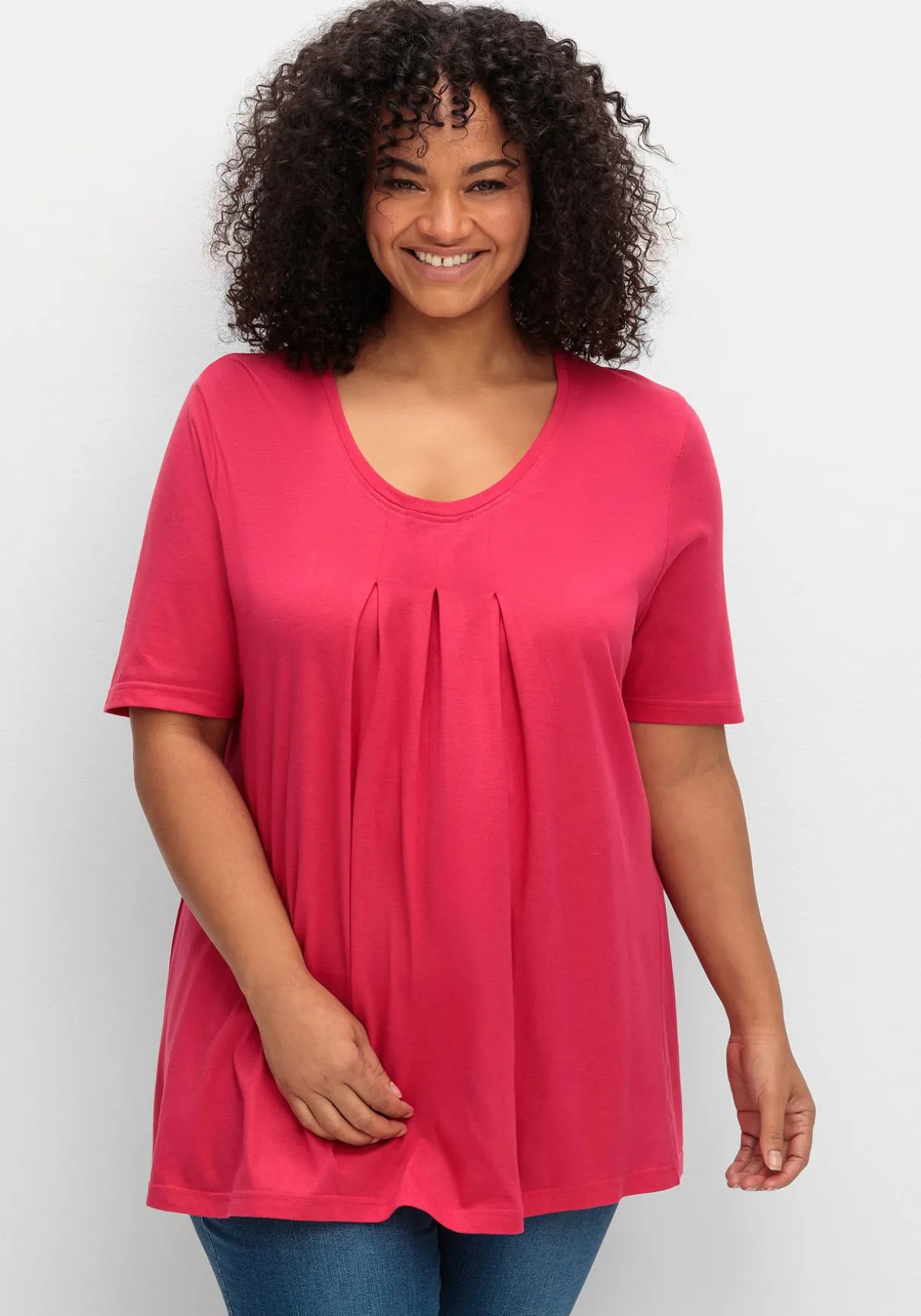 Shirt in A-Linie. Feminin wirken die drei Kellerfalten auf Brusthöhe. Im Zusammenspiel mit der ausgestellten A-Silhouette sorgen sie für einen lockeren Fall. Der leicht verlängerte Kurzarm schmeichelt den Oberarmen.