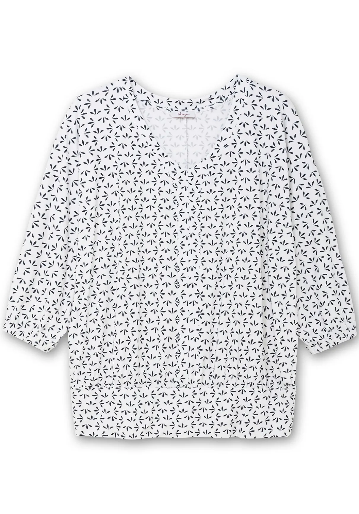 Shirt mit Allover-Minimaldruck. Die 3/4-langen Fledermausärmel enden mit bequemen Gummibündchen, der V-Ausschnitt streckt den Oberkörper. Der locker fallende Schnitt wird am Saum durch den breiten Bund aus Oberstoff zusammengefasst.