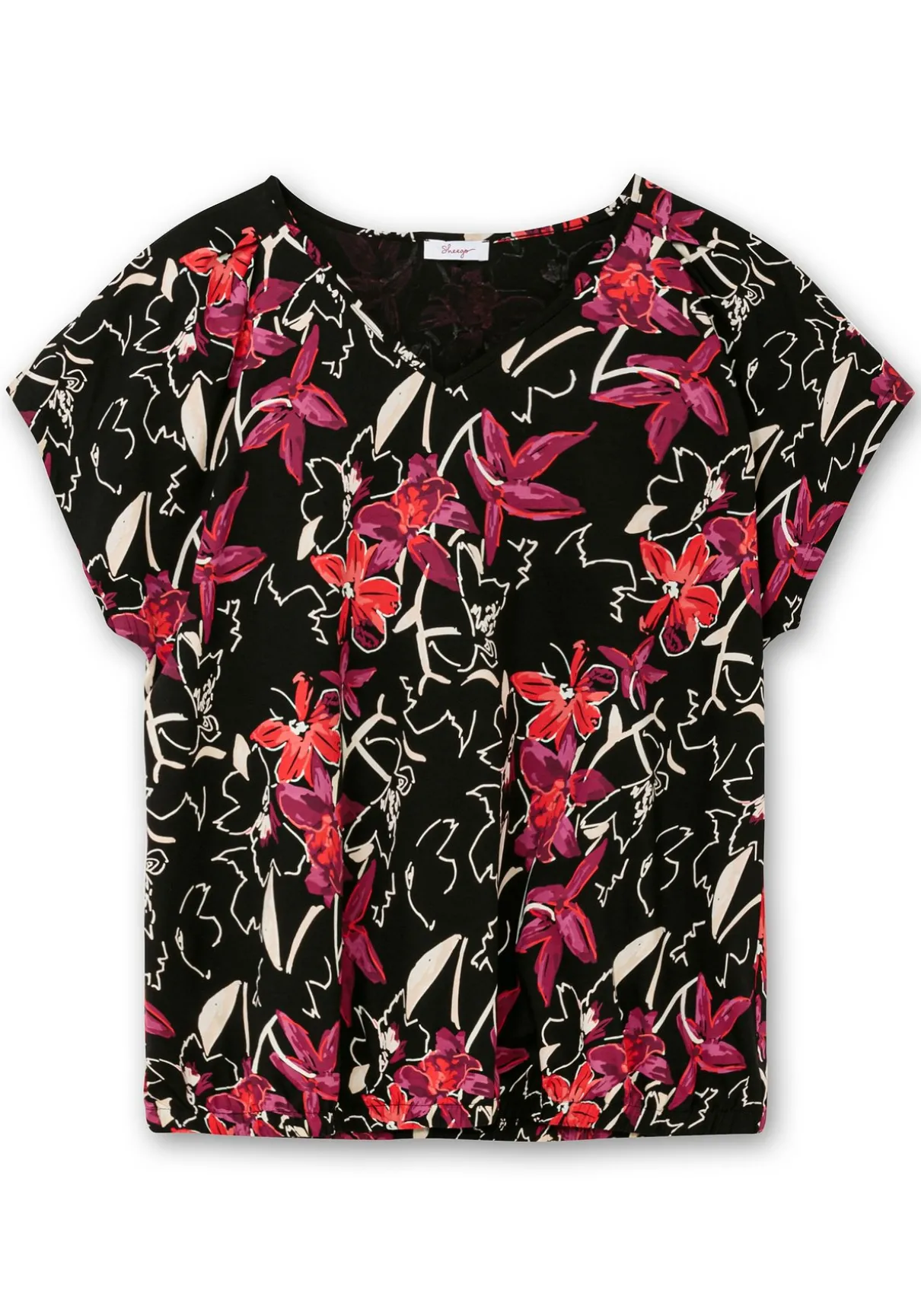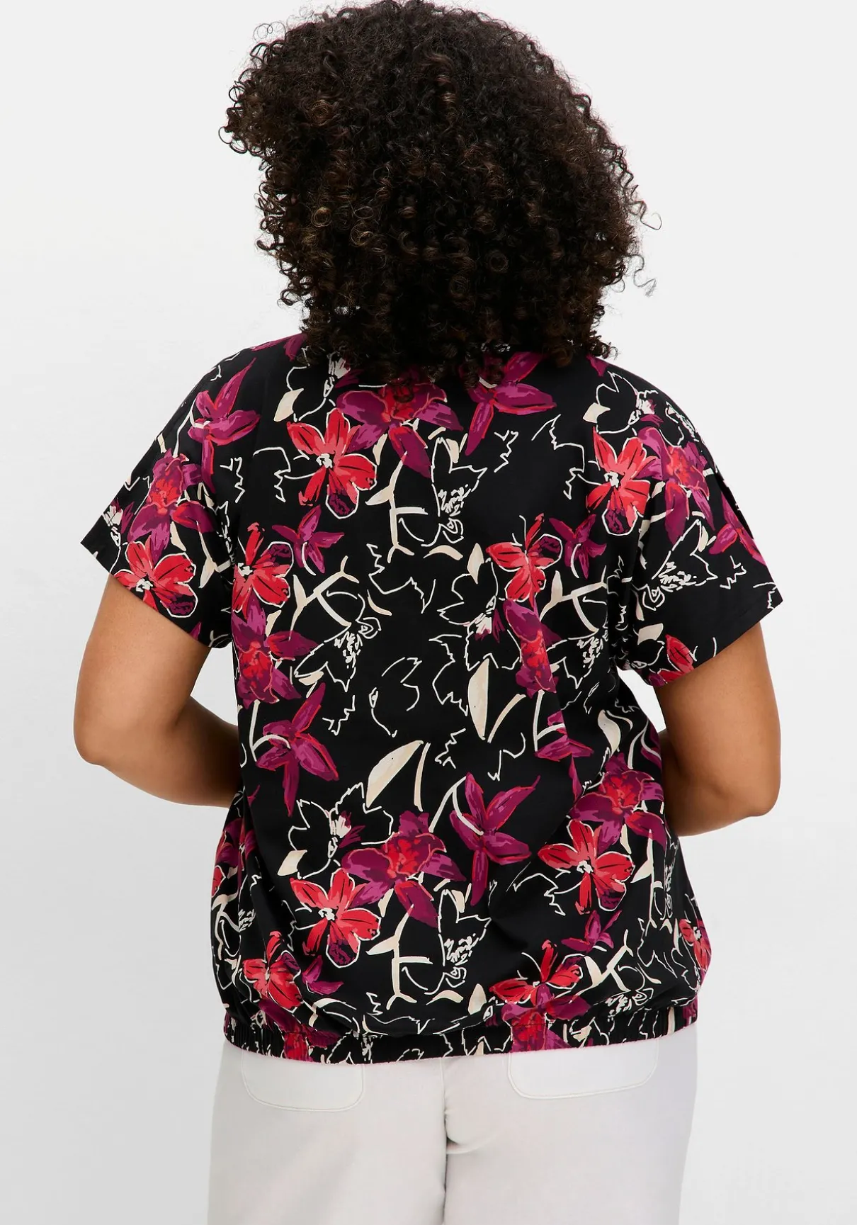 Shirt mit Alloverdruck. Die überschnittenen Ärmel sind auf den Schultern raffiniert geschlitzt, Kellerfalten seitlich am etwas tieferen V-Ausschnitt unterstreichen den femininen Look. Ein Gummizugbund fasst den lockeren Schnitt am Saum zusammen und gibt dem Shirt so mehr Weite im Bauchbereich.