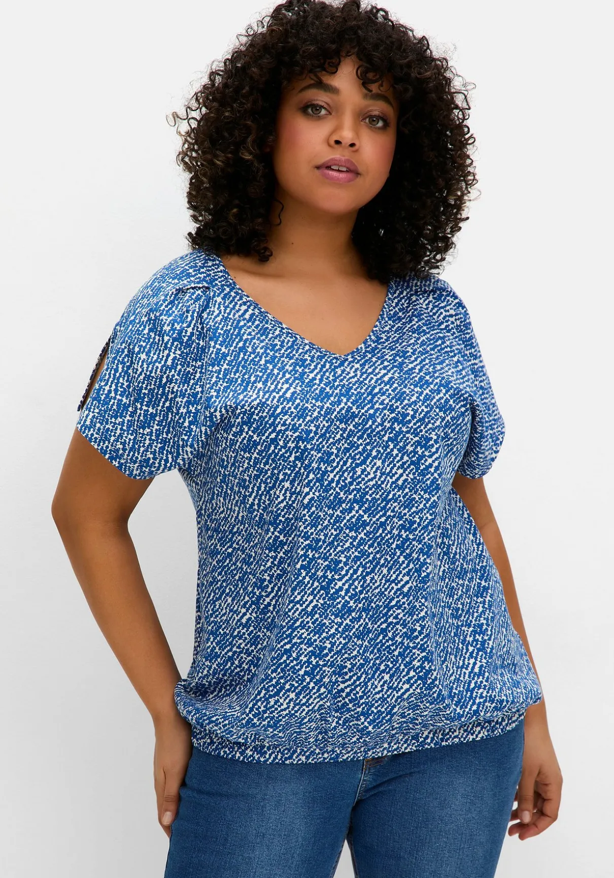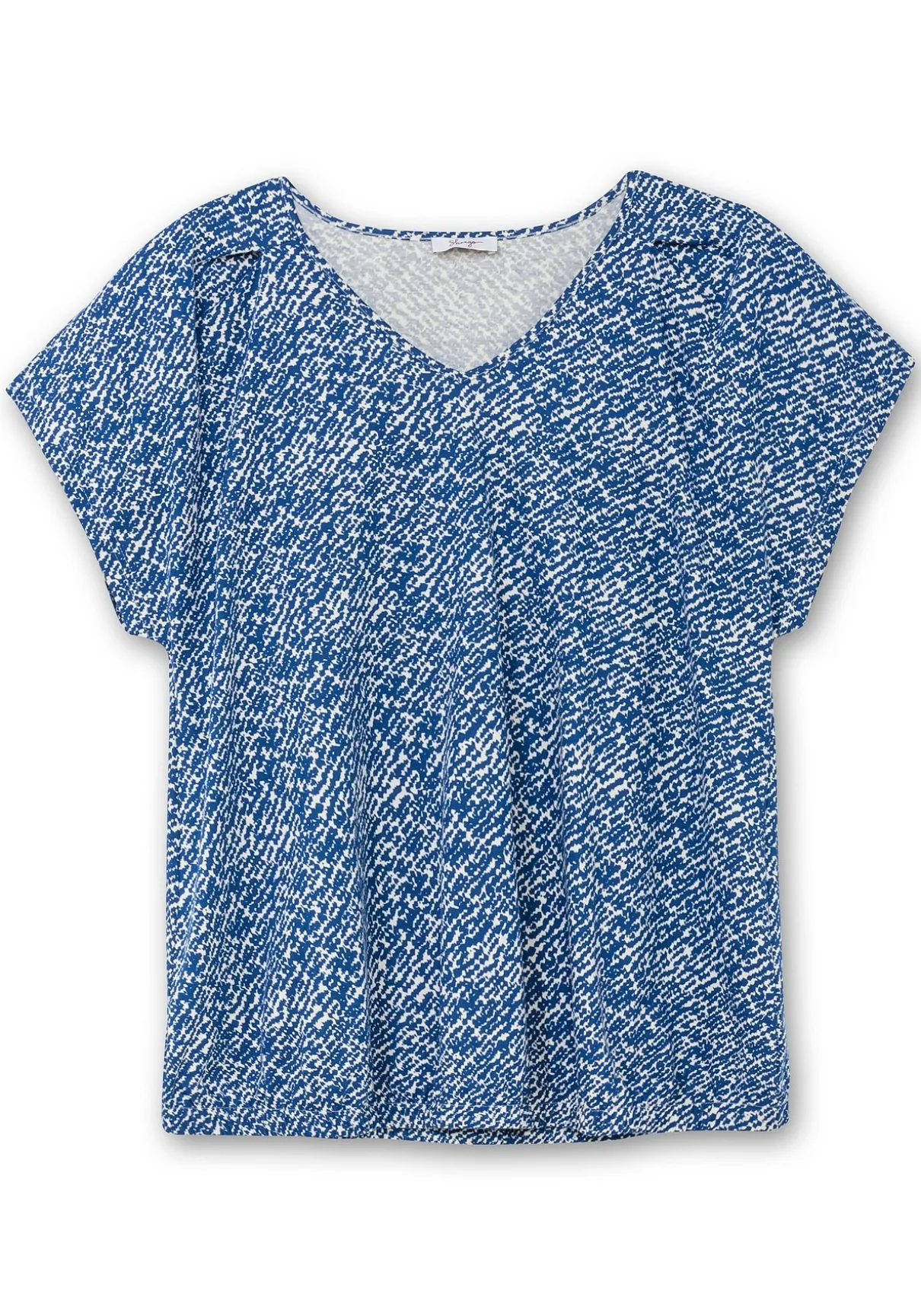 Shirt mit Alloverdruck. Die überschnittenen Ärmel sind auf den Schultern raffiniert geschlitzt, Kellerfalten seitlich am etwas tieferen V-Ausschnitt unterstreichen den femininen Look. Ein Gummizugbund fasst den lockeren Schnitt am Saum zusammen und gibt dem Shirt so mehr Weite im Bauchbereich.