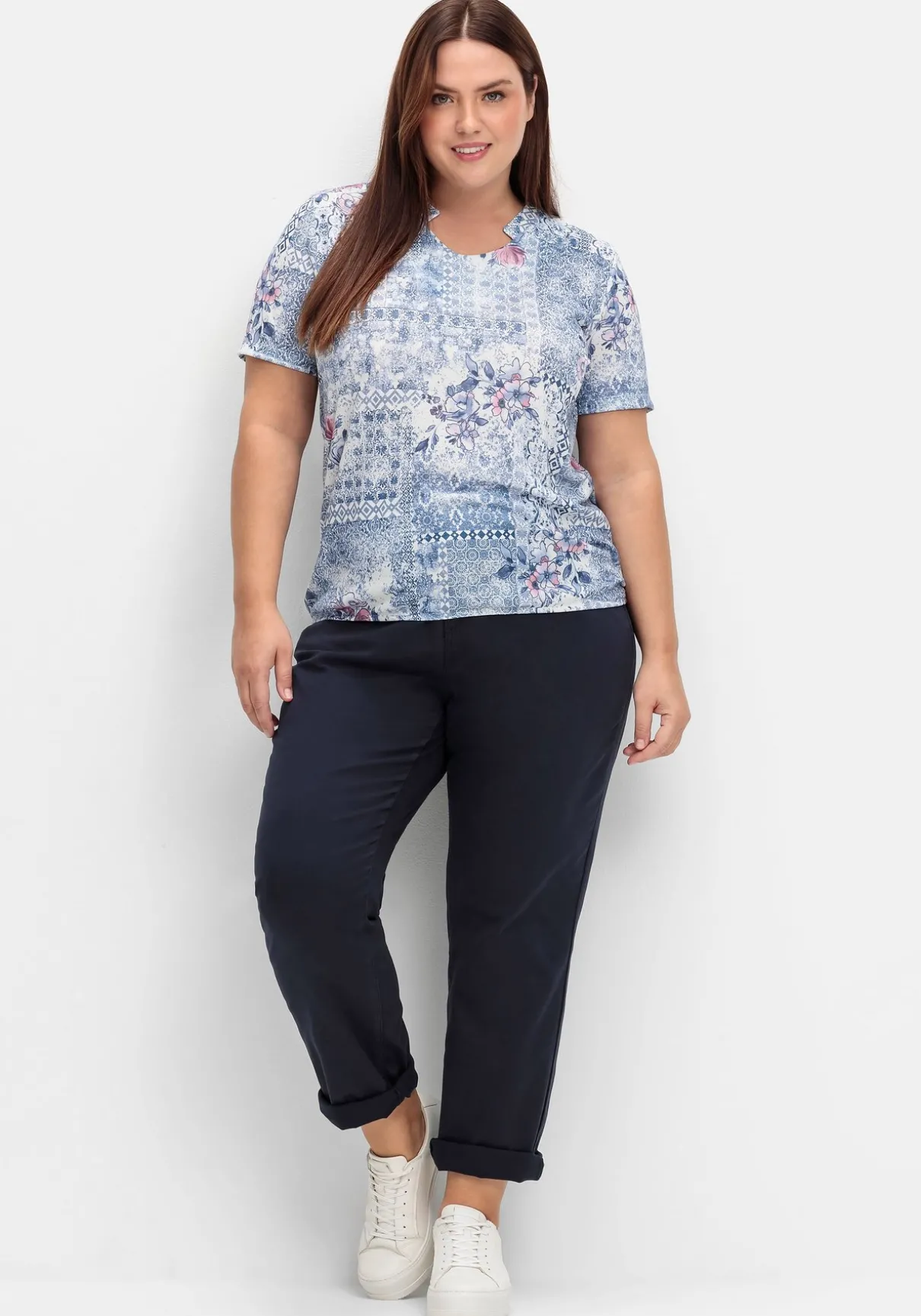 Das Shirt umspielt locker die Figur und endet in Hüftlänge.