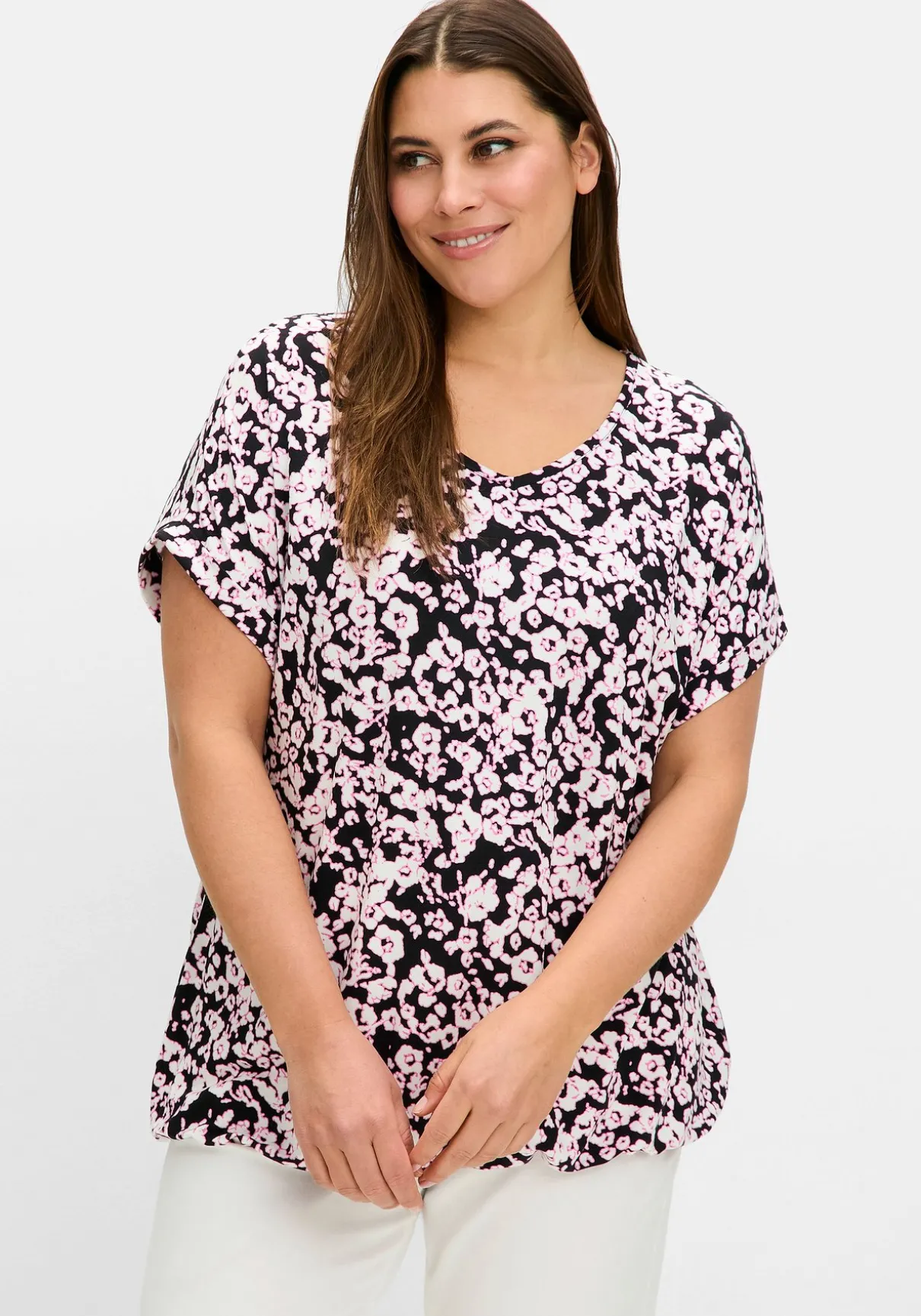 Shirt mit floralem Print. Zum filigranen Blumenmuster setzt der fixierte, unifarbene Ärmelaufschlag einen modischen Kontrast. Dazu kommen ein streckender V-Ausschnitt und leger überschnittene Schultern. Der Gummizugbund fasst den lockeren Schnitt am Saum zusammen und lässt rund um die Bauchpartie bequeme Weite entstehen.