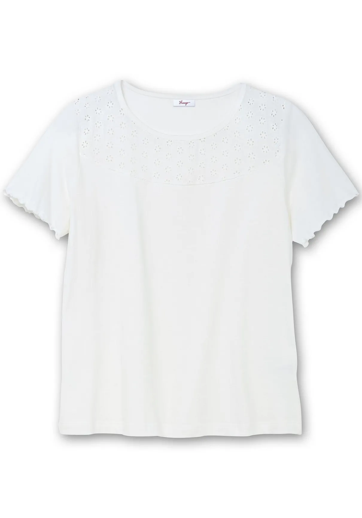 Shirt mit dekorativem Web-Einsatz vorn. Unterhalb des Rundhalsausschnitts sorgt ein Einsatz aus hübscher Lockstickerei für feminine Akzente. Babylock-Ziernähte an den Armelabschlüssen sind dazu eine verspielte Ergänzung.