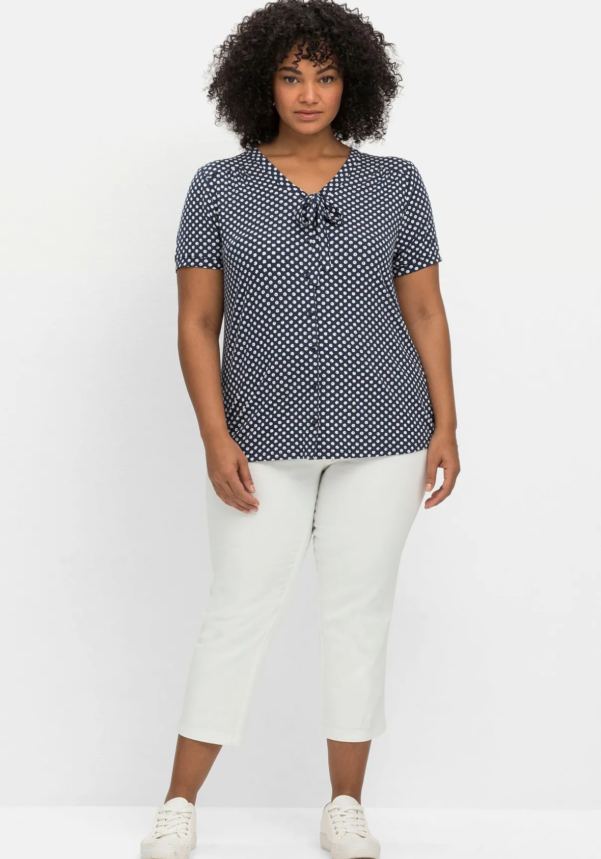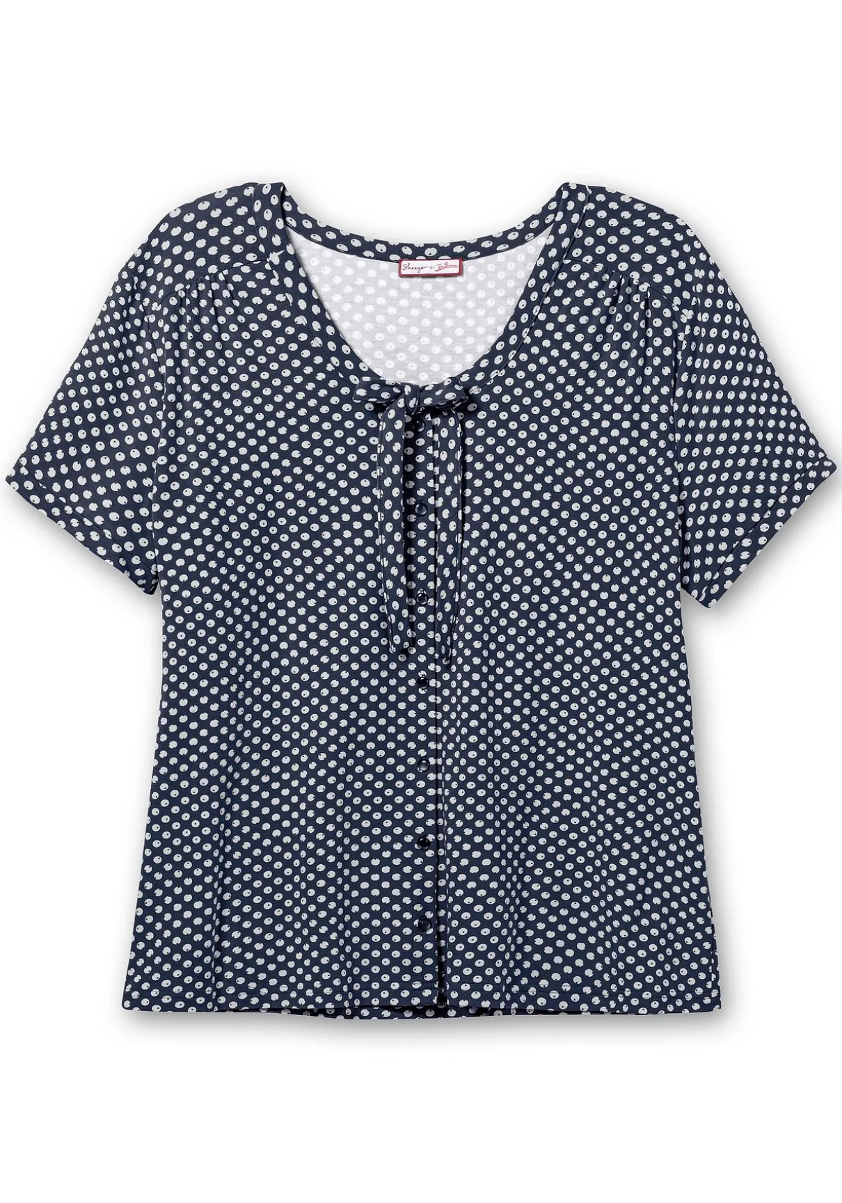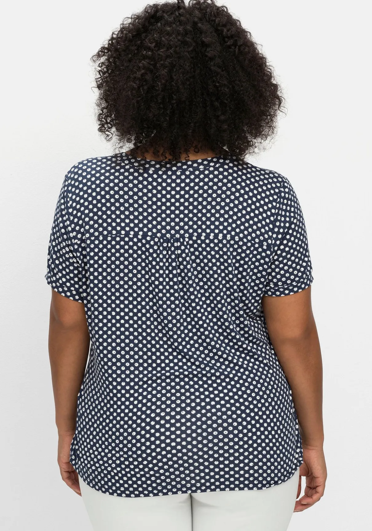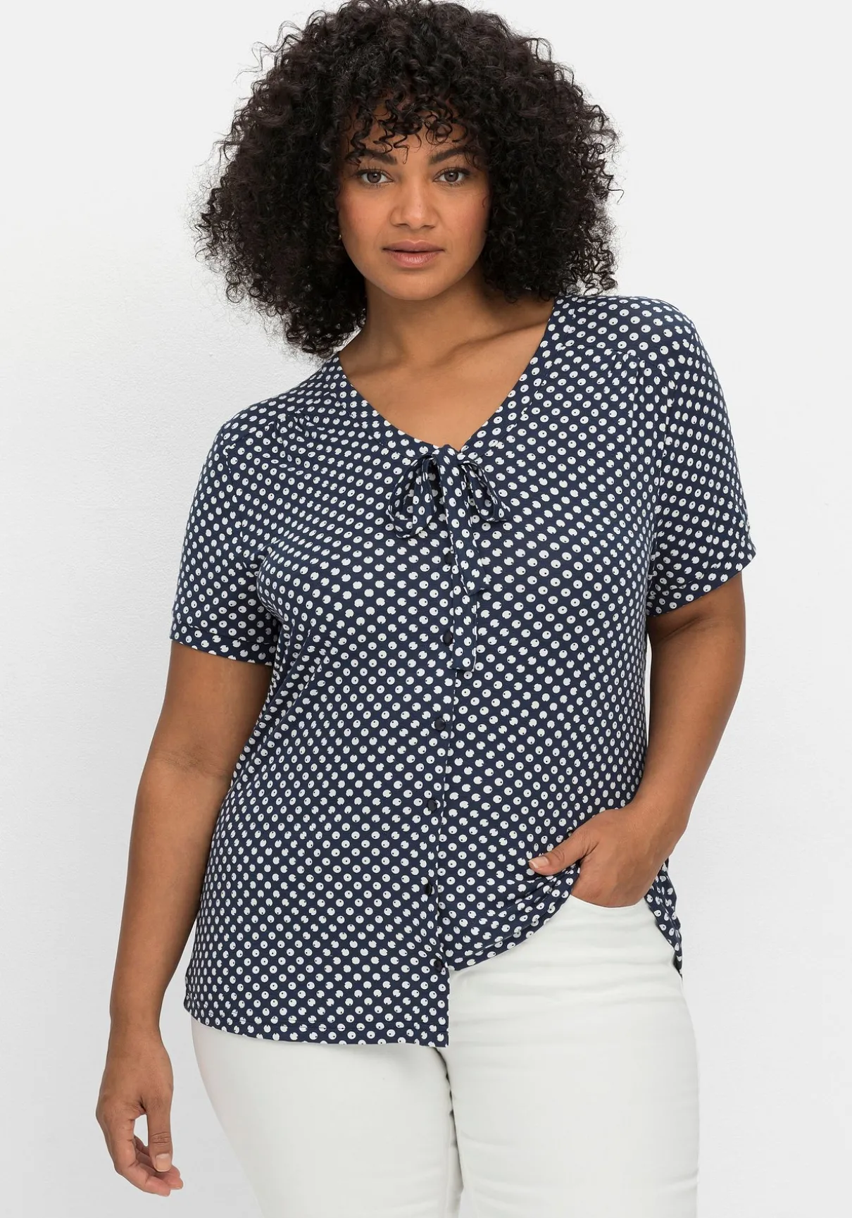Shirt mit Allover-Punktedruck von sheego by Joe Browns. Das charmante Muster wird durch das Bindeband am V-Ausschnitt feminin ergänzt. Auch die Kräuselung an der vorverlegten Schulternaht ist ein verspieltes Detail. Das Shirt ist mit kurzen Ärmeln und einer durchgehenden Knopfleiste gearbeitet. Im Rücken sorgt die Passe mit Falte für einen schönen Fall.