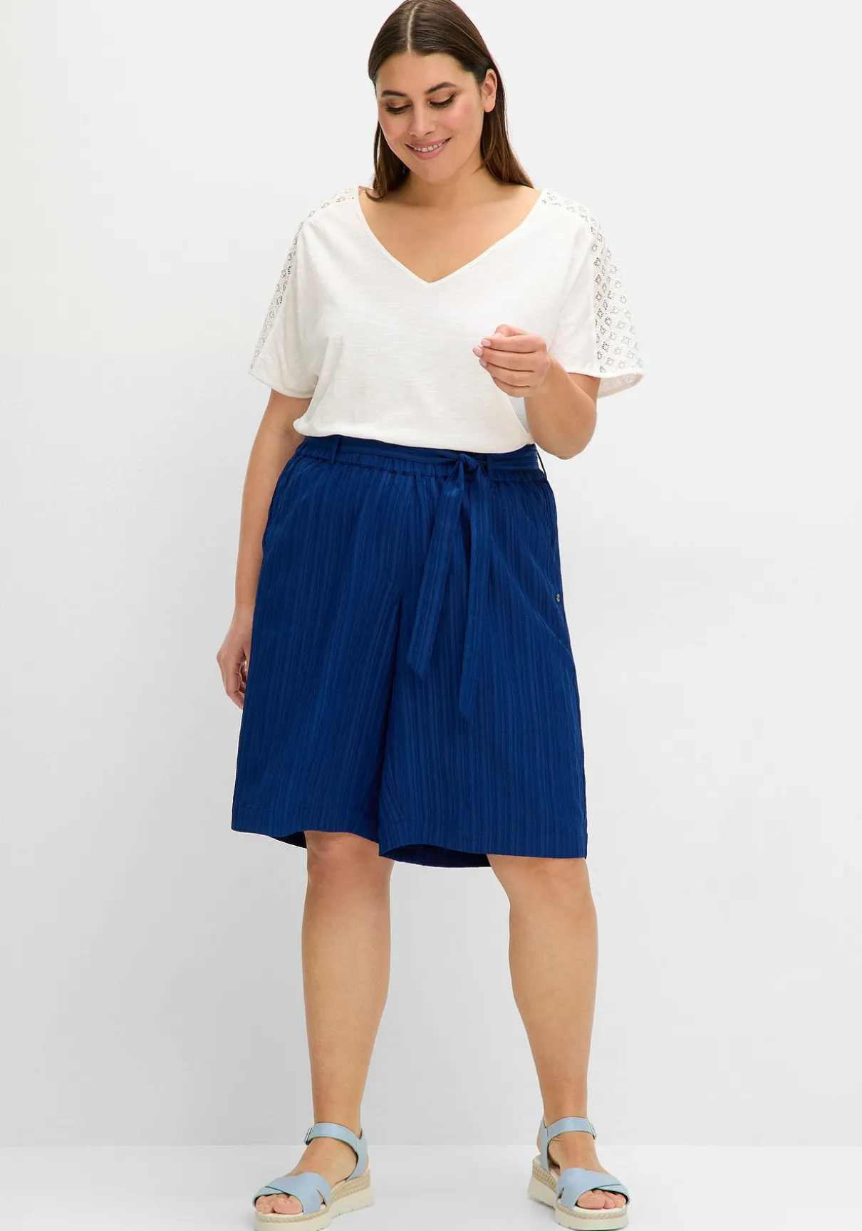 Shirt mit Spitzenbesatz. Der tiefe V-Ausschnitt und die überschnittenen Schultern verleihen dem Shirt eine lässige Optik. Ein besonderes Highlight ist die leicht transparente Spitze im Schulterbereich, die dem Design eine romantische Note verleiht. Der gerade Saumabschluss lässt eine klassische Silhouette entstehen, die unregelmäßige Struktur des Flammgarnjerseys sorgt für optische Effekte.