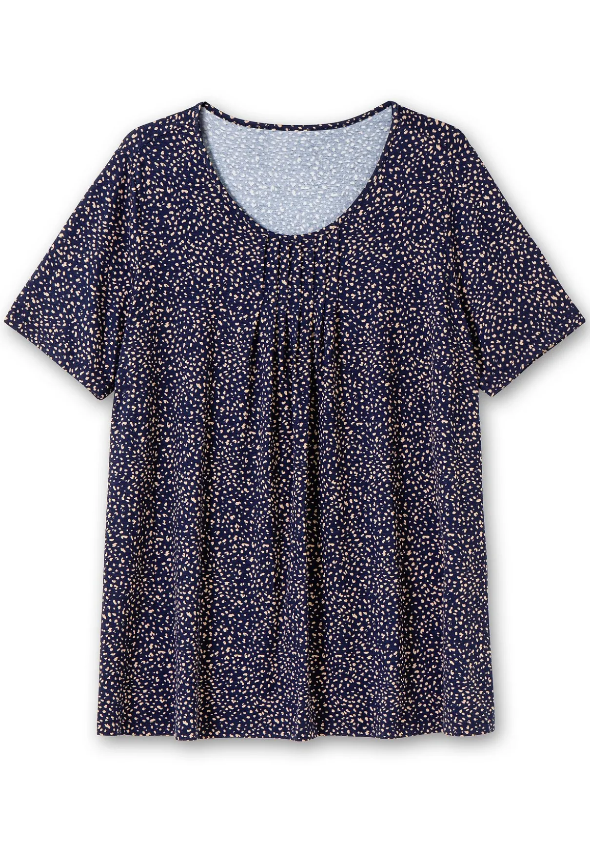 Shirt mit Rundhalsausschnitt. Die nach unten hin aufspringenden gelegten Falten geben bequeme Weite und sorgen gleichzeitig für eine feminine Optik. Besonders ansprechend präsentiert sich außerdem das Allover-Tupfenmuster.