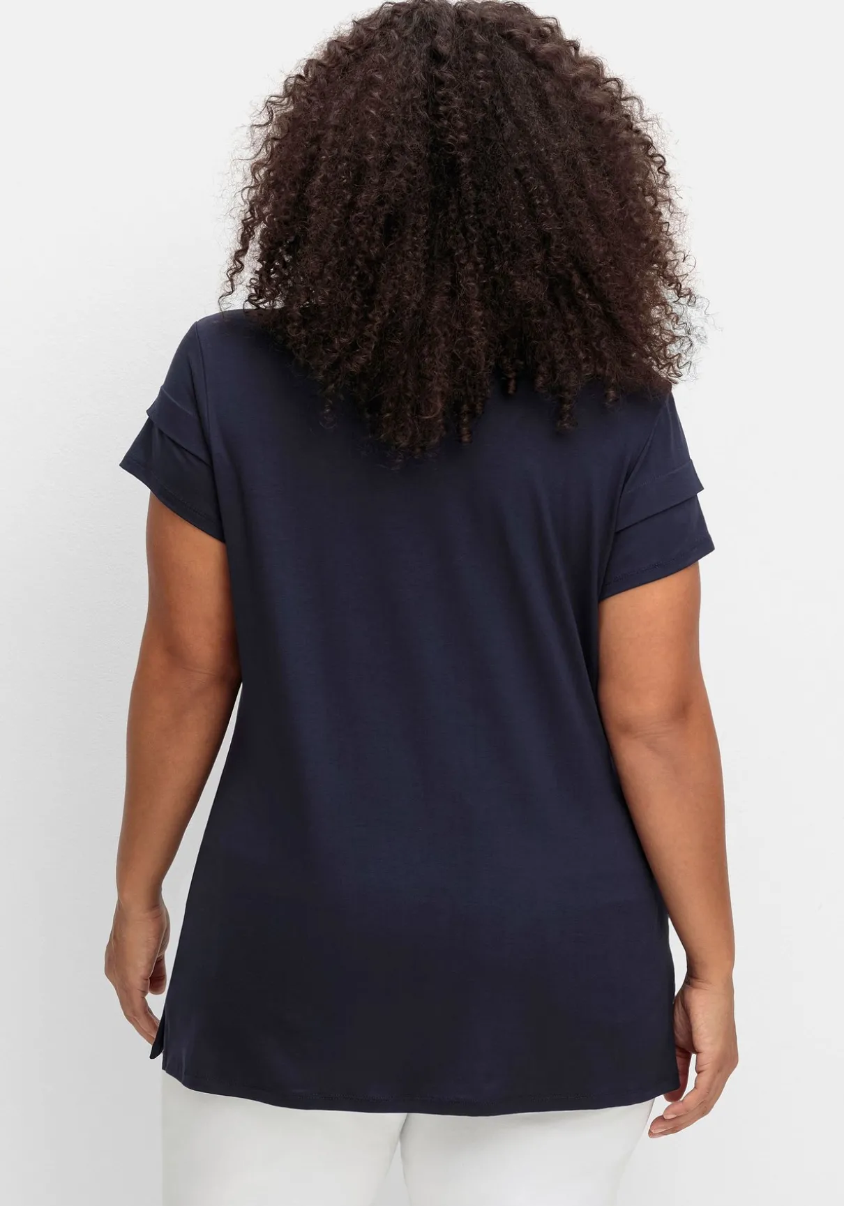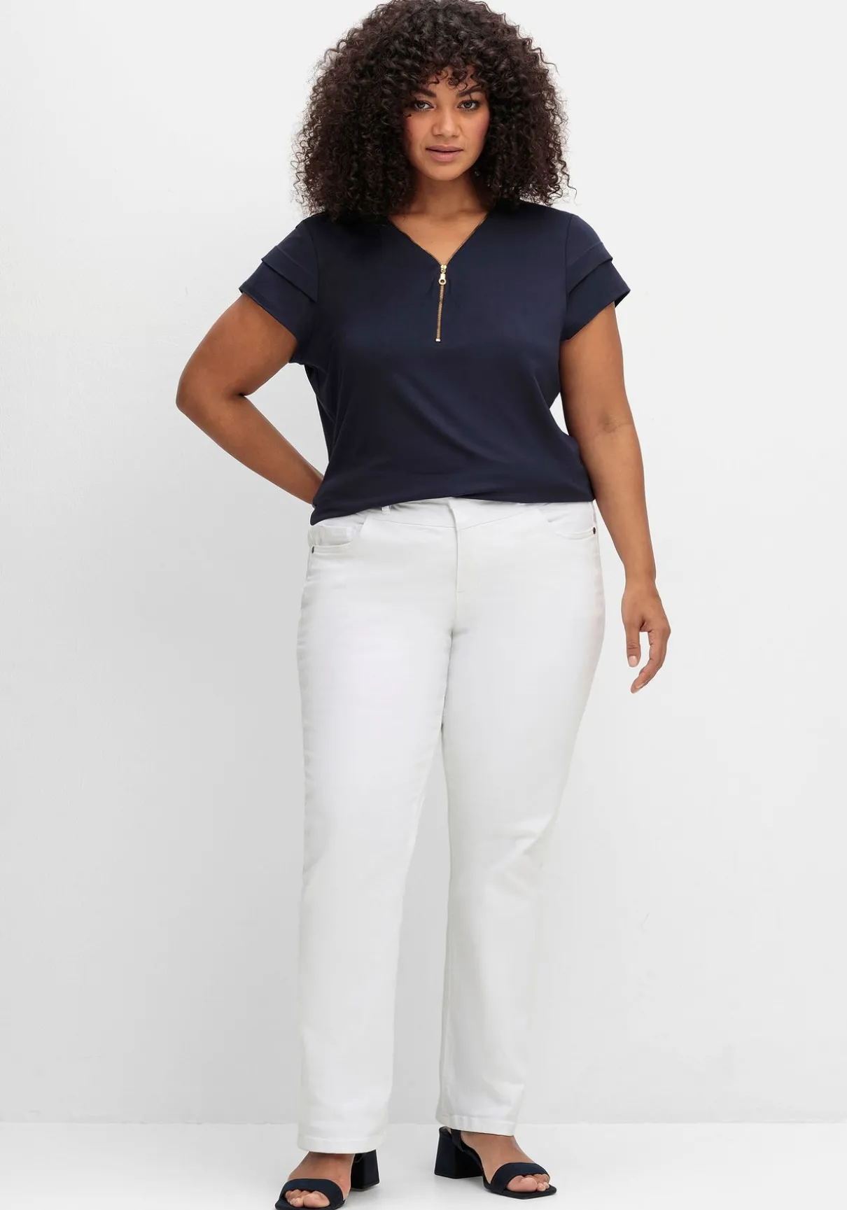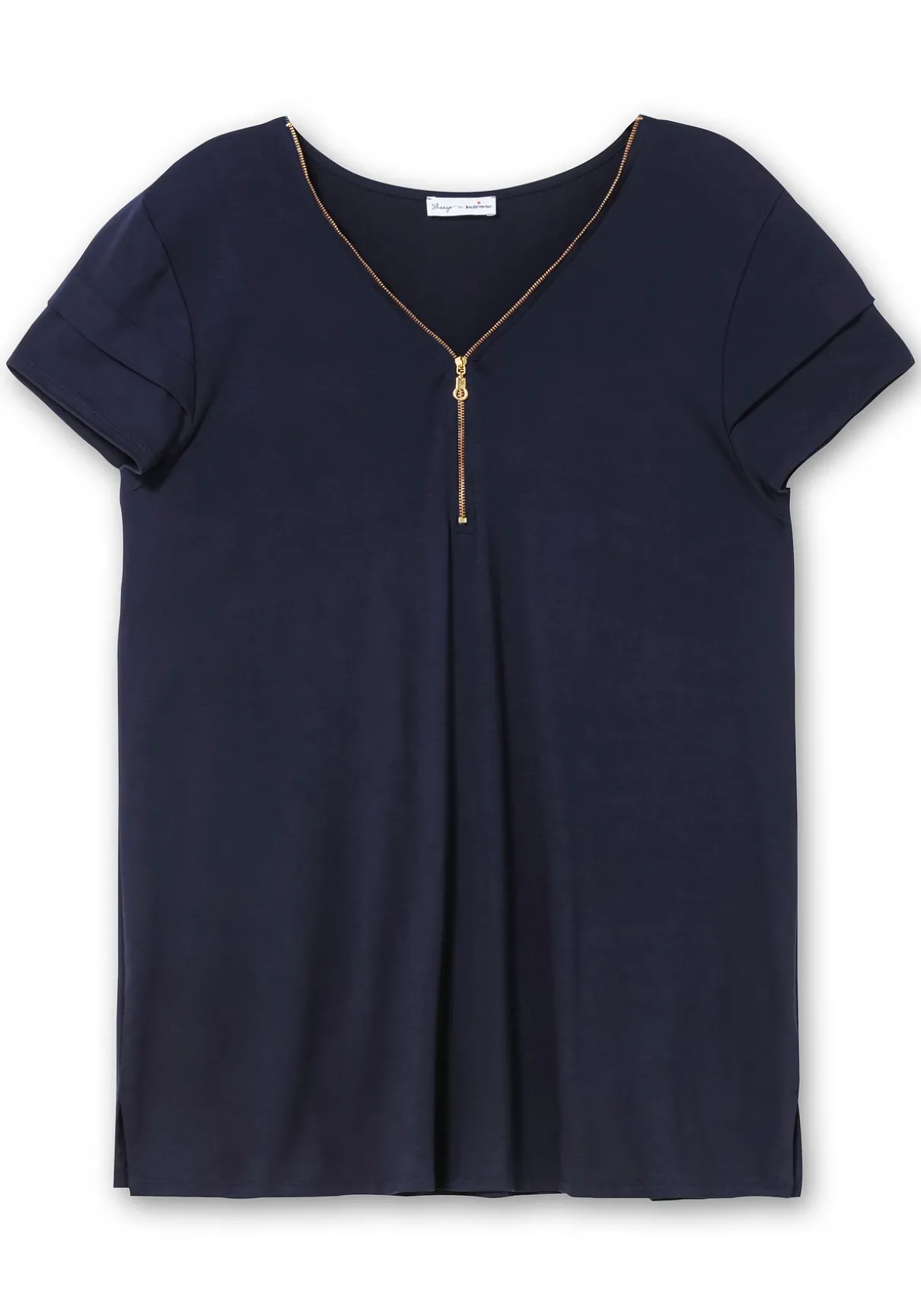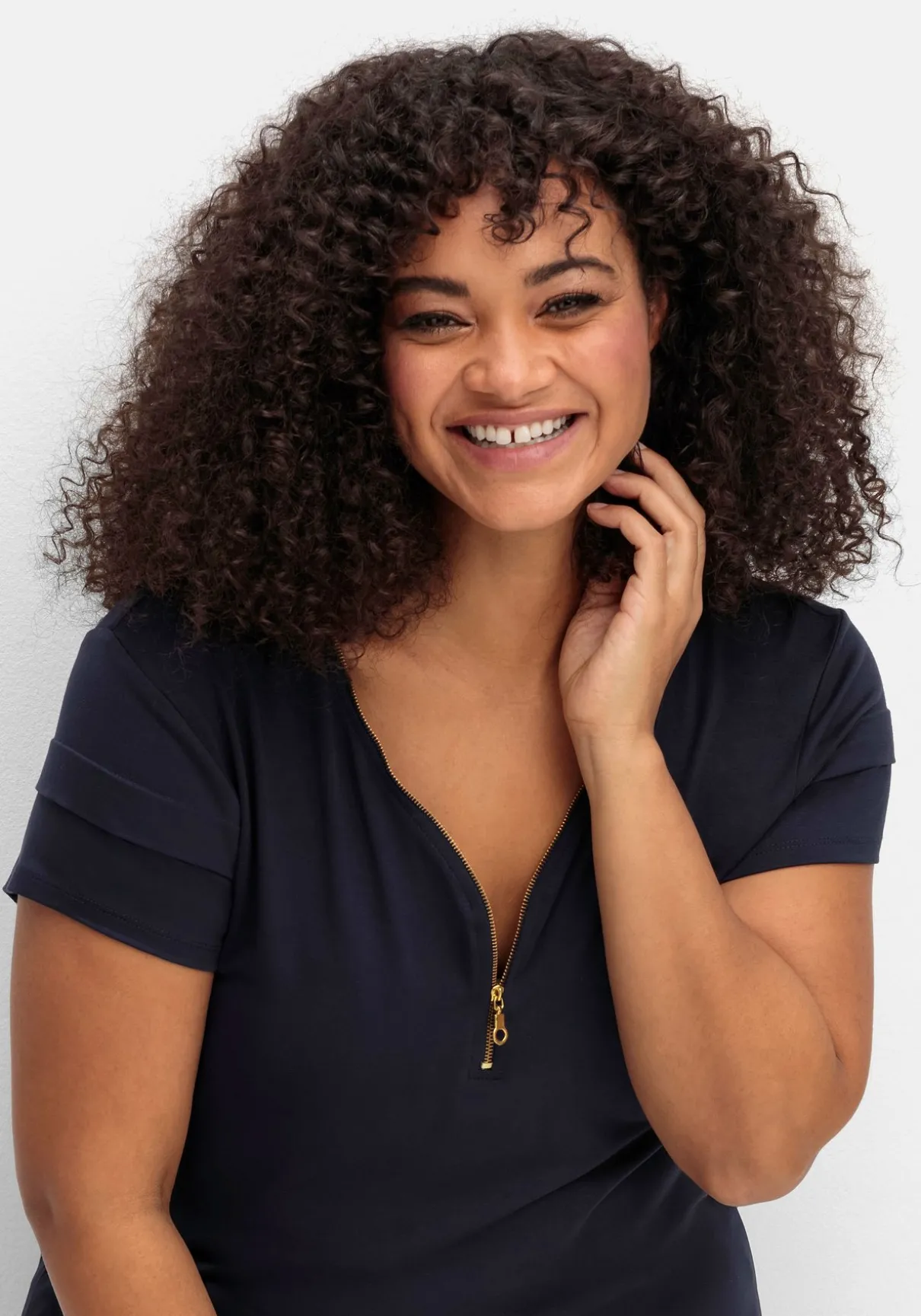 Shirt mit kurzem Arm von sheego by Joe Browns. Dekorativer Eyecatcher ist der goldfarbene Zipper, mit dem der tiefe V-Ausschnitt geschlossen werden kann. Auch die doppellagig gearbeiteten Ärmel verleihen dem Shirt ein modisches Upgrade.