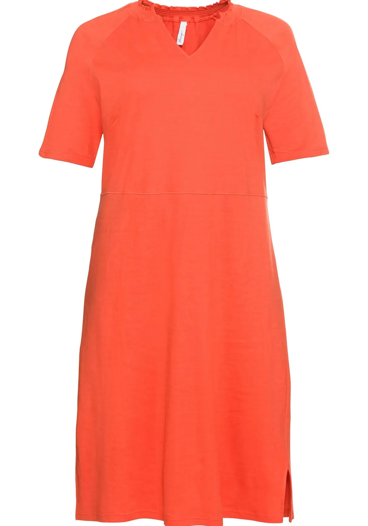 Shirtkleid in Midilänge. Femininer Eyecatcher ist der V-Ausschnitt, der durch den gesmokten Stehkragen zusätzlich betont wird. Das Kleid besitzt kurze Raglanärmel, eine Teilungsnaht auf Taillenhöhe unterbricht die Silhouette optisch. Seitenschlitze am Saum machen den bequemen Allday-Look perfekt.