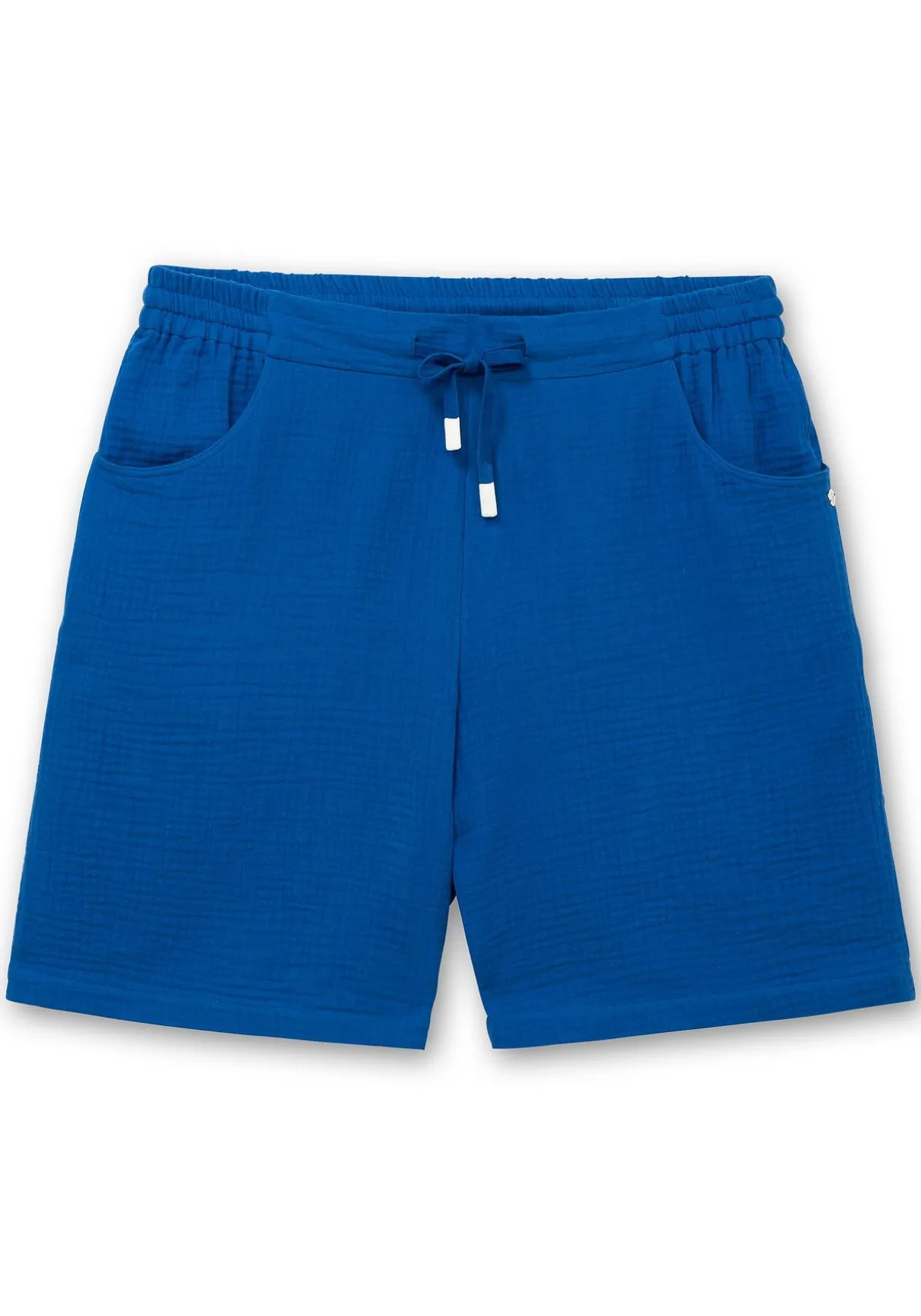 Bermudashorts aus Musselin. Das softe Material und der weite, bequeme Schnitt mit elastischem Schlupfbund machen die kurzen Hosen so tragekomfortabel. Ein Bindeband am Bund unterstreicht den sportlich-modischen Auftritt, seitliche Eingrifftaschen sind eine praktische Ergänzung.
