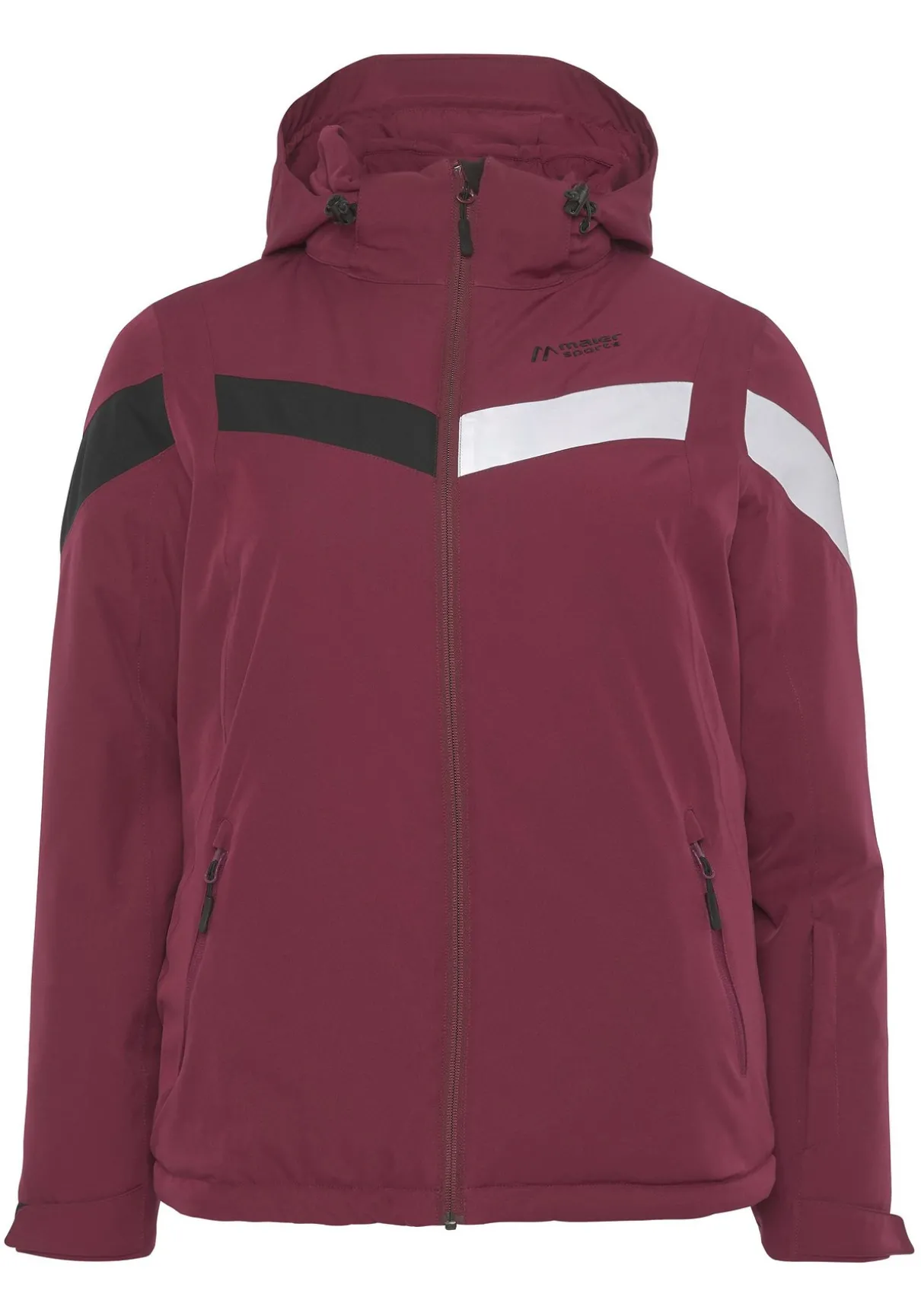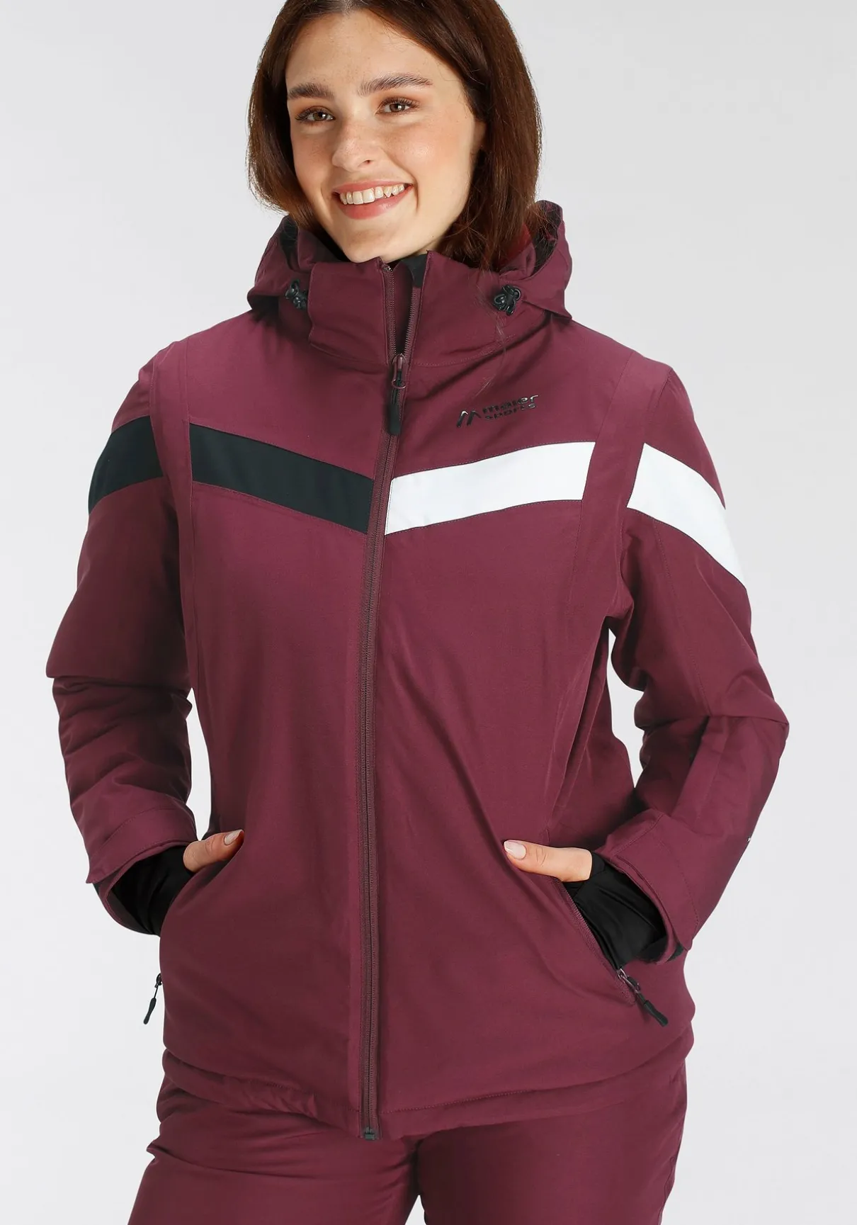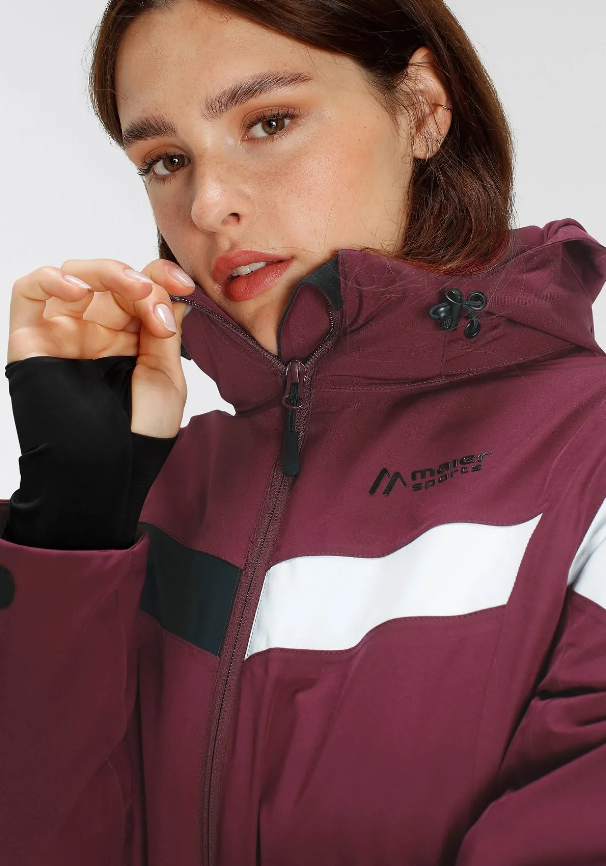 Skijacke von Maier Sports mit variierbarem Schneefang. Säume verstellbar. Abnehm- und verstellbare Kapuze. Nähte verschweißt. Reißverschlusstaschen vorn. Skipasstasche. Leicht taillierte Passform. Wasser- und winddichte sowie atmungsaktive Qualität.