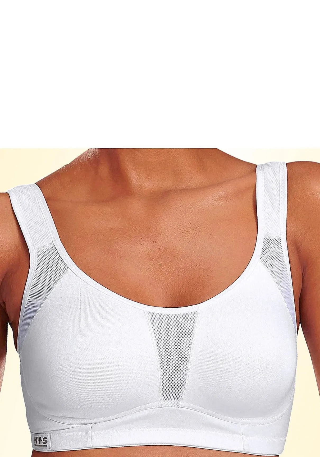 Dieser Bestseller Sport-BH von H.I.S. überzeugt mit sportivem Look mit kontrastfarbenen Einsätzen und hoher Funktionalität. Nahtlos vorgeformte, unwattierte Cups umschließen fest die Büste und sorgen für ein stabiles Gefühl. Breite, gefütterte Träger bieten den nötigen Halt bis in große Cupgrößen und schnüren nicht ein. Hiermit kann jede Frau gelassen in ein Training mit hoher Belastung starten: dieser BH ohne Bügel ist ein perfekter Begleiter für alle Sportarten mit viel Bewegung, wie z.B. Joggen oder Ballsport. Das hochwertige »Coolmax«-Material hält die Haut optimal trocken, da Feuchtigkeit schnell abtransportiert wird und eine gute Atmungsaktivität gewährleistet ist. Die Träger und der Rücken lassen sich einfach verstellen. Schnell bestellen und ab zum Sport! Klassische Dessous. Bequeme Alltags-Dessous. Modische Dessous. Der Sport-BH ist aus 90% Polyester (COOLMAX®), 10% Elasthan. BHs sind nicht trocknergeeignet, da die Versteller und Ringe durch die Hitze beschädigt werden und brechen.