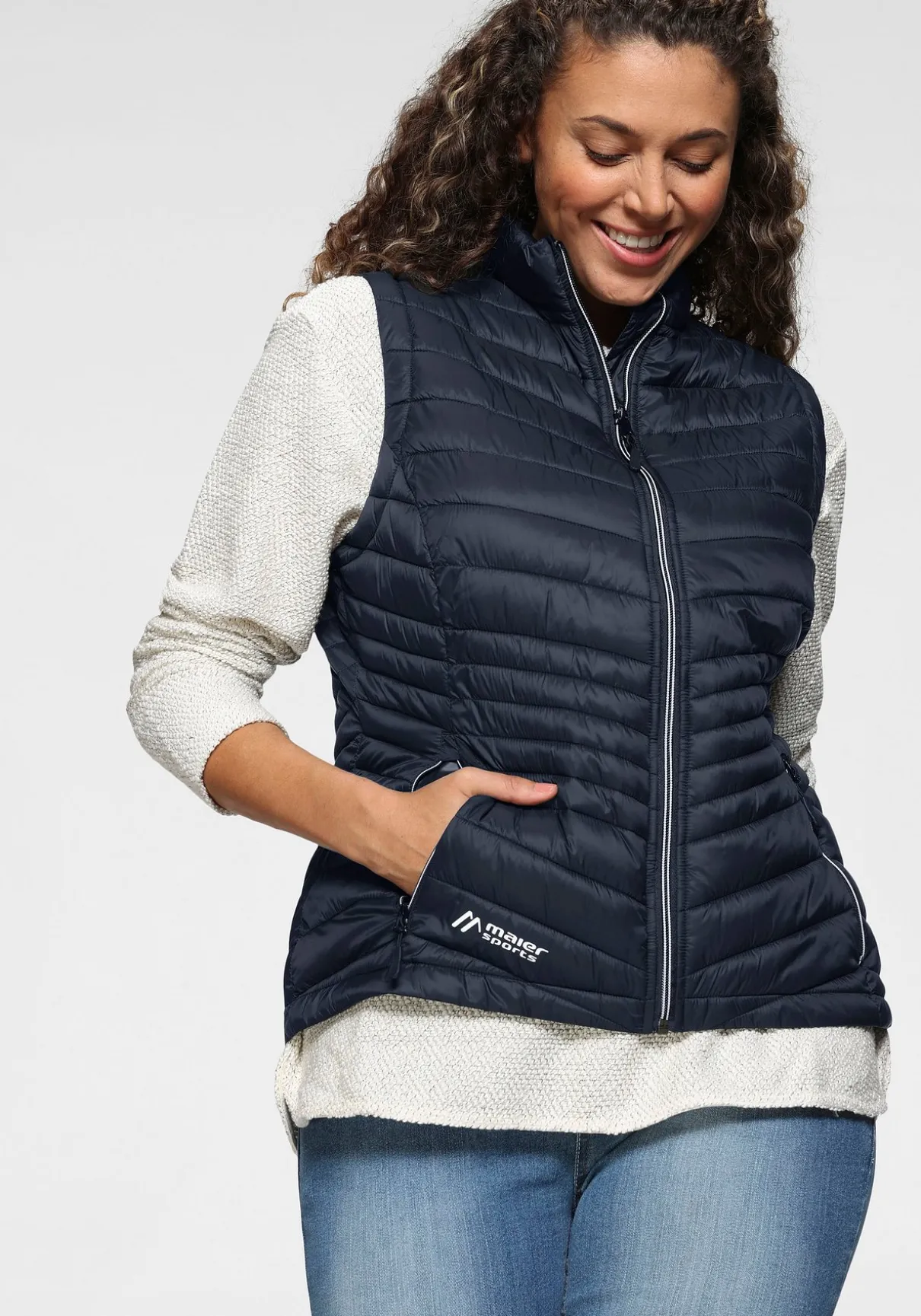 Steppweste von Maier Sports mit hoch abschließendem Kragen. Labelprint vorn. Reißverschlüsse zweifarbig. Zwei Reißverschlusstaschen. Tunnelzug im Saum. Kinnschutz. Taillierte Passform. Wattierte, wasserabweisende, winddichte und atmungsaktive Qualität.