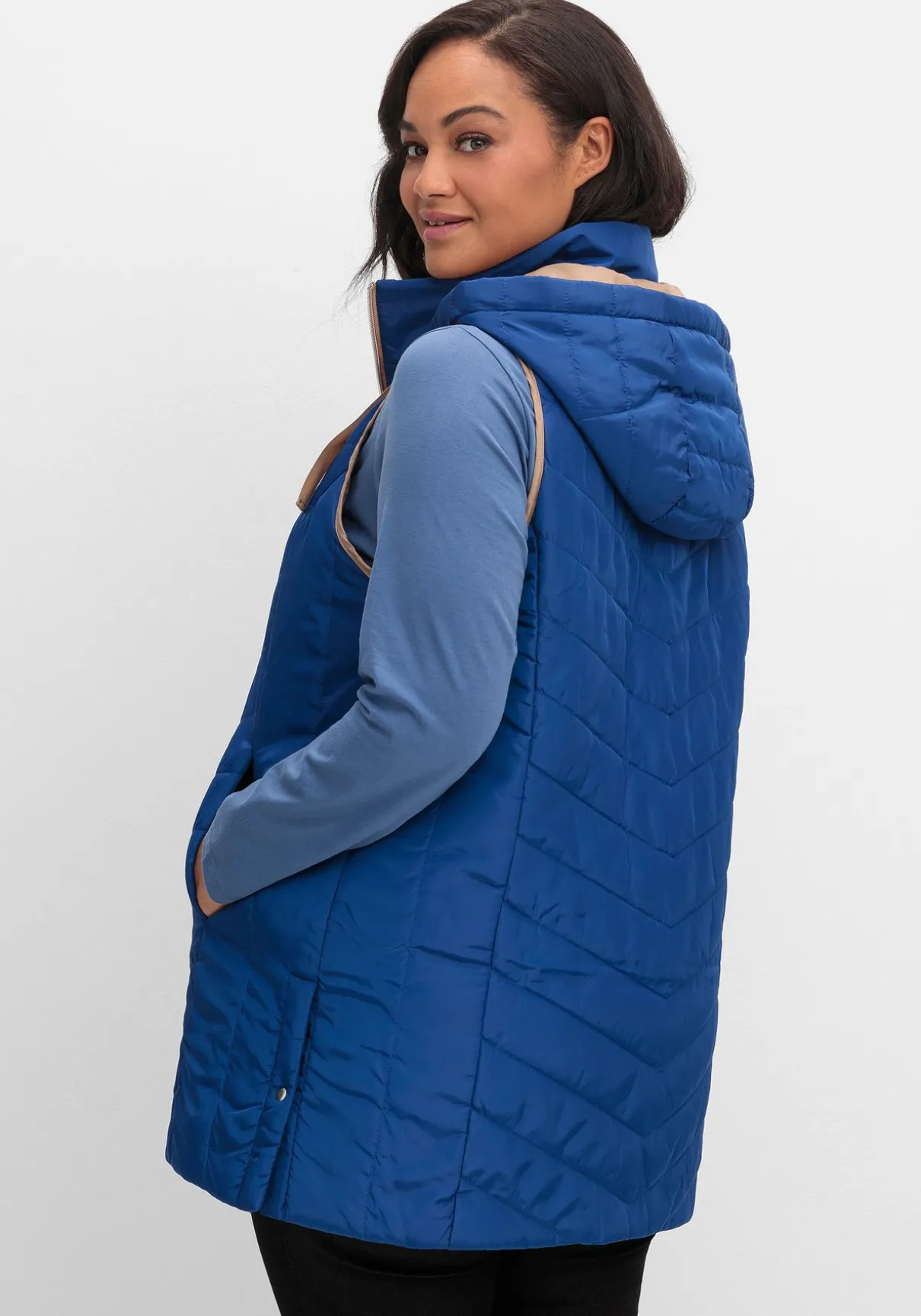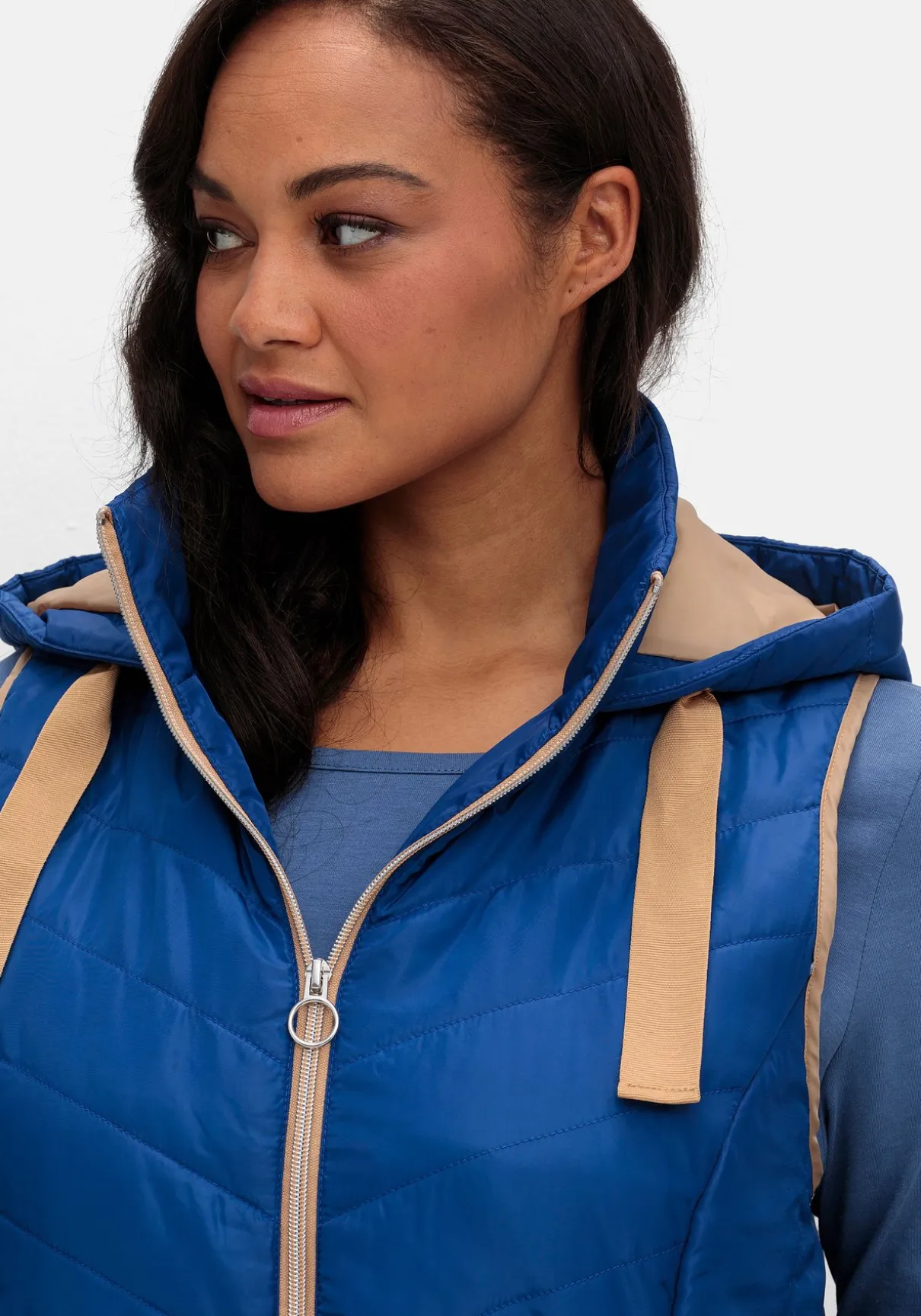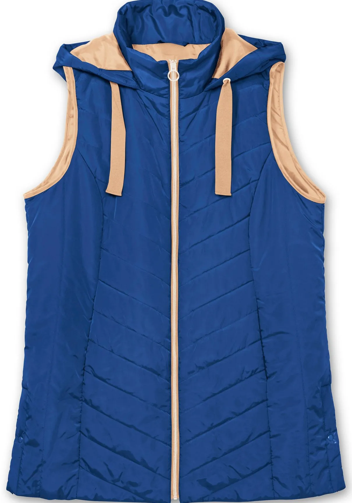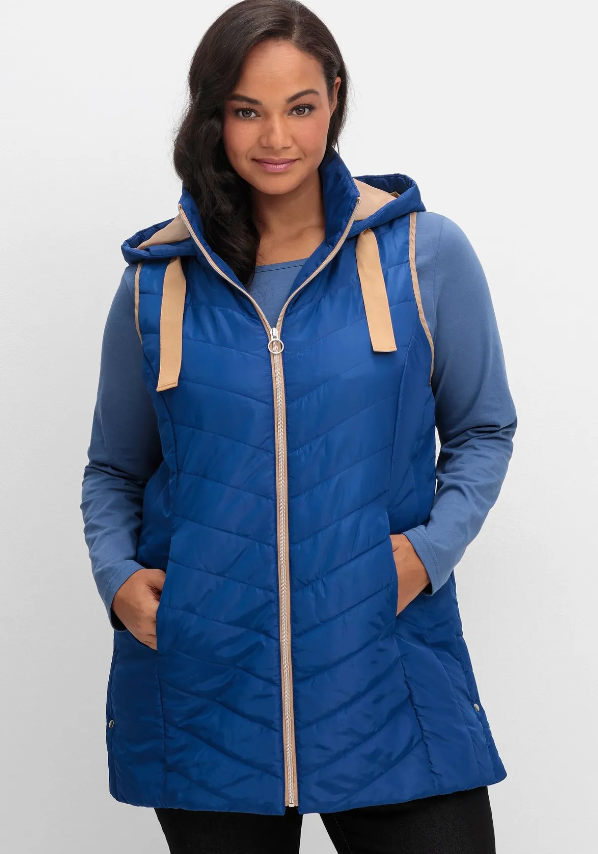 Steppweste mit Kapuze. Kontrastfarbene Details sorgen hier für den modischen Twist: So fällt das breite Band an der Kapuze genauso ins Auge wie das kontrastfarbene Innenfutter oder der farblich abgesetzte Ärmelausschnitt. Die mittige Steppung wird durch glatte seitliche Partien ergänzt und streckt so geschickt die Figur. Für noch mehr Tragekomfort sorgen die Seitenschlitze mit Druckknöpfen. Praktisch ist der Reißverschluss bis zum Stehkragen, zwei Eingrifftaschen ergänzen den Look.