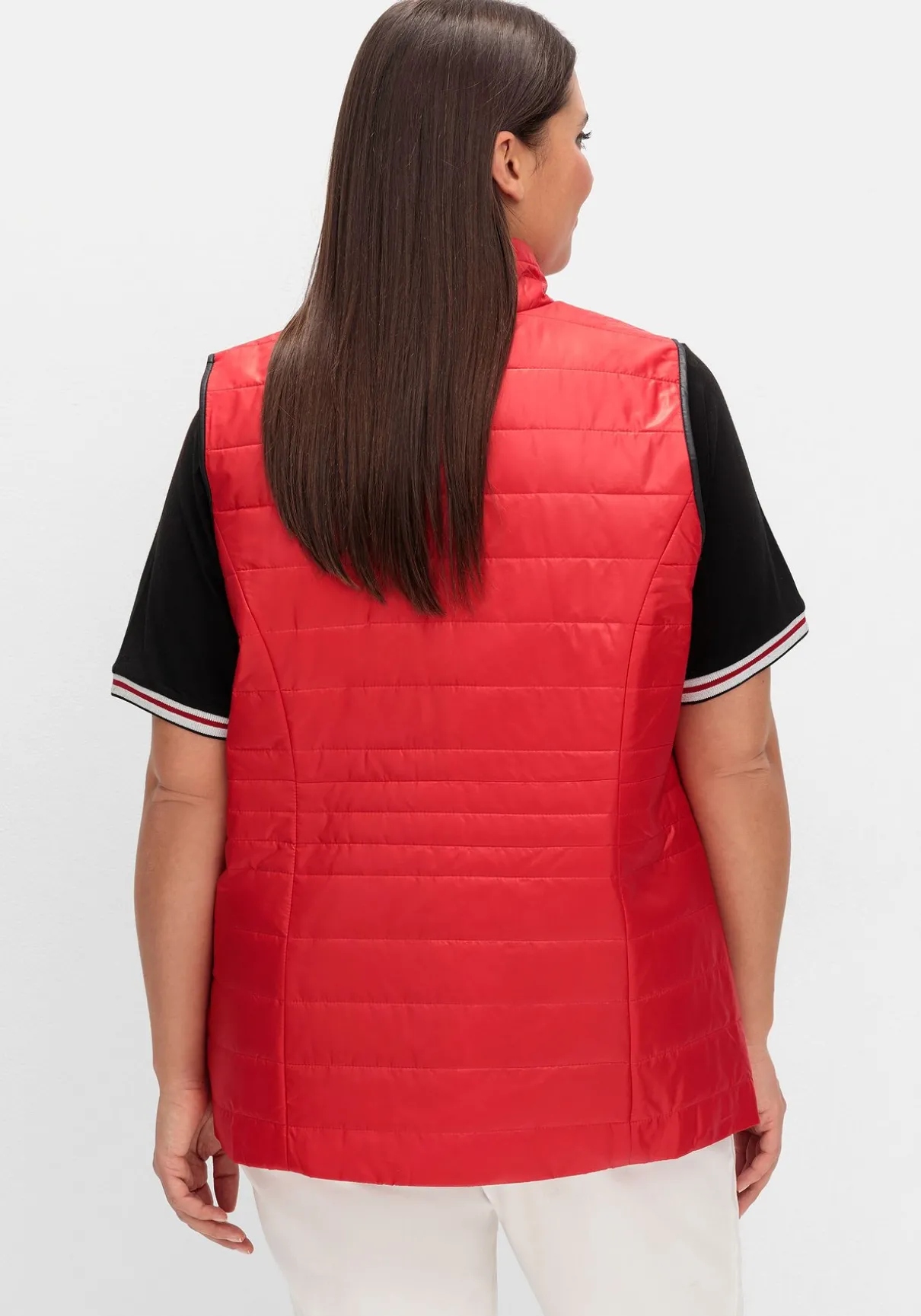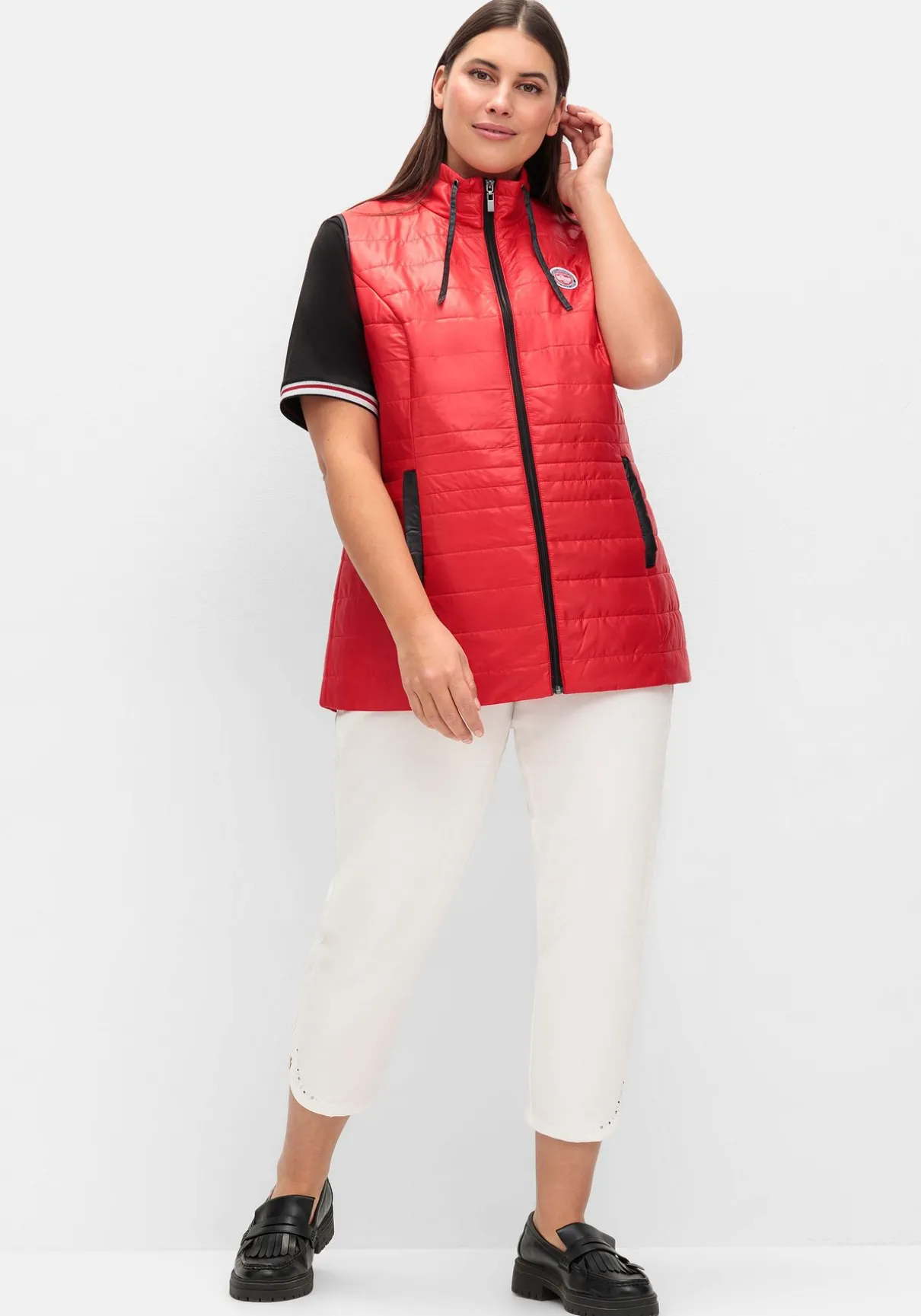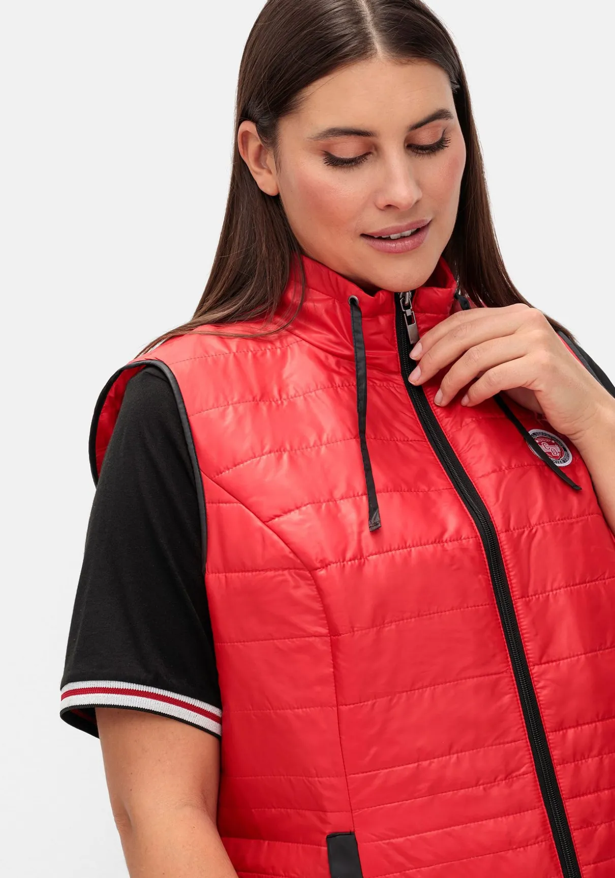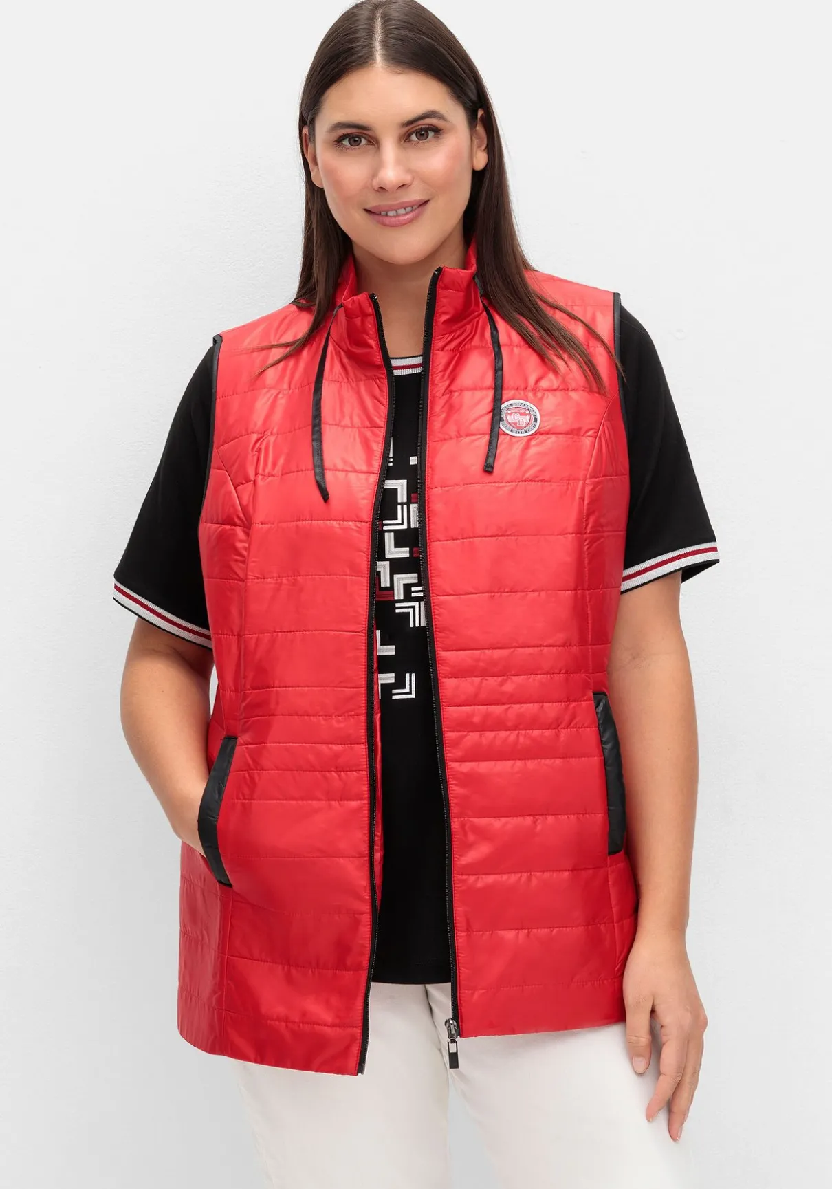Steppweste mit leichter Wattierung. Kontrastfarbene Elemente wie die Bindebändchen am Stehkragen, der durchgehende Reißverschluss, die vertikalen Leistentaschen und die paspelierten Armausschnitte lockern den schlichten Look modisch auf. Ein kleiner Aufnäher auf Brusthöhe setzt dazu einen dekorativen Akzent, während die trendige Steppung der Figur schmeichelt.