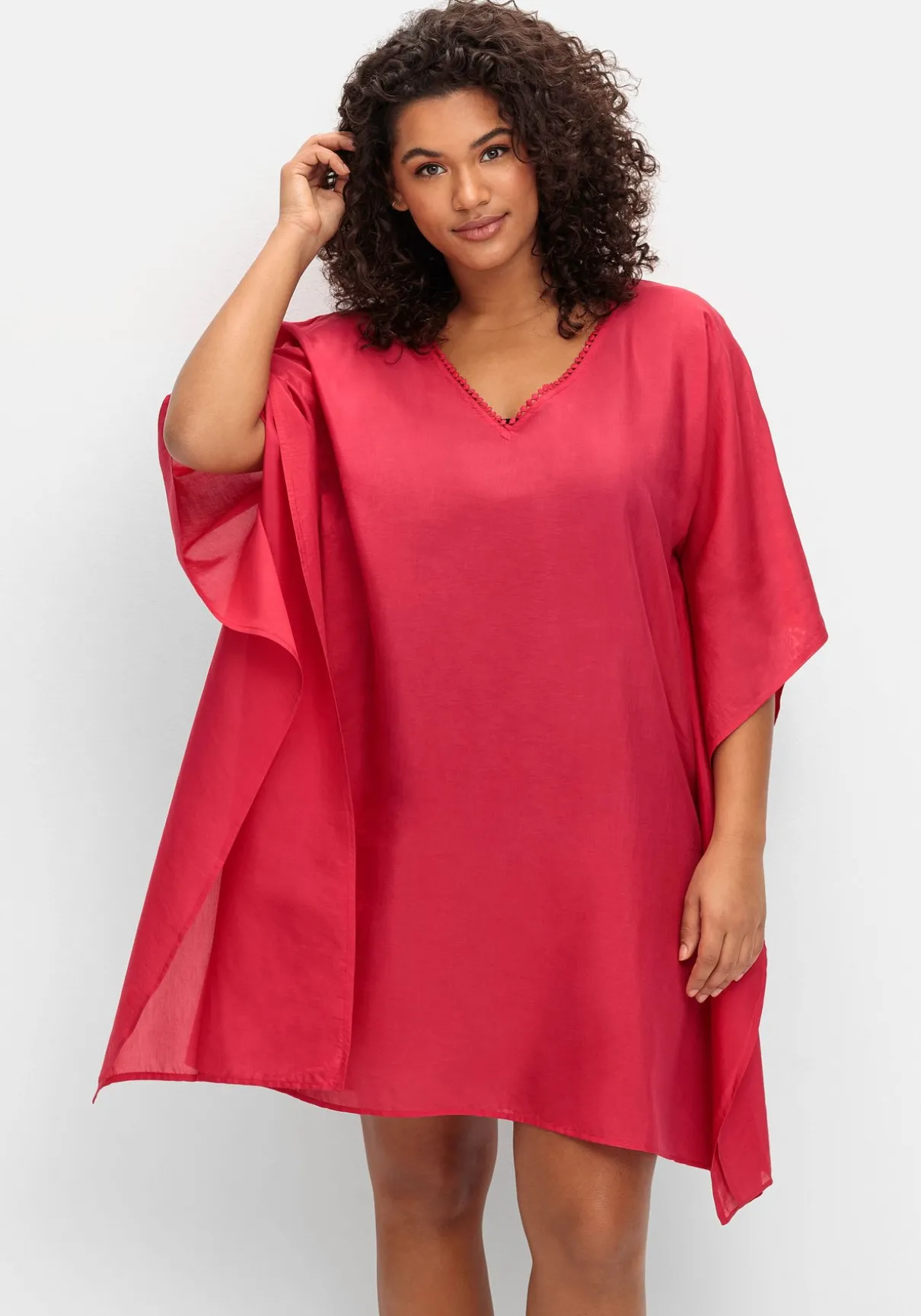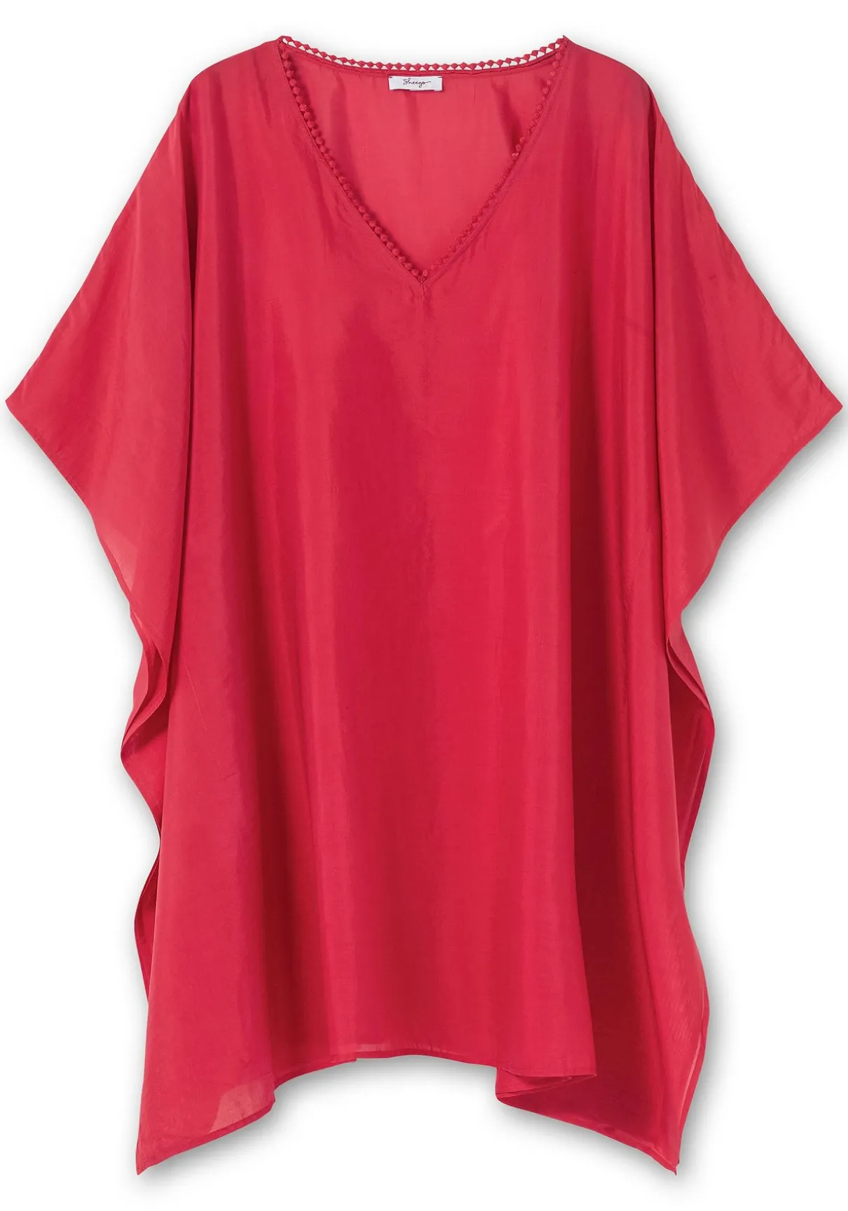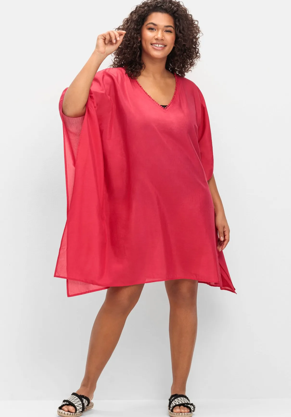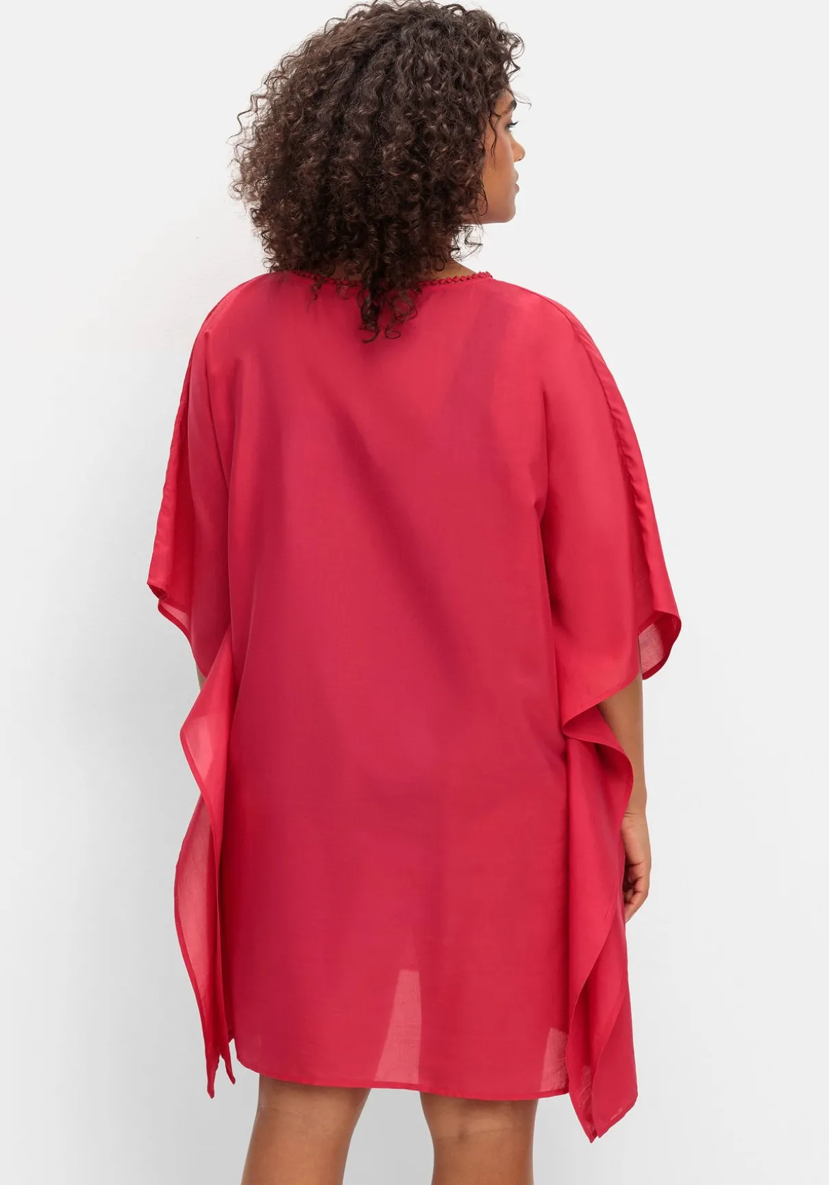 Strandtunika in leichter, transparenter Webqualität. Der lässige Poncho-Schnitt zeigt sich mit streckendem V-Ausschnitt und verspielter Zierborte. Ein zipfelig geschnittener Saum rundet den Style modisch ab. Ideal, um die Tunika schnell über die Badekleidung zu werfen!