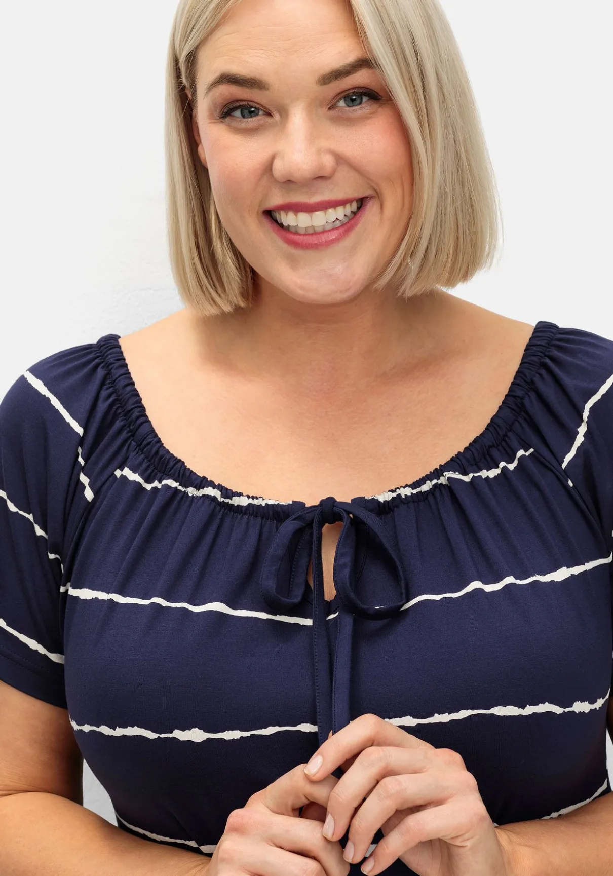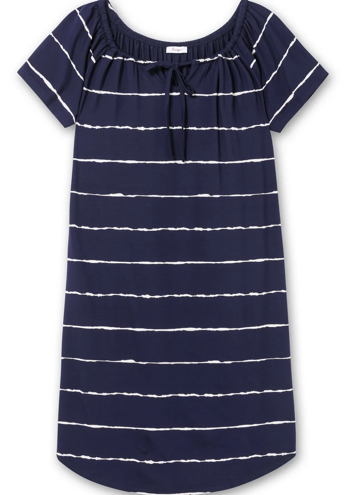 Gestreiftes Kleid mit maritimem Charme und femininen Details. Der weite, verstellbare Carmenausschnitt mit Bindeband bietet individuelle Styling-Optionen, während der gerundete Saum mit seitlichen Schlitzen für Lässigkeit sorgt. Ein vielseitiger Style, ideal für Sommer, Strand und Urlaubskoffer.