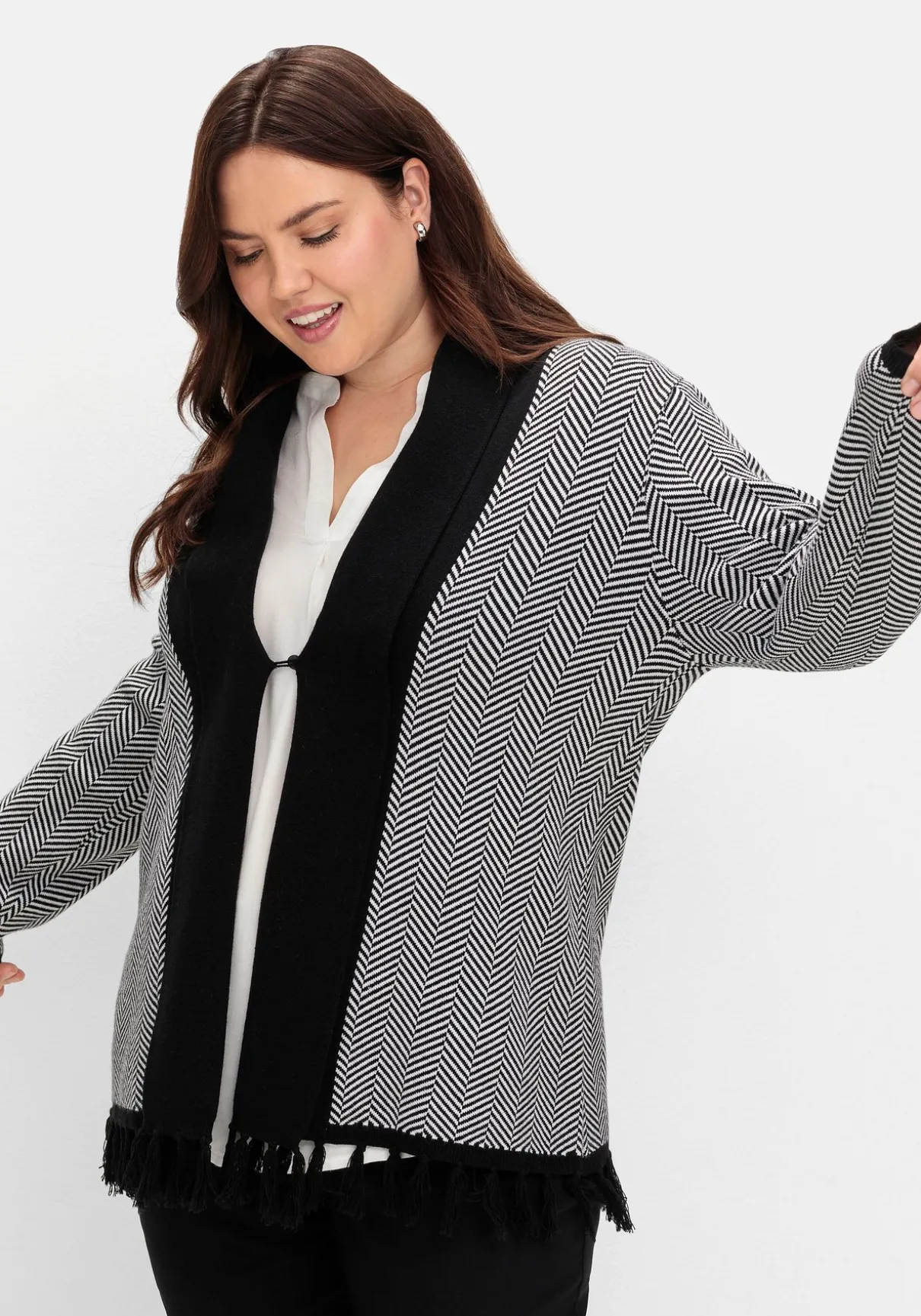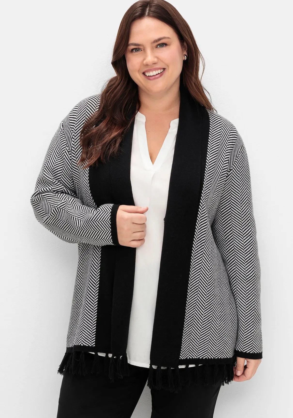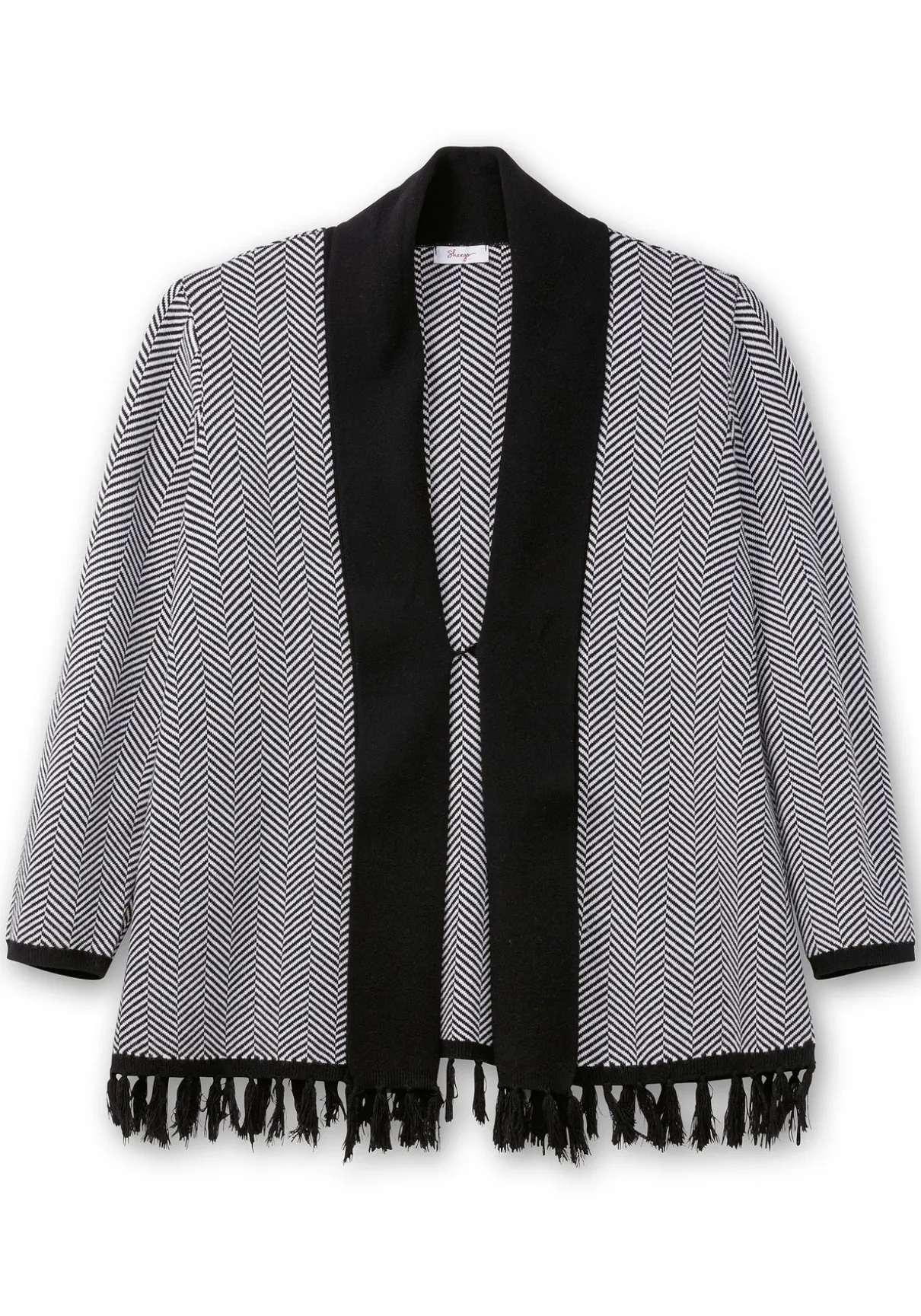 Strickjacke im gestrickten Fischgrätmuster. Zum klassischen Muster setzt der breite Schalkragen einen modischen Kontrast. Auch der Ärmelabschluss ist farblich abgesetzt, verspieltes Finish sind die Fransen am Saum.